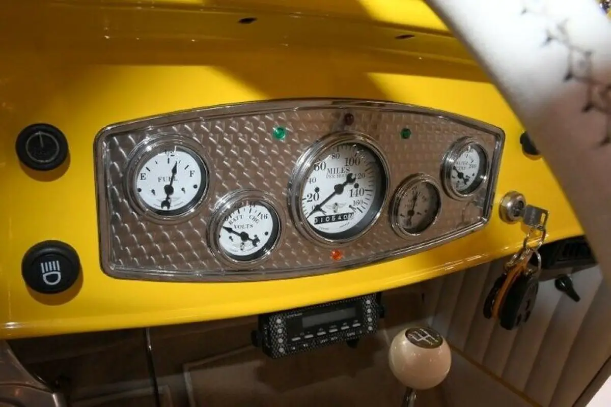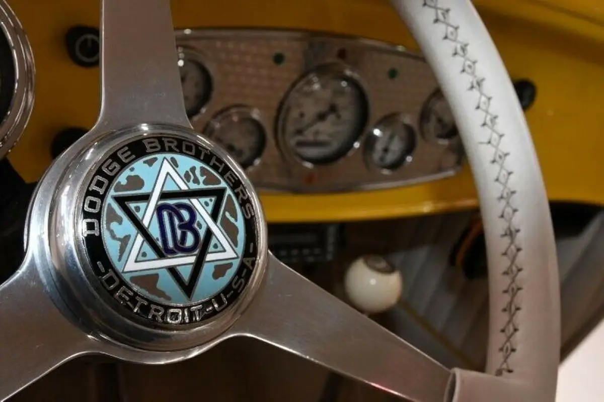 INTERIOR: The inside was completely reupholstered traditional style with yellow piping. The seat was completely rebuilt, recushioned and reupholstered. The door panels were upholstered to match. The cab is upholstered behind the seats and has map pockets. It has a white perforated headliner. It has Juliano's seat belts with retractable shoulder belts. It has a vintage instrument panel with machine turn trim and a complete set of white face Stewart Warner gauges. It has a matching column mount tachometer. It also features a leather wrapped steering wheel with a Dodge Brothers horn button on a polished Flaming River column. It has power windows, power locks and even variable speed wipers. It has a Custom Auto Sound stereo with remote. Modern Vintage Air a/c and heat system. The carpets and floor mats have bound edges. There's a Hurst 4-speed on the floor and a functional emergency brake.