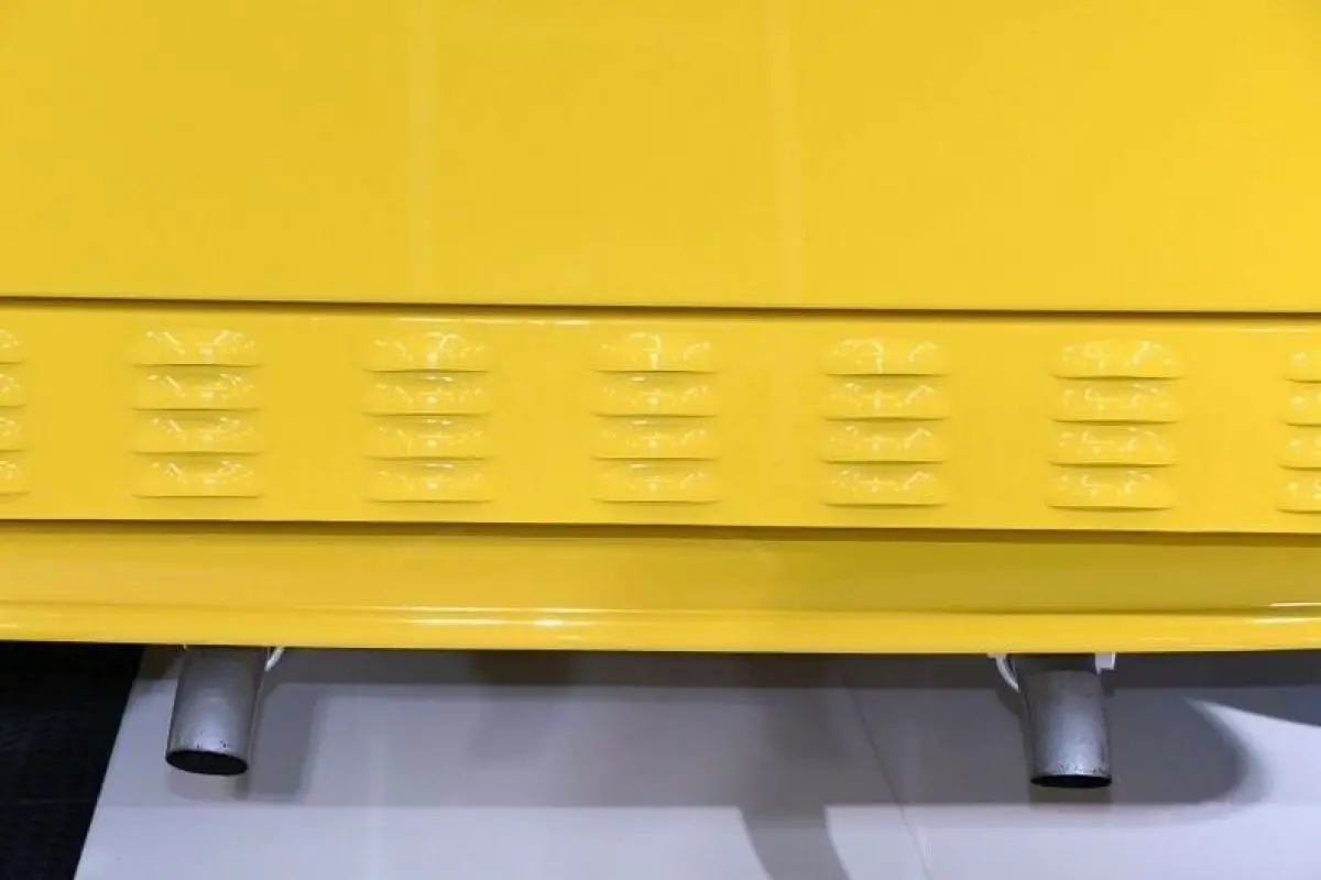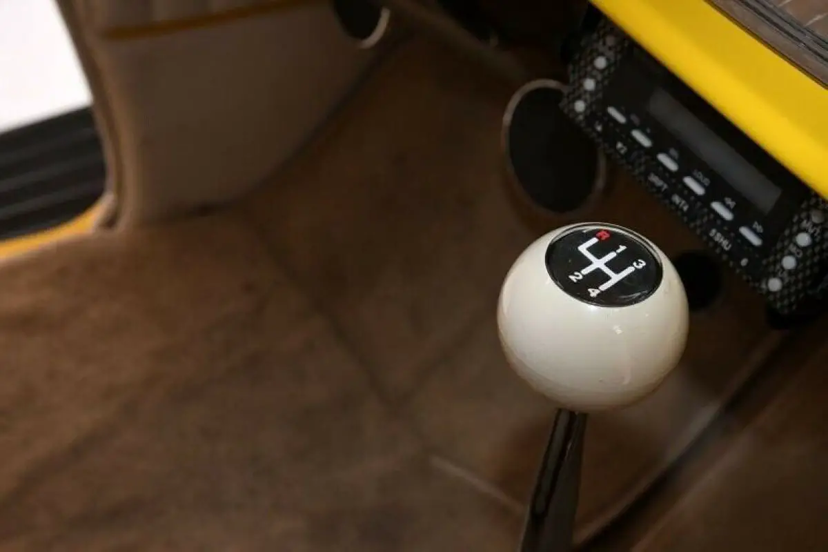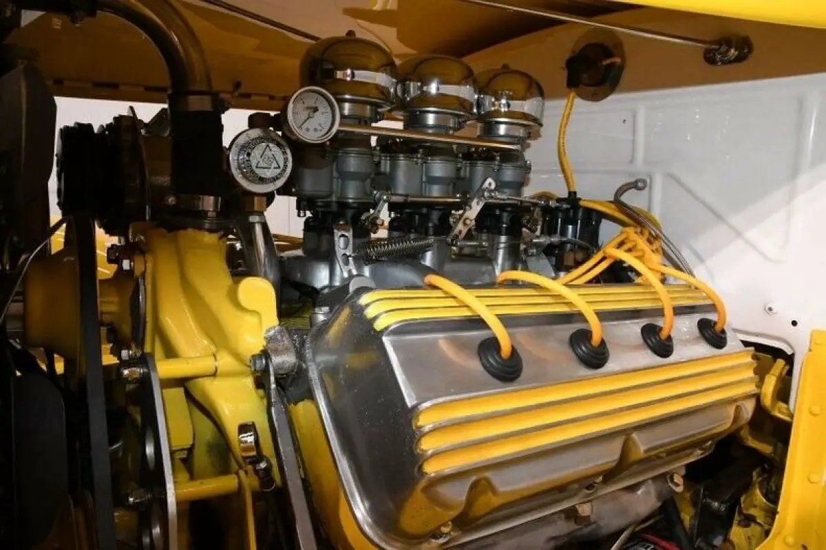 UNDERSIDE: The body was lifted off the chassis and every single component was taken apart and rebuilt or replaced. The whole bottom of this truck is the same screaming yellow as it is on top. Up front it has a 4 inch drop tubular axle. All new steering components. New leaf springs and shocks front and back. Bottom of the motor is clean, has a high torque starter. It uses a Mopar 833 4-speed with overdrive. A Ford 9 inch rear is in back with 3.89 gears. This will cruise all day at freeway speeds turning 1800 to 2000 RPMs. Disc brakes front and back, they used stainless steel braided hoses. It also has a power brake unit under the truck. New dual exhaust system goes all the way out the back with turn down tips.