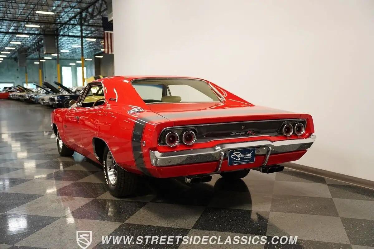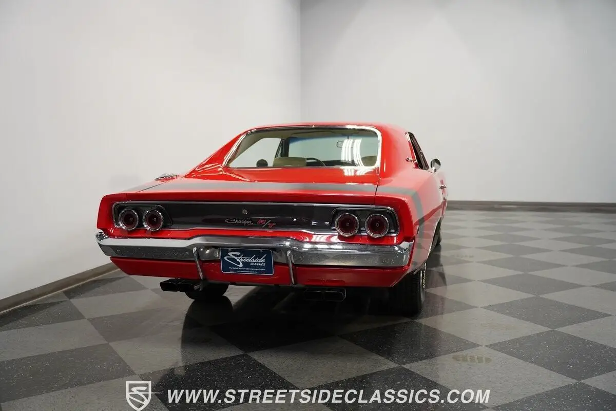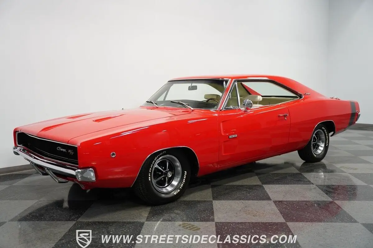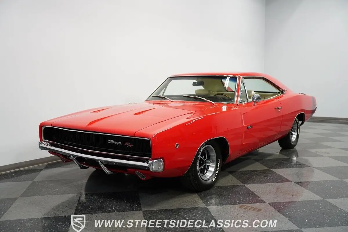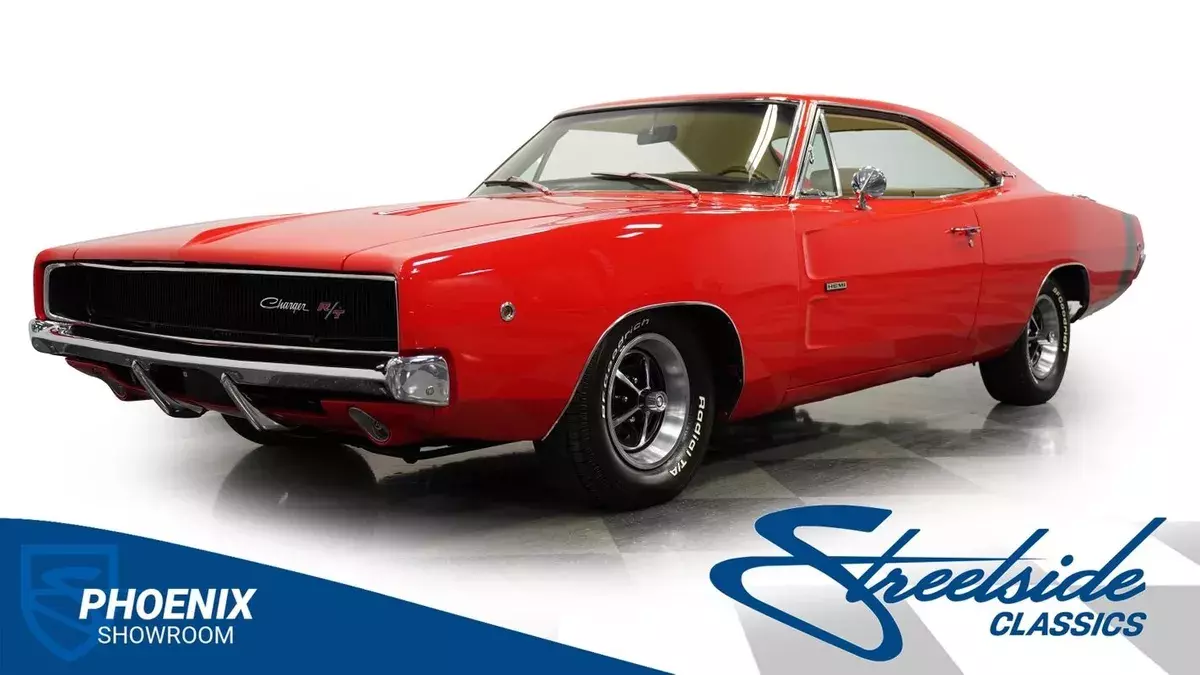 Vehicle Original VIN : XS29L8B3840303846-PHX 1968 DODGE CHARGER R/T 426 HEMI TRIBUTE This 1968 Dodge Charger R/T 426 Hemi Tribute blazes in Viper Red, a color that screams performance and attitude. Originally a 440-powered R/T, this Charger now flexes serious muscle with a 426 Hemi V8 under its hood. The aggressive stance is accentuated by period-correct 14-inch Chrysler mag wheels with black painted inserts, wrapped in BF Goodrich Radial T/A tires (P225/70R14 front, P225/75R14 rear). A painted metallic gray bumblebee stripe wraps around the rear, paying homage to its muscle car lineage. The bumper chrome shines brilliantly, complementing the sleek, aerodynamic profile that made the '68 Charger a legend on street and track. Inside, the ivory interior creates a striking contrast to the exterior's bold red. Vinyl bucket seats offer both comfort and period-correct style, while the factory center console houses the floor shifter for the 3-speed automatic transmission. The dashboard features factory-style gauges including a tachometer, essential for monitoring the Hemi's performance. An aftermarket steering wheel with a teak wooden perimeter adds a touch of sophistication. Modern conveniences blend seamlessly with classic style – a Premier AM/FM radio provides the tunes, while factory air conditioning keeps the cabin cool during spirited drives. The star of this show is the 426 Hemi V8, built to produce a tire-shredding 550 horsepower on pump gas. The engine bay is a showcase of power and engineering, featuring dual Edelbrock Performer AFB-style four-barrel carburetors with electric chokes, sitting atop a Chrysler aluminum intake manifold. Long tube stainless headers feed into a dual exhaust system for that signature Hemi growl. Performance upgrades continue with a high-performance aluminum radiator and twin electric fans to keep this powerhouse cool. The 3-speed automatic transmission and 8 3/4 rear end with 3.23 gears provide the perfect balance of acceleration and highway cruising ability. HIGHLIGHTS: • 426 Hemi V8 Engine (550hp) • 3 Speed Automatic Transmission • Dual Edelbrock Performer AFB-style Carburetors • Long Tube Stainless Headers • Dual Exhaust System • High-Performance Aluminum Radiator with Twin Electric Fans • Power Steering • Power Front Disc Brakes • 8 3/4 Rear End with 3.23 Gears • Viper Red Paint • Metallic Gray Bumblebee Stripe • 14" Chrysler Mag Wheels with Black Painted Inserts • BF Goodrich Radial T/A Tires (P225/70R14 front, P225/75R14 rear) • Chrome Bumpers • Ivory Interior with Bucket Seats • Factory Center Console • Aftermarket Steering Wheel with Teak Wooden Perimeter • Factory-Style Gauges with Tachometer • Premier AM/FM Radio • Air Conditioning • Original 440 Engine Available • Restored by Realistic Auto Restoration This 1968 Dodge Charger R/T 426 Hemi Tribute combines classic muscle car aesthetics with modern performance upgrades. With its iconic design, potent Hemi power, and carefully chosen modifications, this Charger offers an exhilarating driving experience that honors its muscle car heritage. Call today!