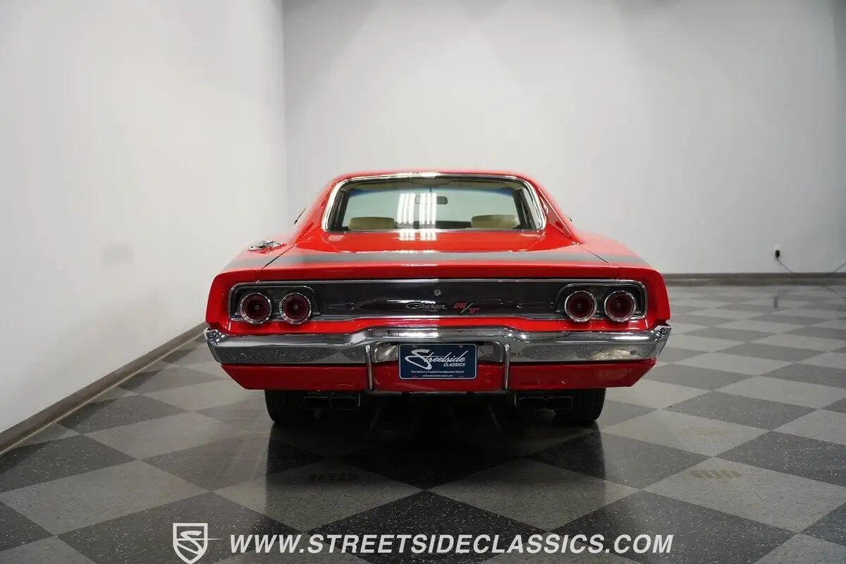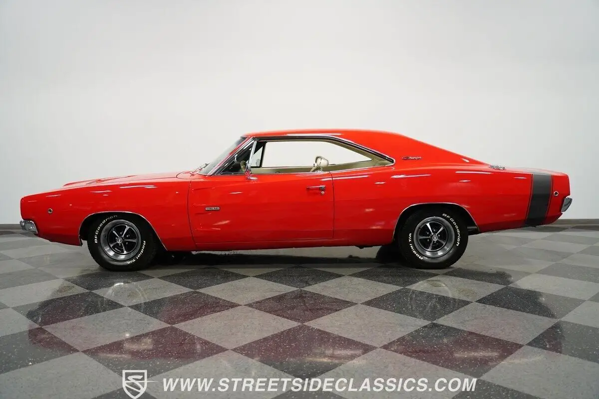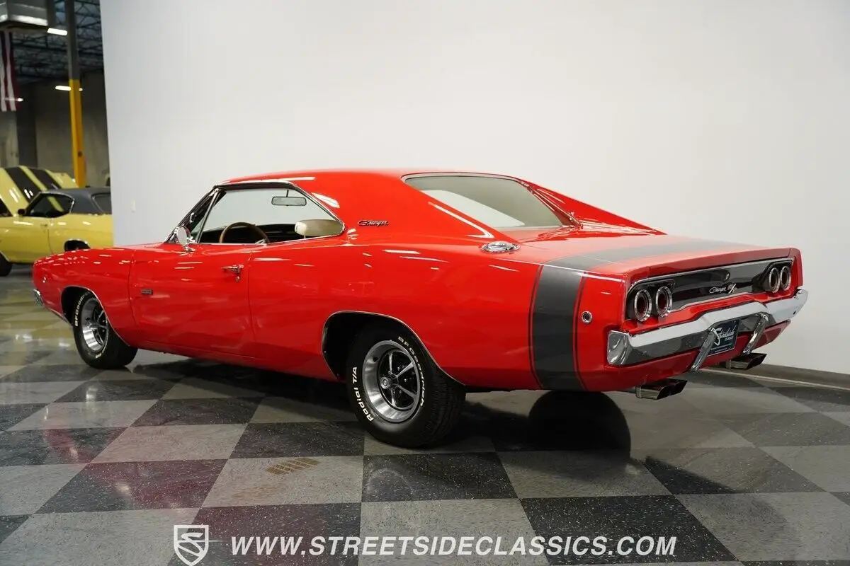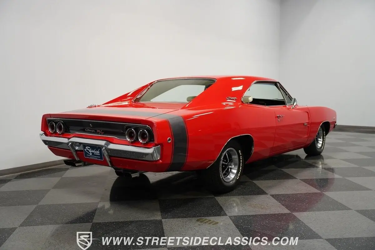 Vehicle Original VIN : XS29L8B3840303846-PHX 1968 DODGE CHARGER R/T 426 HEMI TRIBUTE This 1968 Dodge Charger R/T 426 Hemi Tribute blazes in Viper Red, a color that screams performance and attitude. Originally a 440-powered R/T, this Charger now flexes serious muscle with a 426 Hemi V8 under its hood. The aggressive stance is accentuated by period-correct 14-inch Chrysler mag wheels with black painted inserts, wrapped in BF Goodrich Radial T/A tires (P225/70R14 front, P225/75R14 rear). A painted metallic gray bumblebee stripe wraps around the rear, paying homage to its muscle car lineage. The bumper chrome shines brilliantly, complementing the sleek, aerodynamic profile that made the '68 Charger a legend on street and track. Inside, the ivory interior creates a striking contrast to the exterior's bold red. Vinyl bucket seats offer both comfort and period-correct style, while the factory center console houses the floor shifter for the 3-speed automatic transmission. The dashboard features factory-style gauges including a tachometer, essential for monitoring the Hemi's performance. An aftermarket steering wheel with a teak wooden perimeter adds a touch of sophistication. Modern conveniences blend seamlessly with classic style – a Premier AM/FM radio provides the tunes, while factory air conditioning keeps the cabin cool during spirited drives. The star of this show is the 426 Hemi V8, built to produce a tire-shredding 550 horsepower on pump gas. The engine bay is a showcase of power and engineering, featuring dual Edelbrock Performer AFB-style four-barrel carburetors with electric chokes, sitting atop a Chrysler aluminum intake manifold. Long tube stainless headers feed into a dual exhaust system for that signature Hemi growl. Performance upgrades continue with a high-performance aluminum radiator and twin electric fans to keep this powerhouse cool. The 3-speed automatic transmission and 8 3/4 rear end with 3.23 gears provide the perfect balance of acceleration and highway cruising ability. HIGHLIGHTS: • 426 Hemi V8 Engine (550hp) • 3 Speed Automatic Transmission • Dual Edelbrock Performer AFB-style Carburetors • Long Tube Stainless Headers • Dual Exhaust System • High-Performance Aluminum Radiator with Twin Electric Fans • Power Steering • Power Front Disc Brakes • 8 3/4 Rear End with 3.23 Gears • Viper Red Paint • Metallic Gray Bumblebee Stripe • 14" Chrysler Mag Wheels with Black Painted Inserts • BF Goodrich Radial T/A Tires (P225/70R14 front, P225/75R14 rear) • Chrome Bumpers • Ivory Interior with Bucket Seats • Factory Center Console • Aftermarket Steering Wheel with Teak Wooden Perimeter • Factory-Style Gauges with Tachometer • Premier AM/FM Radio • Air Conditioning • Original 440 Engine Available • Restored by Realistic Auto Restoration This 1968 Dodge Charger R/T 426 Hemi Tribute combines classic muscle car aesthetics with modern performance upgrades. With its iconic design, potent Hemi power, and carefully chosen modifications, this Charger offers an exhilarating driving experience that honors its muscle car heritage. Call today!