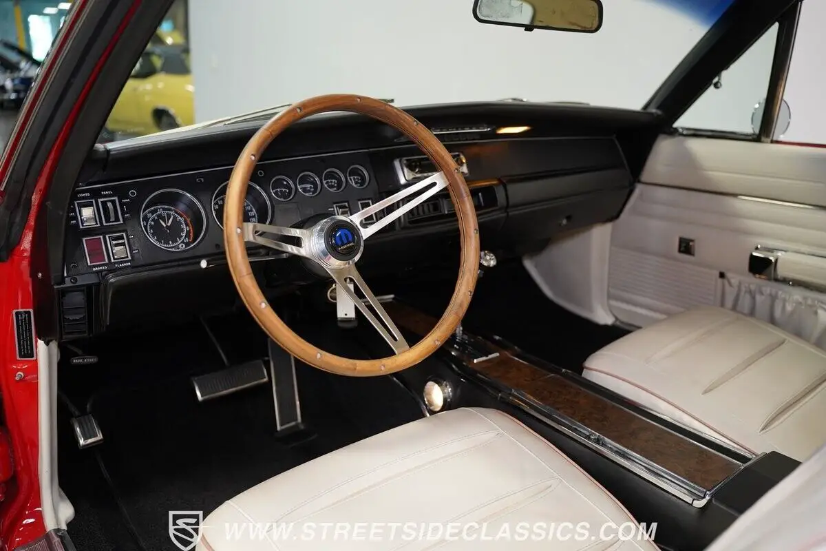 Inside, the ivory interior creates a striking contrast to the exterior's bold red. Vinyl bucket seats offer both comfort and period-correct style, while the factory center console houses the floor shifter for the 3-speed automatic transmission. The dashboard features factory-style gauges including a tachometer, essential for monitoring the Hemi's performance. An aftermarket steering wheel with a teak wooden perimeter adds a touch of sophistication. Modern conveniences blend seamlessly with classic style – a Premier AM/FM radio provides the tunes, while factory air conditioning keeps the cabin cool during spirited drives.