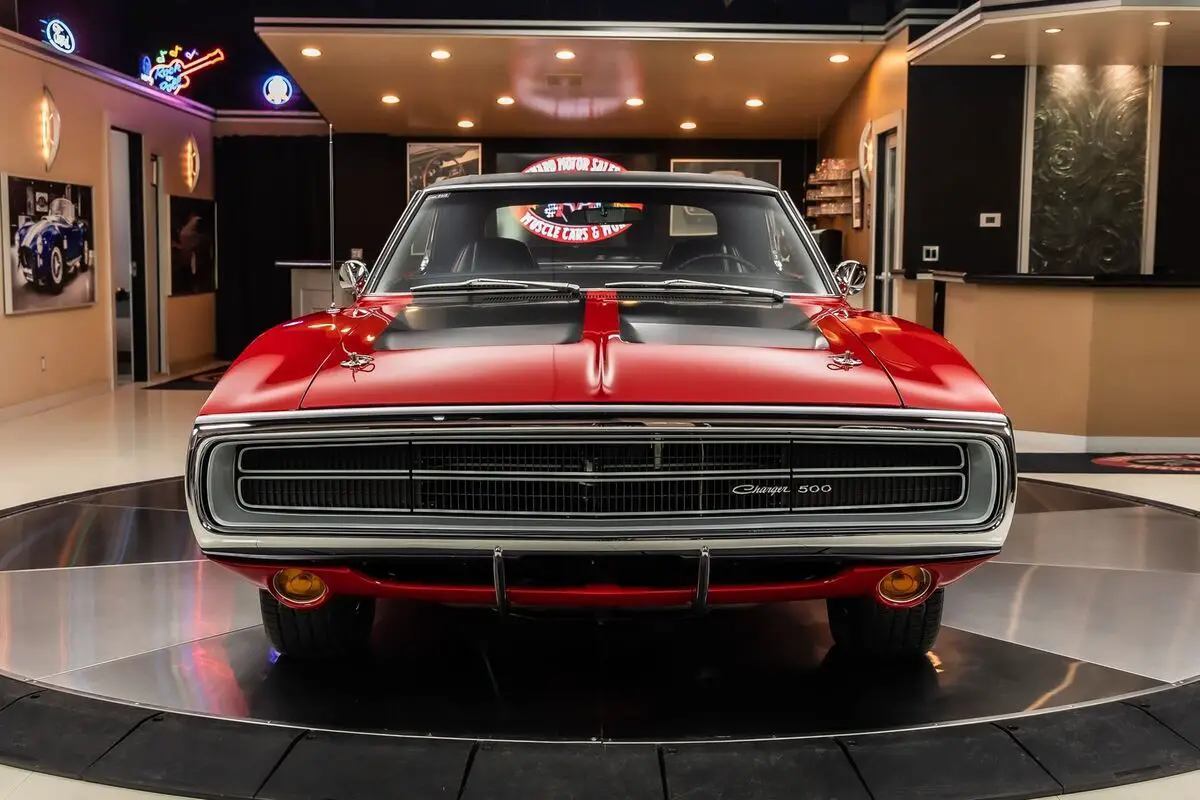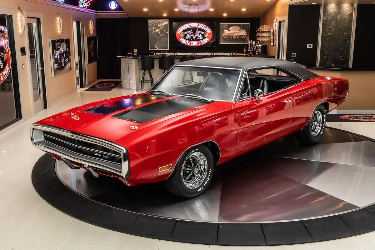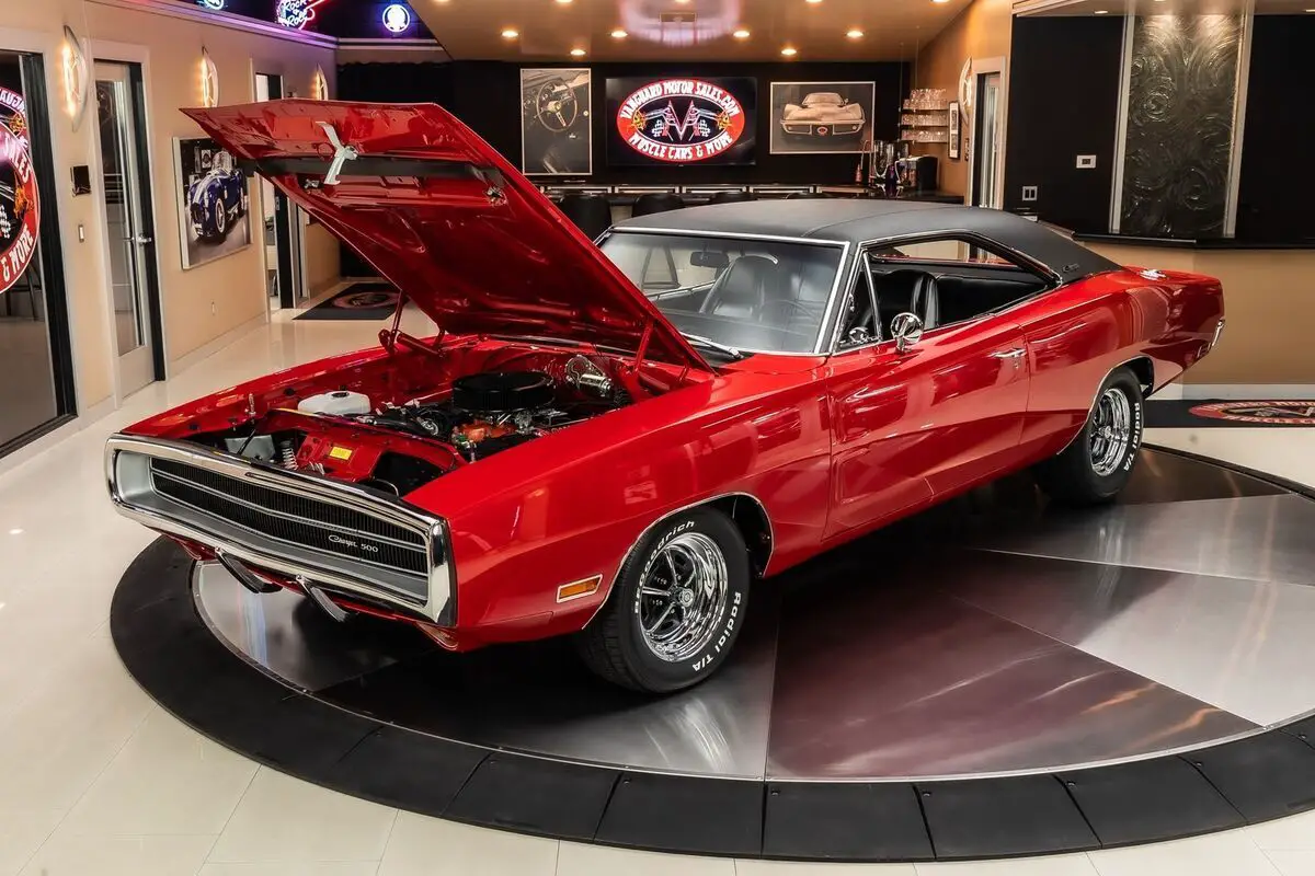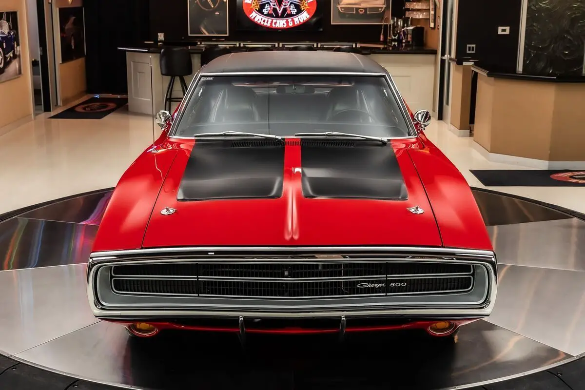 Check out this amazing 1970 Dodge Charger 500! This Charger has been Rotisserie restored to the closest detail with no expense spared! This Charger has been finished in beautiful Red with a Black Vinyl Top and sits on Magnum 500 Wheels Wrapped in BF Goodrich Radial TA tires! Under the hood sits a Dodge 505ci Stroker V8 Engine making around 700HP! Power is sent to the Rear Wheels through a A727 Torqueflite Automatic Transmission and Factory Rear End with a 3.93:1 Gear Ratio! Additional Features include, Power Brakes, Jet Coated Headers and Power Steering!