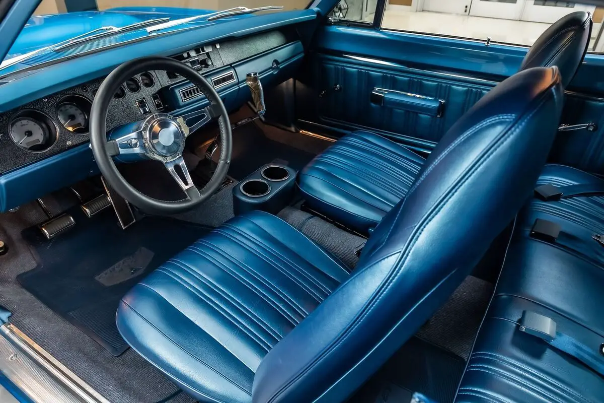 Inside, the cabin is the perfect complement to that B5 Blue paint! The vinyl interior is finished in matching blue with a stock finish. Up front is bucket seats, custom cupholders, & Pistol-Grip floor shifter for that 5-speed! On the dash is an aftermarket steering wheel, Dakota Digital gauges, Chrysler Solid-State radio, & tilt steering! This Coronet is also fitted with the stock 3-point seat belts, & stock headliner! Out back is a body-painted trunk with carpeting.