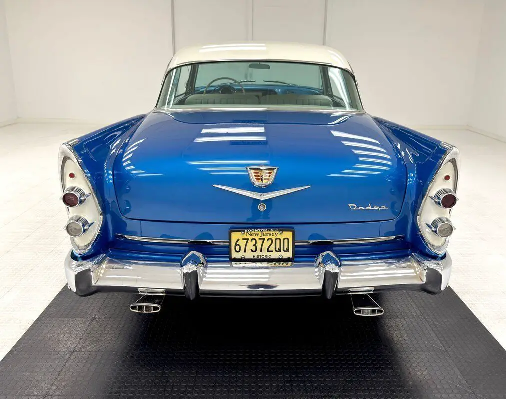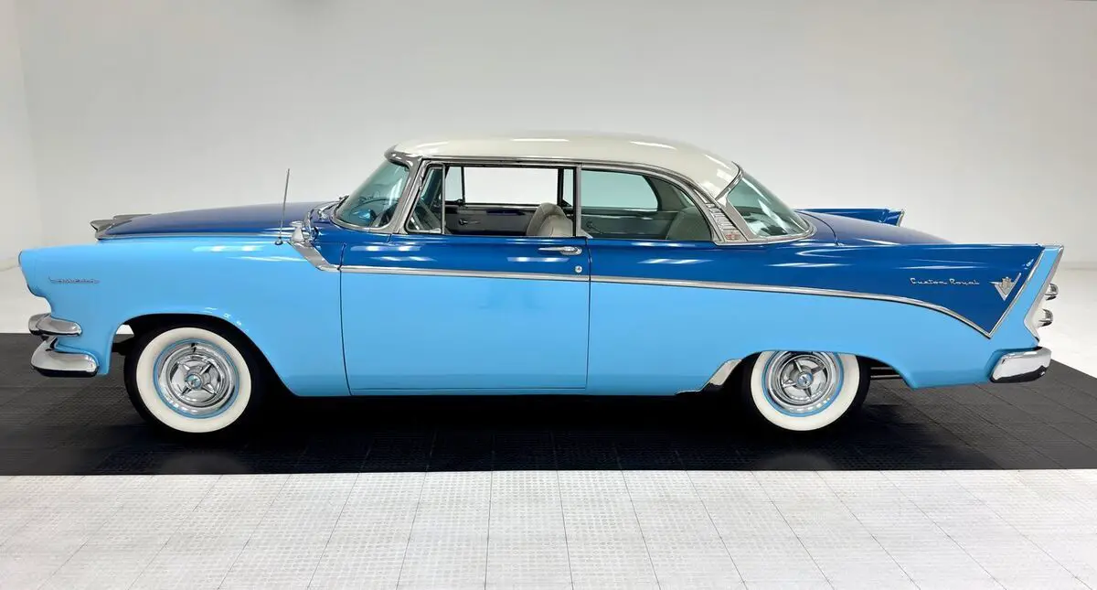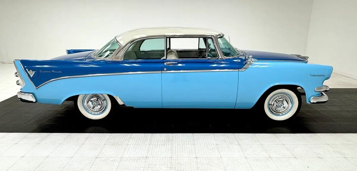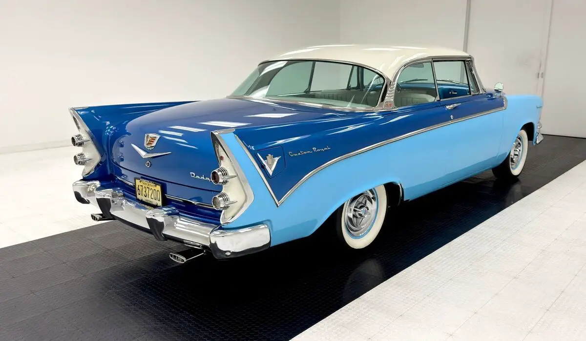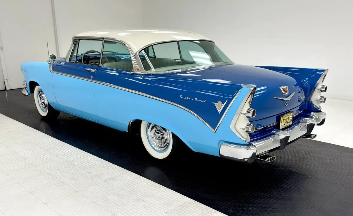 Not satisfied with simply two tone coverage, Dodge added a third and in this case it was repainted with a Sky Blue body is capped by a Royal Blue layer under a white roof, creating a dramatic three tone presentation. The darker blue panel cants rearward at which point it flares at the tail, creating a sweeping effect and at the same time, emphasizing the rear fin and jet-like tail. The afterburner tail lights are based in white nacelles, trimmed in chrome which blends visually with the large bumper, the panel trim, and the V-shaped decklid ornamentation. In front, an artful wing fronts the bulging hood and trails back to frame the Royal Blue. Spectacular! Big chrome teeth adorn the grille while a cross design on the hubcaps front 15-inch Sky Blue wheels wrapped in white walls, the rears fronted by a chrome gravel guard. It's in fantastic condition. If we had to be picky, there's some minor pitting on the side mirror base but the entirety of the metal is bright, and the paint is very nice.
