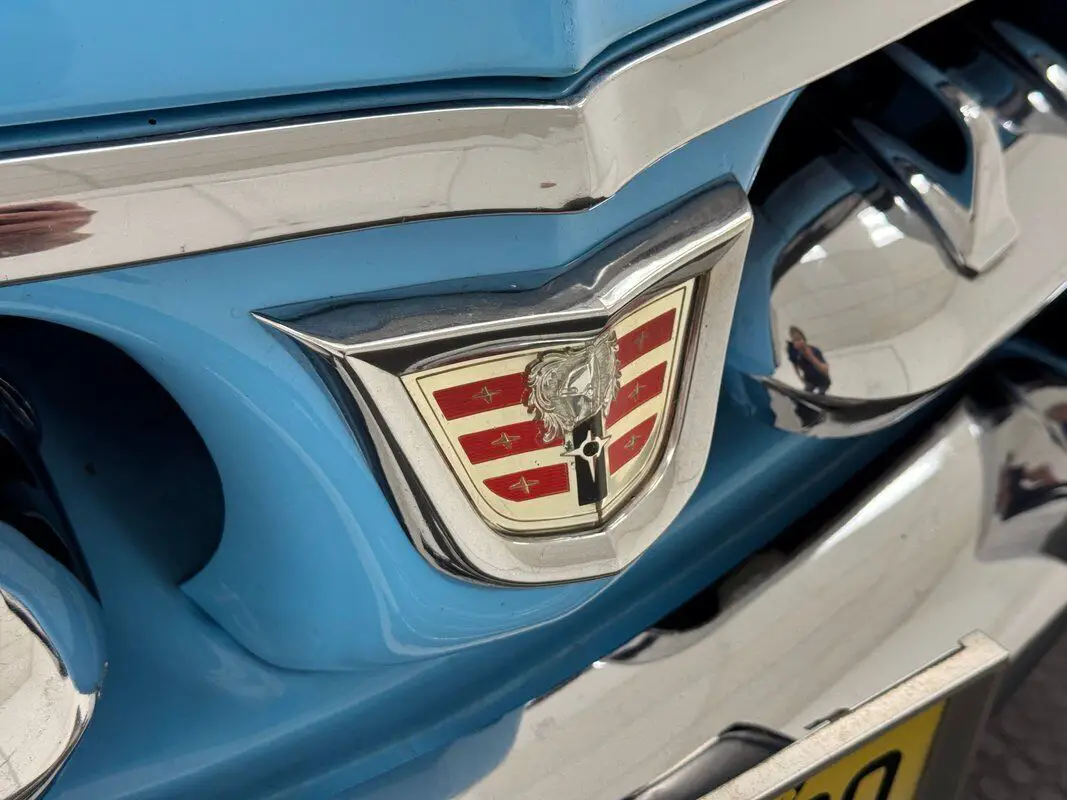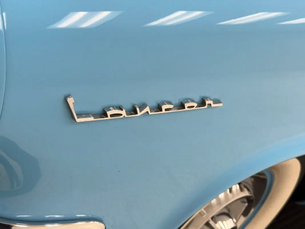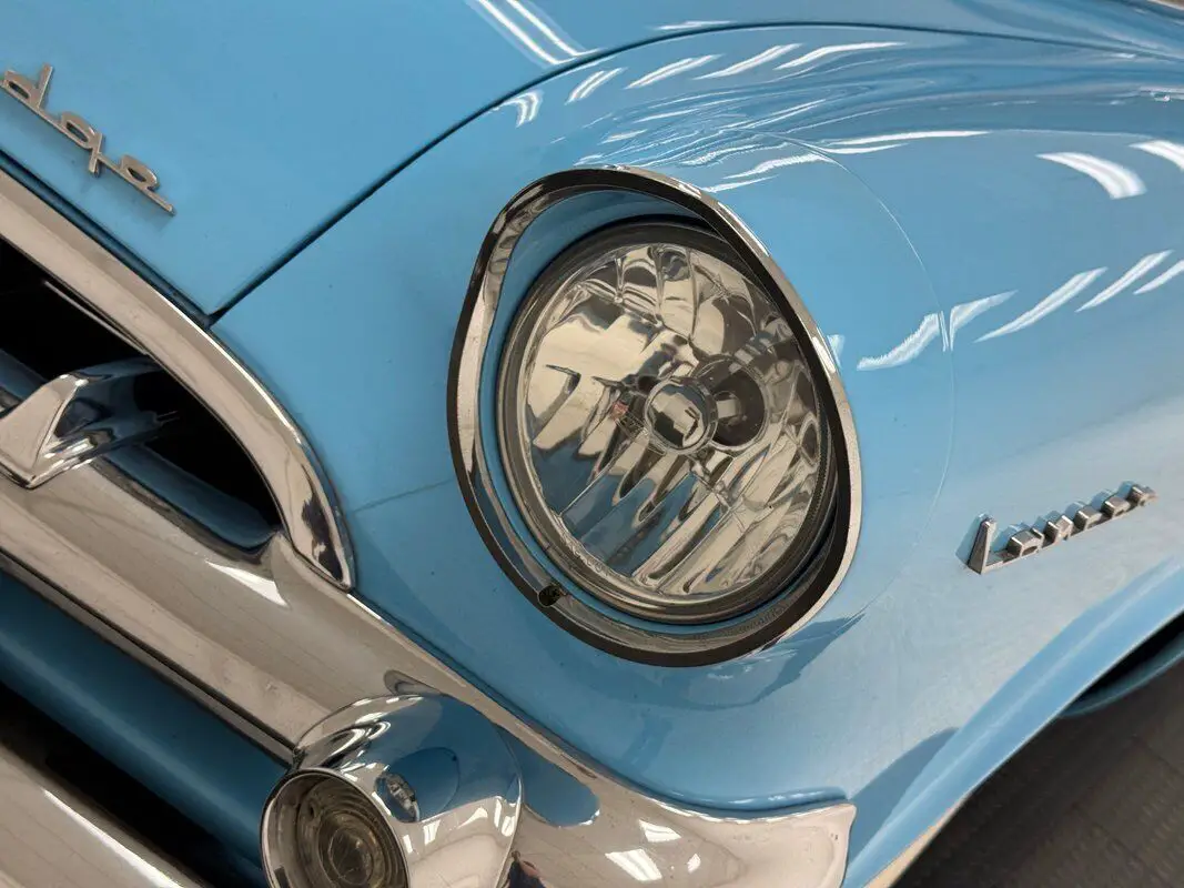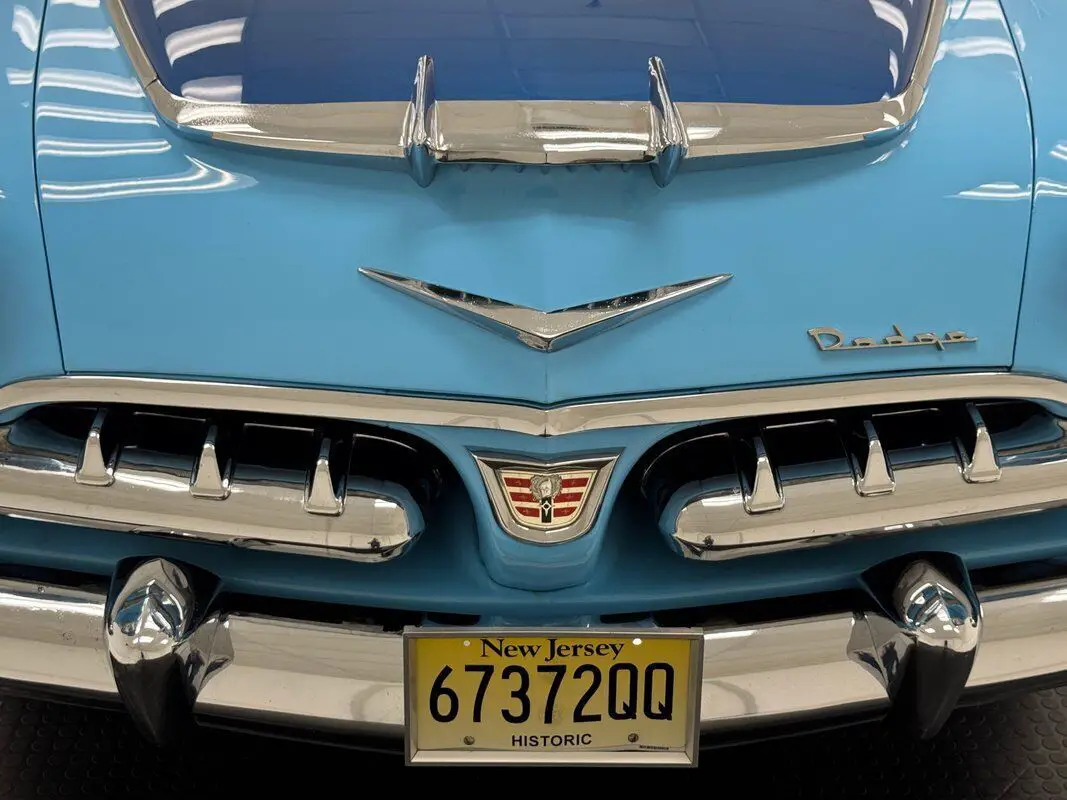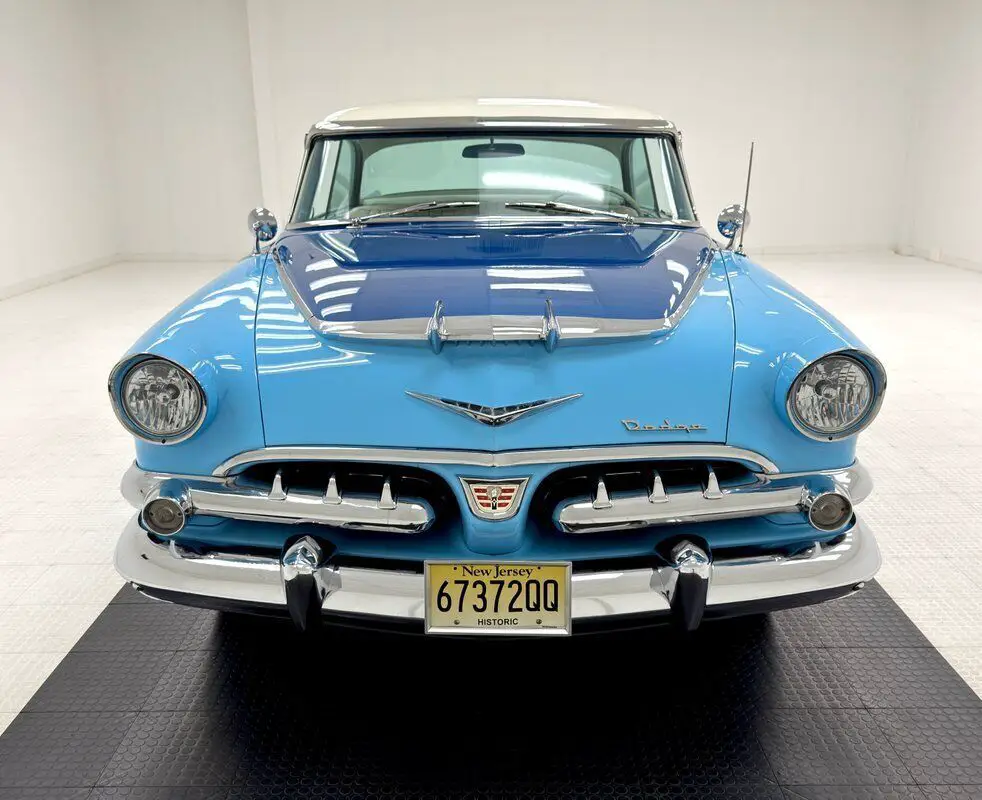 Not satisfied with simply two tone coverage, Dodge added a third and in this case it was repainted with a Sky Blue body is capped by a Royal Blue layer under a white roof, creating a dramatic three tone presentation. The darker blue panel cants rearward at which point it flares at the tail, creating a sweeping effect and at the same time, emphasizing the rear fin and jet-like tail. The afterburner tail lights are based in white nacelles, trimmed in chrome which blends visually with the large bumper, the panel trim, and the V-shaped decklid ornamentation. In front, an artful wing fronts the bulging hood and trails back to frame the Royal Blue. Spectacular! Big chrome teeth adorn the grille while a cross design on the hubcaps front 15-inch Sky Blue wheels wrapped in white walls, the rears fronted by a chrome gravel guard. It's in fantastic condition. If we had to be picky, there's some minor pitting on the side mirror base but the entirety of the metal is bright, and the paint is very nice.