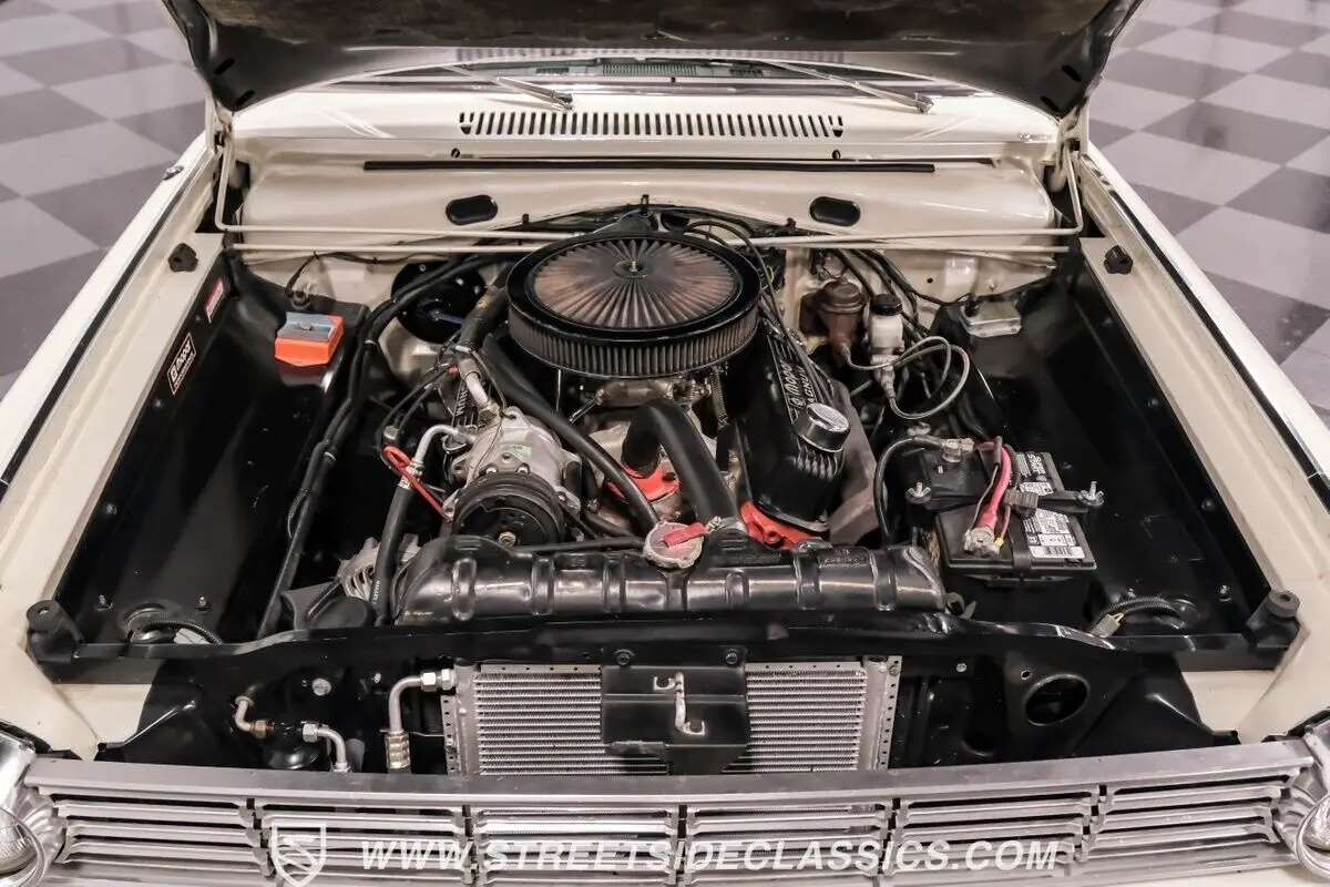 The 5.9-liter 360 V8 from a late model Mopar provides substantial power, managed through a 4-speed manual transmission with hydraulic clutch. A Holley carburetor and Mopar Performance M1 intake maximize the engine's potential. The updated mechanical specs include a rebuilt 8 1/4" rear end with 3.55 limited-slip gears, front and rear sway bars, and a FlowMaster dual exhaust system that announces this Dart's presence.