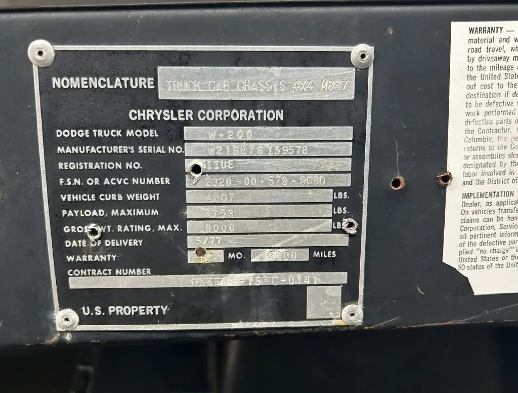 Here we have a 1977 Dodge W-200 M887 Ex Military 4x4 3/4 Ton Truck. These trucks were built for the U.S. Military. They are rugged essential trucks. It's classified as a one-3/4-ton truck. The U.S. Military used this truck| and after retirement| it was used in forestry: very low original miles| 17|891. Many details can be seen in the pics. This truck came out of an air museum| the way you see it. The only rust is on the floor on the driver's side. Under the hood is a 360 CID V8 paired with an automatic transmission. The engine will run if bottle-fed. The brakes are soft. It will need some work to be road-worthy. This M887 Dodge also comes with a CLEAR TITLE. It has a sturdy frame underneath and would be a great project to restore! Call us at877-350-0588 /877-350-0588 or email '' to inquire about this 1977 Dodge W-200 M887 Ex Military 4x4 3/4 Ton Truck.