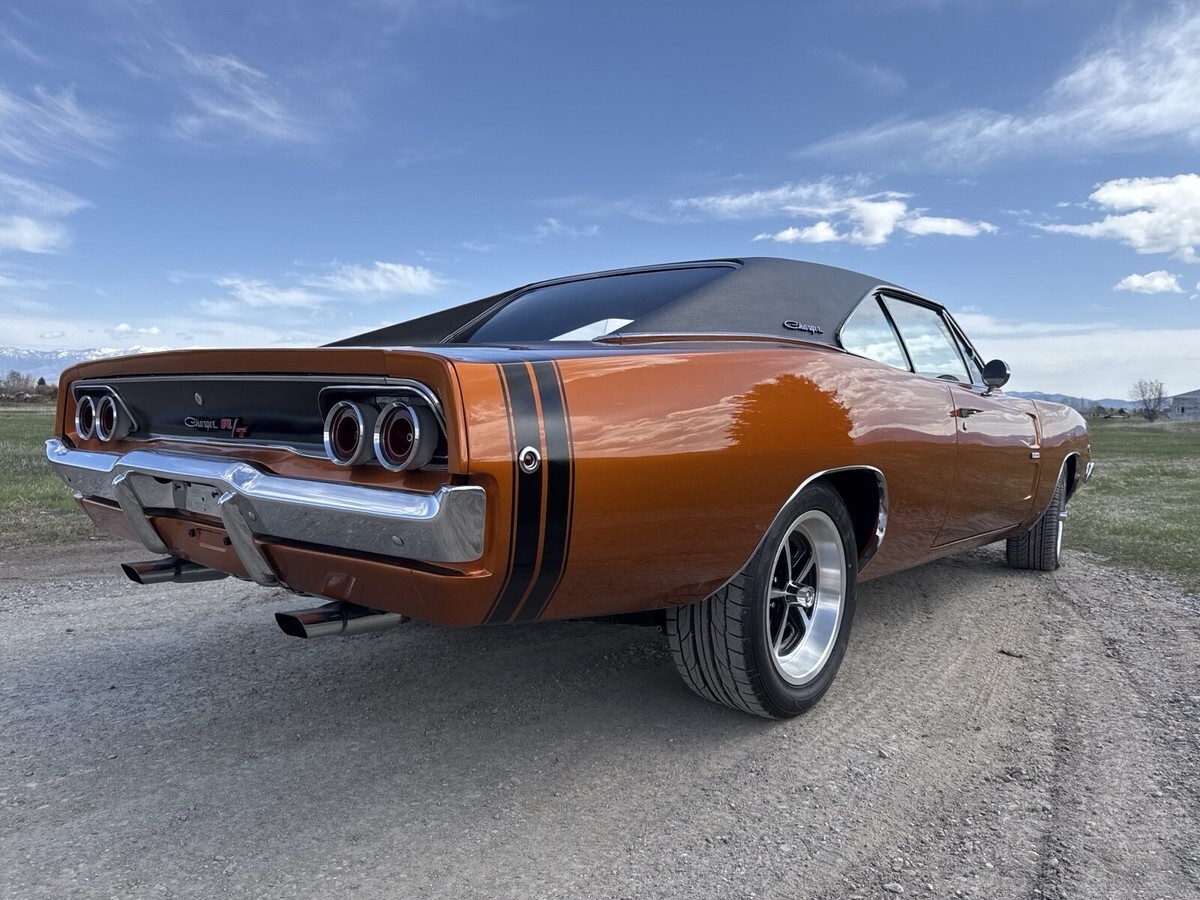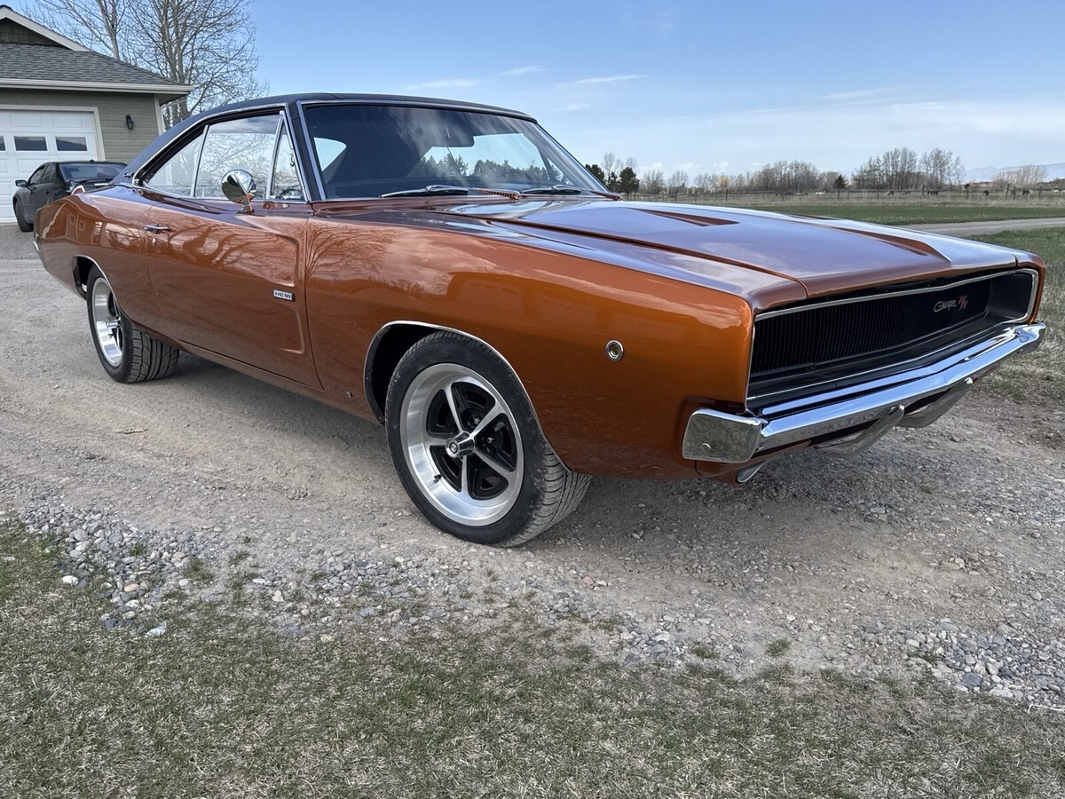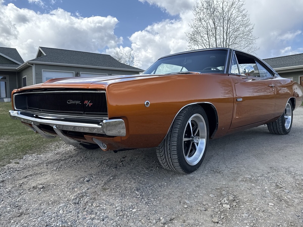 This 1968 Dodge Charger is an original car that the owner has had for 3 years. It is drivable and is mainly used for car shows. The vehicle has a clean title and is finished in a striking orange color.