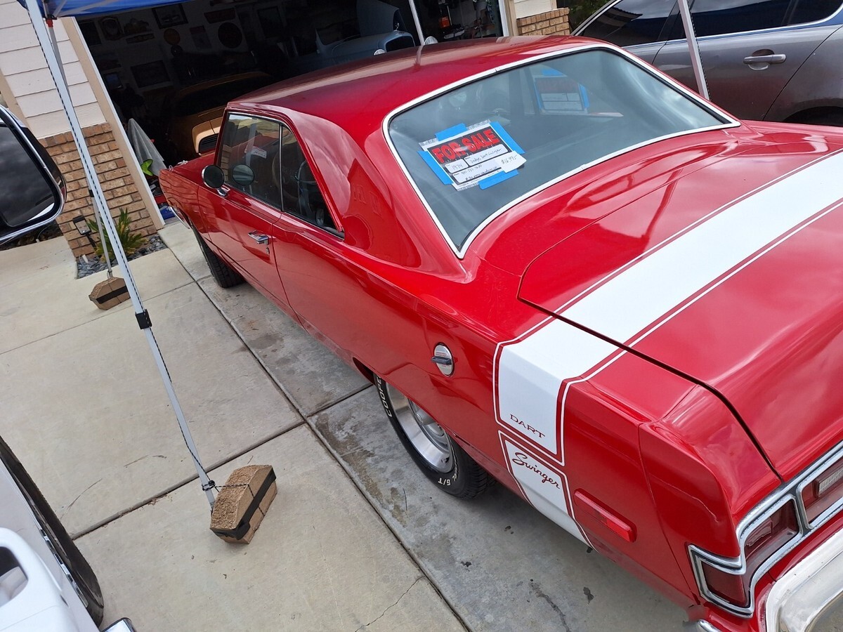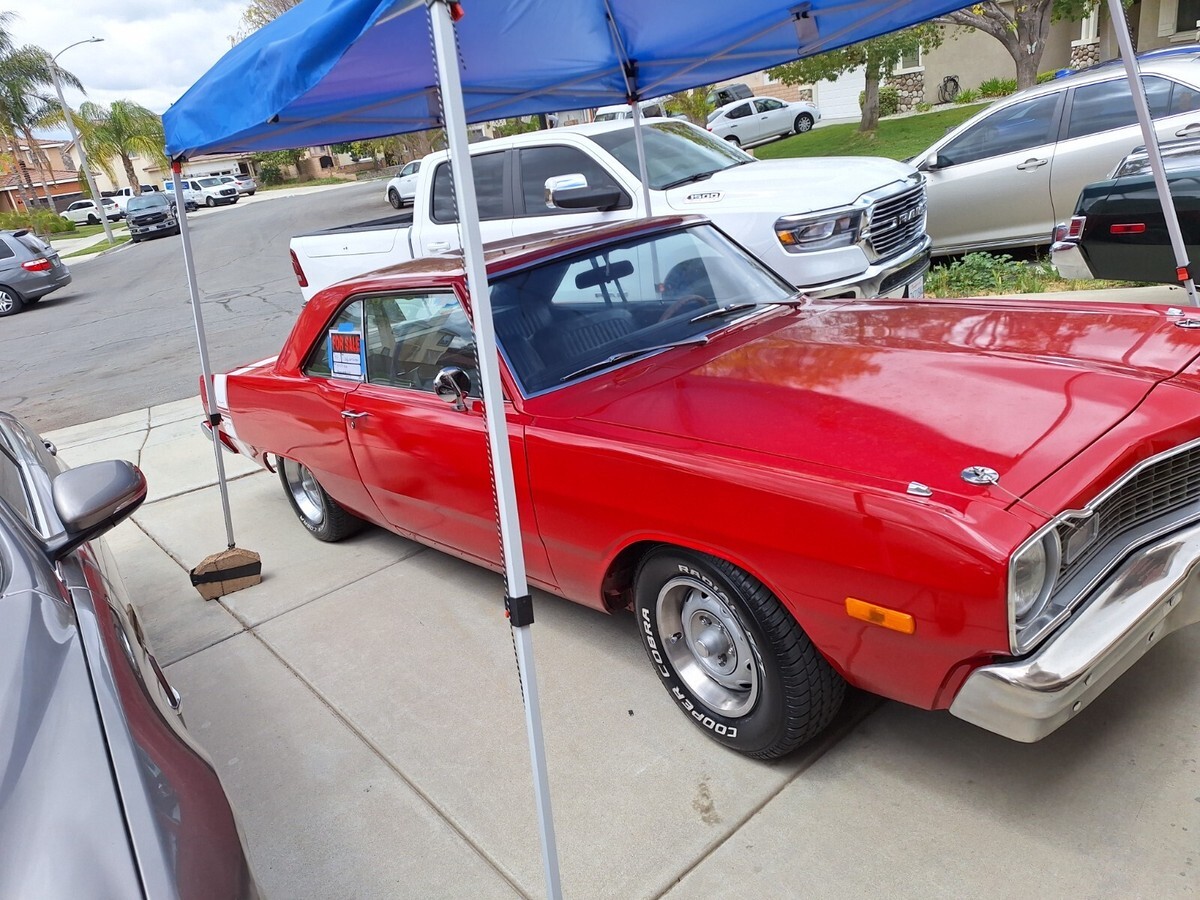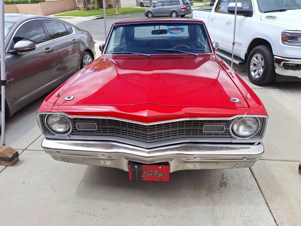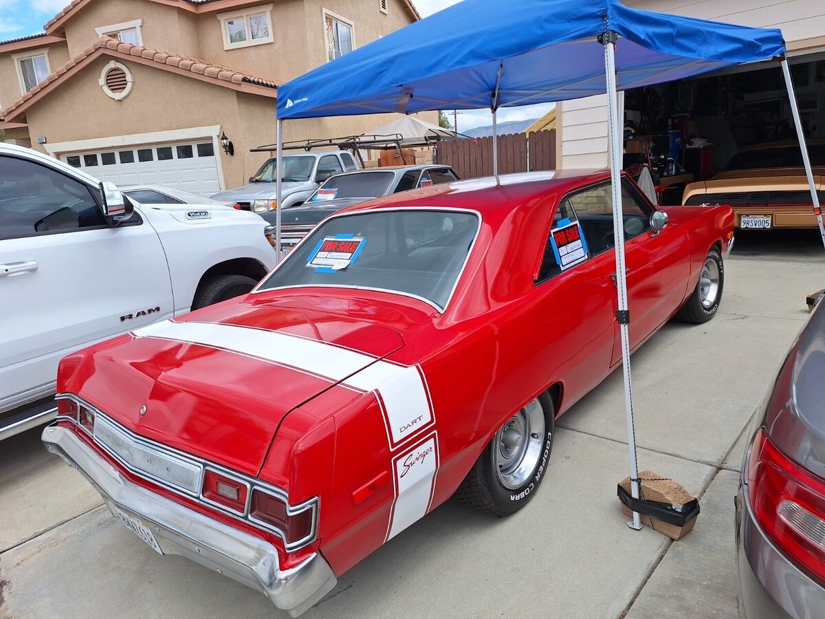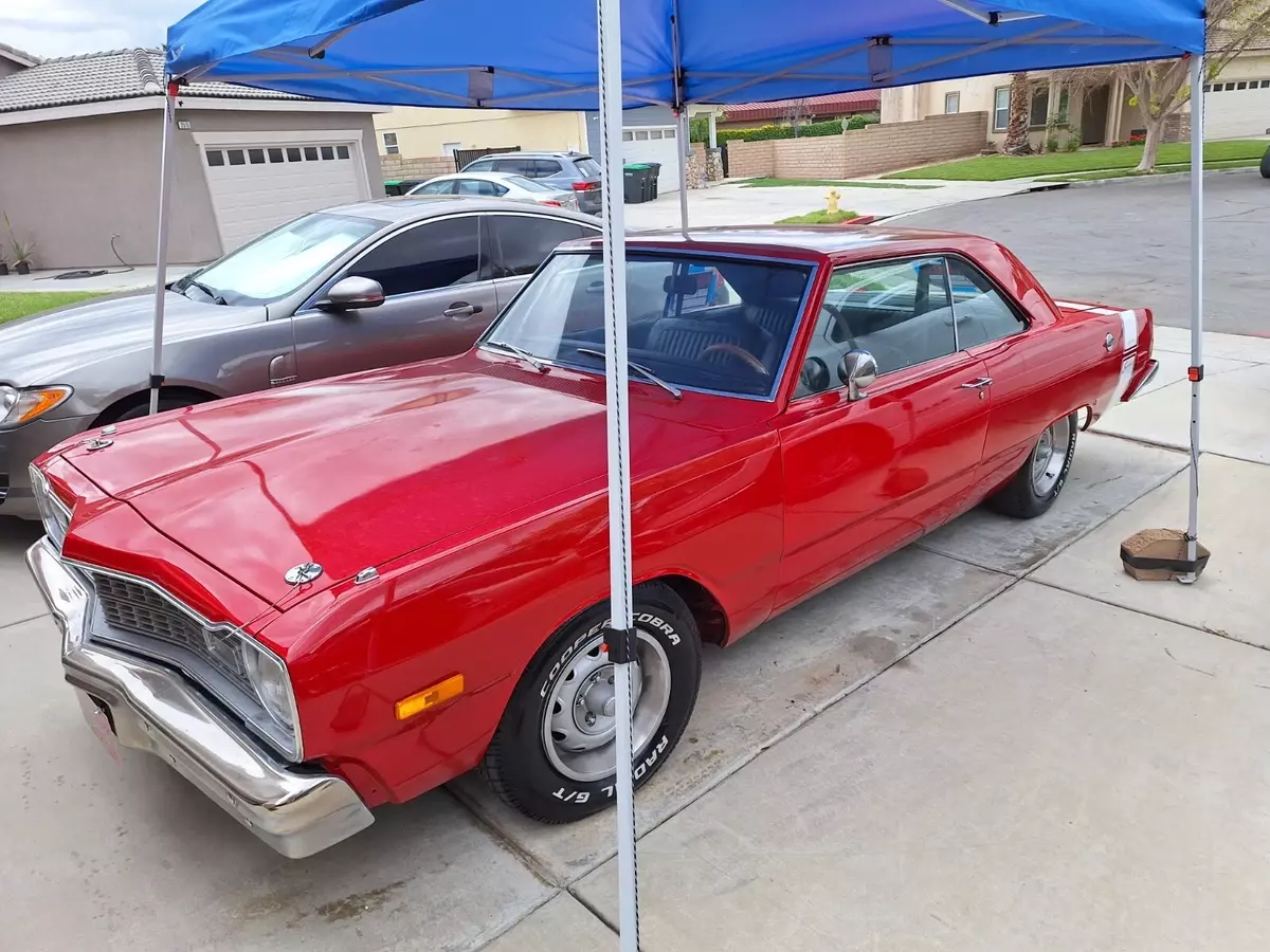 Hello, Up for sale is a nice 1974 Dodge Dart Swinger. It has a 318 V8, automatic. It was painted less than six months ago (Mopar Bright Red), New Stripes, carpet was replaced 2 years ago and the seats redone at same time (seat springs are weak though). The dashboard has a new material cove, the trunk has a new mat. Rally rims with newer tires. A new hood insulator and the transmission was rebuilt a year ago (904). I also replaced the entire exhaust system with 3" pipes and new Flow Master mufflers. It has an Edelbrock manifold, M/T Valve covers, an Edelbrock carburetor, a Powermaster Alternator and an Edelbrock Racing air cleaner. Front end was rebuilt (still needs alignment and vehicle has adjustable shocks all the way around, I also had the front and rear windows re-sealed (new seals). I replaced all the rubber around doors and side windows, and it has new kitty whiskers and rubber strips on all windows and outside of doors. This vehicle DOES NOT need to be smogged (so you can upgrade or change the drive train as you see fit). I have a clean title. I did put in new headliner in and I am currently finishing it up. There are minor repairs that still need to be done, dash lights don't come on, new seat springs, alignment and some color sand and polish. It shows 103k (do not know if it has ever turned as there is no sixth number), buyer is responsible for shipping if needed. Other than that she is ready to cruise and be enjoyed by the next owner. Tags and plates are all paid and up to date. This vehicle is being sold as-is. $16,995 obo. Thanks!