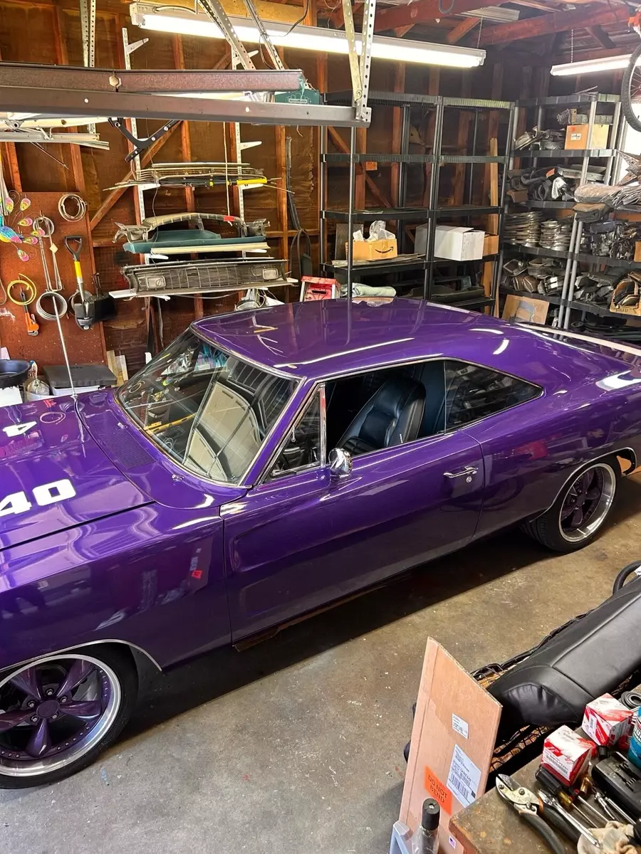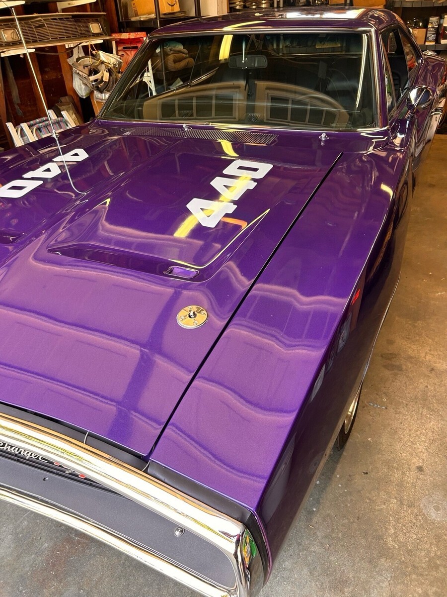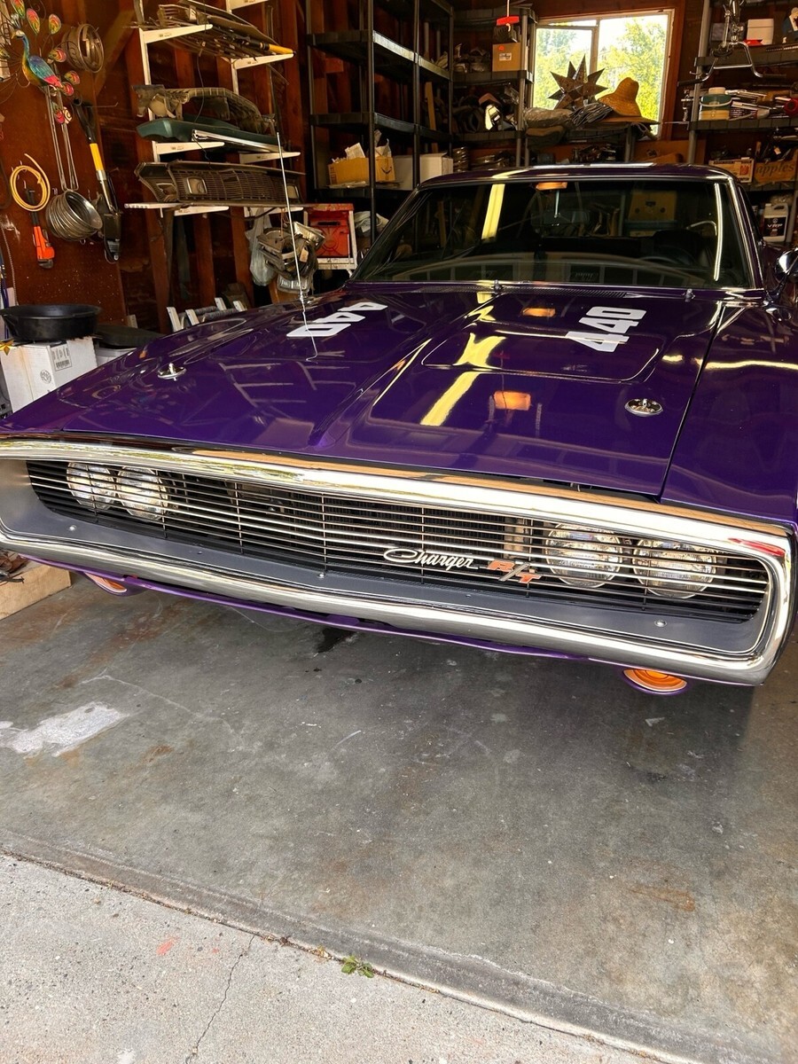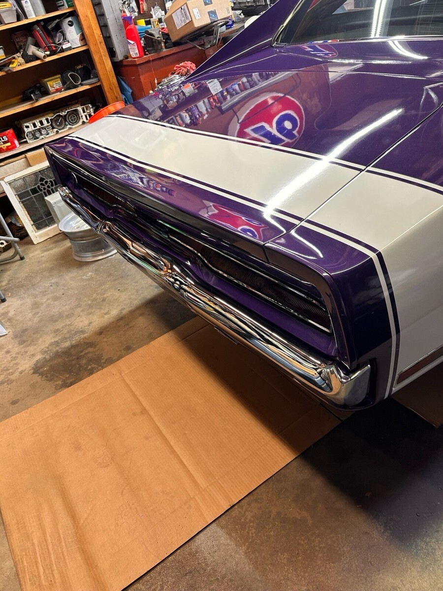 The car has an extremely straight body and is a California original car. Beautiful Plum Crazy purple paint job with white R/T stripes. Looks fantastic. All of the body accessories Are new as the car has been completely gone through.