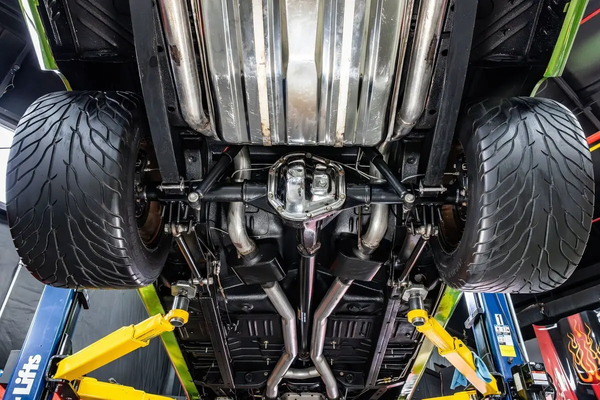 Underneath:- Frame Ties- Reinforced Front Control Arms- Reinforced K-Member- Widened Rear Wheel Wells- New Hardware - Front Sway Bar- CalTrac Rear Suspension Sliding Shackles- TTI Headers Look New- In- Tank Fuel Pump - Stainless Steel Fuel Lines - Custom 3'' Dual Exhaust - Black Undercoated Floor