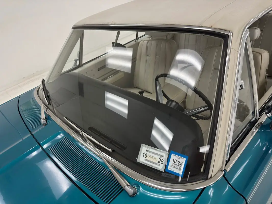 Ah yes, square patterns with grommet accenting seemed to be a trademark of the late 60's and early 70's and appears here on the white vinyl door panels. Then it's back to basics with vertical stitch patterning on the wide bucket seats, white vinyl with a bit of discoloration that the passage of time will cause, but mostly intact along with the center armrest and rear seats with the dipping middle to the seat backs, the chosen place for a nameplate emblem and in perfect view from the rear view mirror. We note a small tear on the side of the passenger seat. Upfront, a clean, black 3 spoke steering wheel leads the way to rectangular gauges as well as aircraft influenced toggle switches that operate the headlights, wipers, flashers and heating controls. A ribbed plastic faceplate covers the dash from the center right where we find an AM radio, courtesy light under the dash pad, and typical vent lever panel. Since the shifter is on the column, the floor is open, covered in black carpet, and clean while a whitish headliner rises above, high, tight, and holding the clipped in shoulder belt. The trunk is large and flat and is covered with a black carpeted mat.