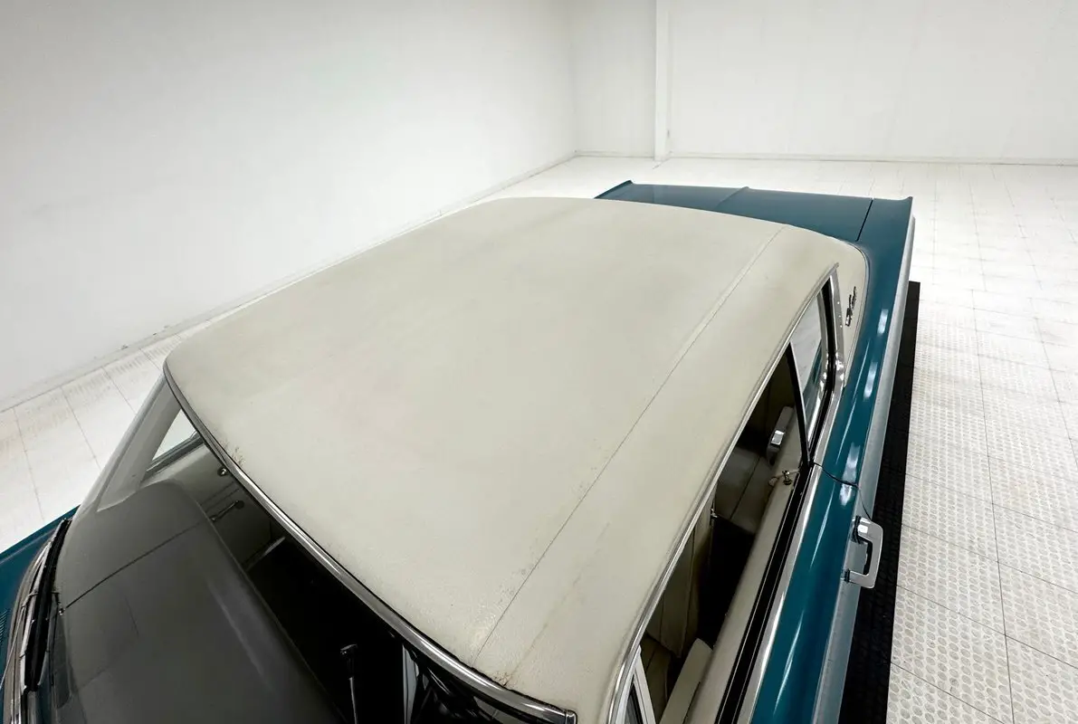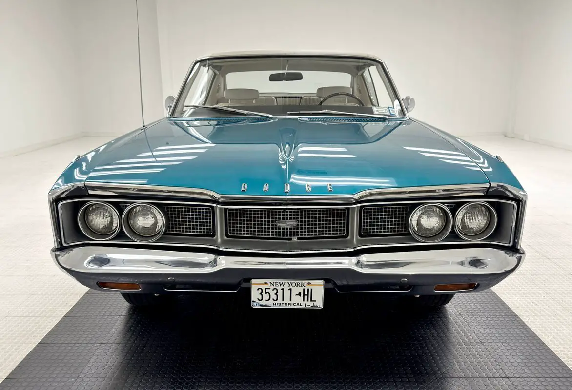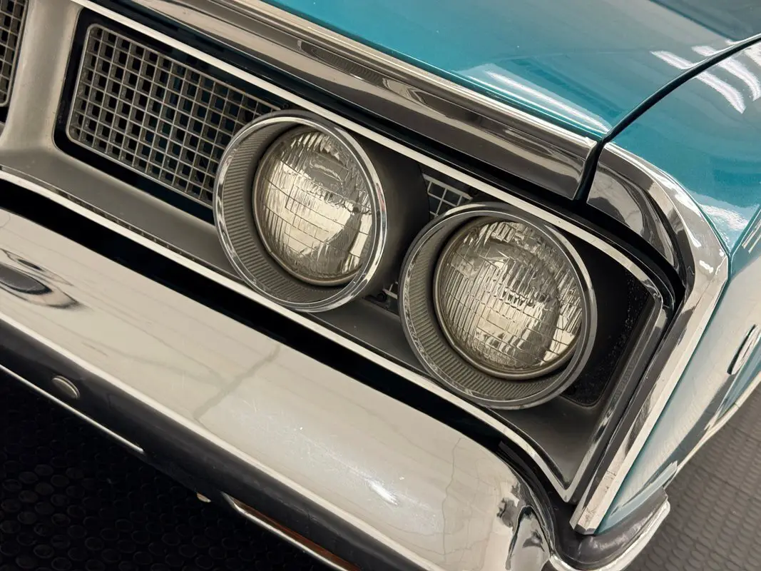 Wonderfully straight and equally as massive steel slabs work to form the fuselage sides of this car all draped in two stage Medium Dark Turquoise Metallic paint, contrasting with the white vinyl top that sandwiches the turquoise with a white rocker panel, itself sandwiched by stainless trim. Leading the way upfront with its trisected eggcrate grille flanked by dual headlights and some bumper embedded turn signal lights and all parts, including the hood line, comes to subtle square nose. Out back, the fastline sweep of the rear window blends into the large flat decklid, then dipping to the rear of the car with full length silver surrounded deeply inset tail lights with a bladed center divider. 15-inch Mopar road wheels are wrapped in thin striped white wall tires with the back wheels partially covered by the lower wheel opening. The parts bin for round marker lights was filled to the brim for 1968 with all Mopar models getting fitted with them. Imperfections include scuffs, dented scuffs, and some touched up scratches.