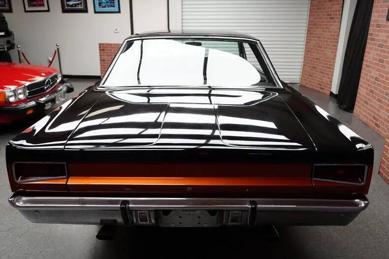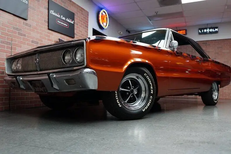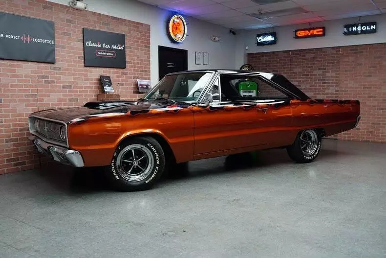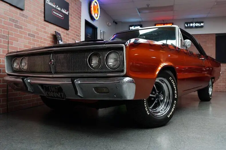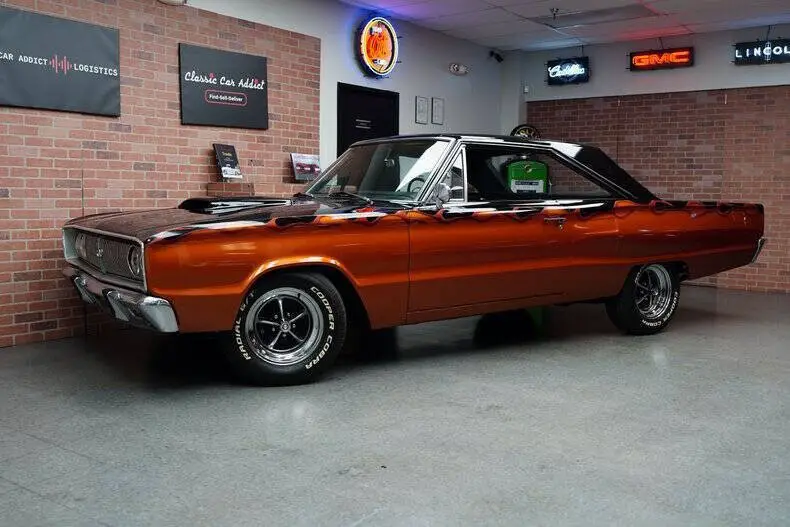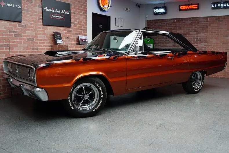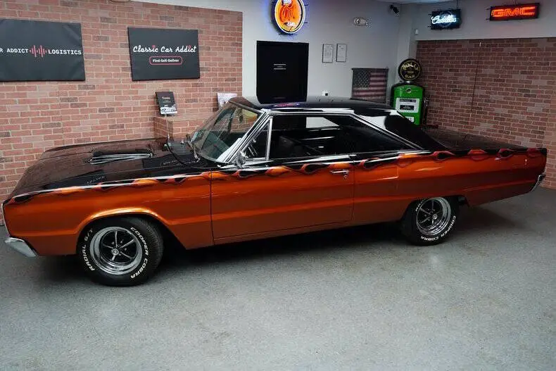 Classic Car Addict is proud to present this 1967 Dodge Coronet 440ci V8 for sale in our Mesa, Arizona showroom. The Coronet was marketed by Dodge in seven generations and shared nameplates with the same body shell with varying levels of equipment. The Coronet reappeared for the 1965 model year as the intermediate sized B-body, continuing what had been the Dodge Polara. The front and rear bench seats are trimmed in black vinyl and have recently been reupholstered. Bright trim lines the dashboard and doorsills and equipment includes a heater, new black carpet, and an AM/FM stereo. A three-spoke steering wheels frames a horizontal 120-mph speedometer and gauges for fuel level, coolant temperature, and volts. There is a Dixco 8K RPM tach mounted to the steering column and additional gauges showing oil, water, and amps. The five-digit odometer shows 40K miles, total mileage is unknown. The car is finished in a custom two-tone paint featuring black and copper (Texas burnt orange) with blazing flames. The car was recently buffed and polished. Details include quad headlights, hood louver, driver side mirror, passenger mounted antenna, and chrome bumpers. All exterior lights are in working order. The Dodge rolls on Magnum 500 wheels with Cooper Cobra tires, P21570R15's. The Coronet now features a 440ci V8 that's been bored 60 over. The block number is 253 6430-4, casting number is 6-25-65. Power is sent to the rear wheels through a three speed 727 torqueflite transmission with a 2500 stall converter. The motor has been balanced and has new pistons and rods. It features a comp cam 305 duration and 525 lift. Additional upgrades include an Edelbrock performer RPM aluminum heads and a four-barrel carburetor. It has a Ford 9-inch rear end with 355 gears and does have posi-traction. Don't miss out on an opportunity to own this awesome Dodge Coronet, call Classic Car Addict today at 480-256-1459. And please be sure to watch the full walkaround and driving video linked directly to our YouTube channel under Classic Car Addicts. We are a Classic Car company that combines a lifelong passion for classic cars with a level of customer service that thinks of you first. A company small enough to allow a personal relationship but a company with global expertise to deliver all your needs.