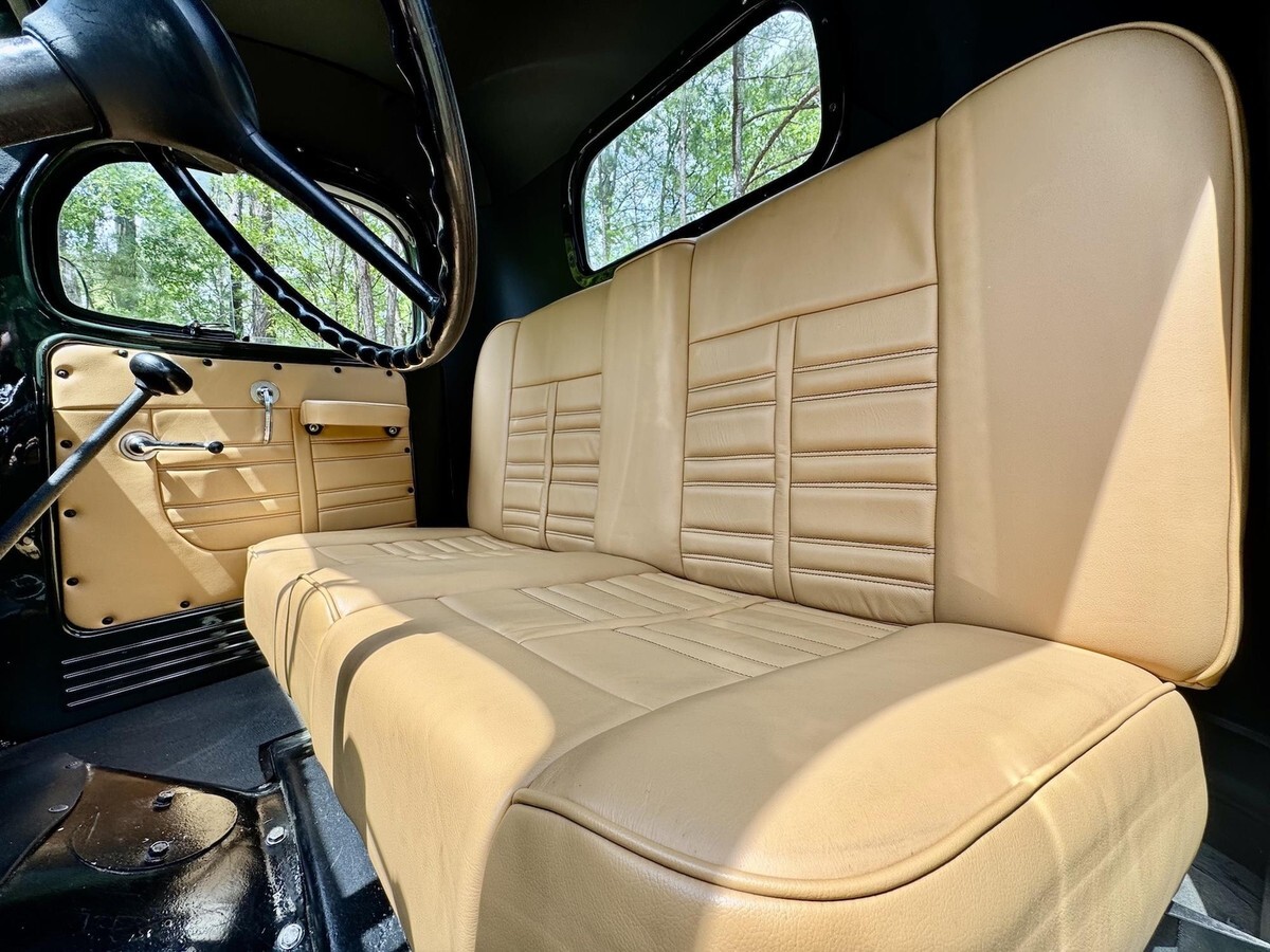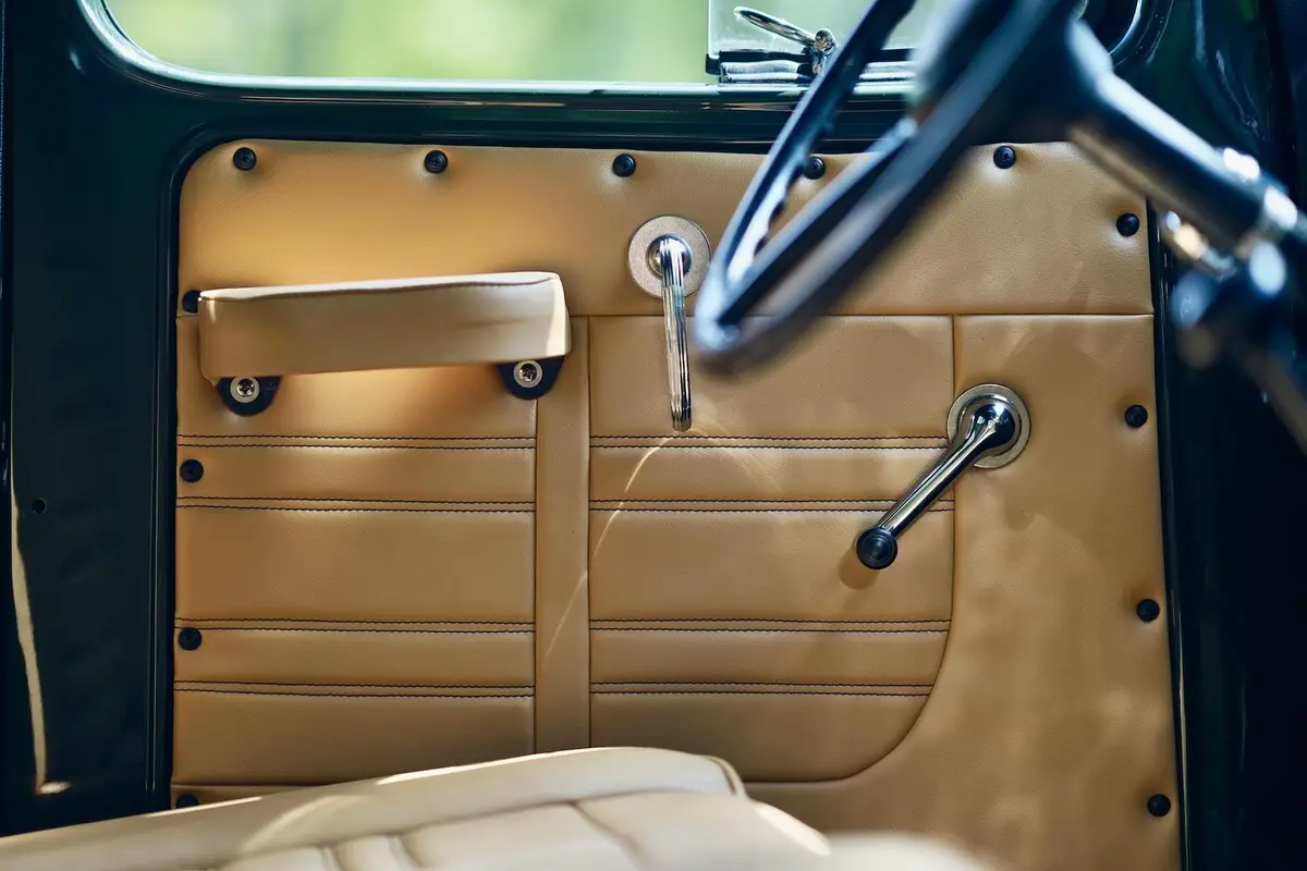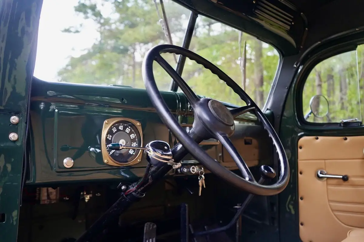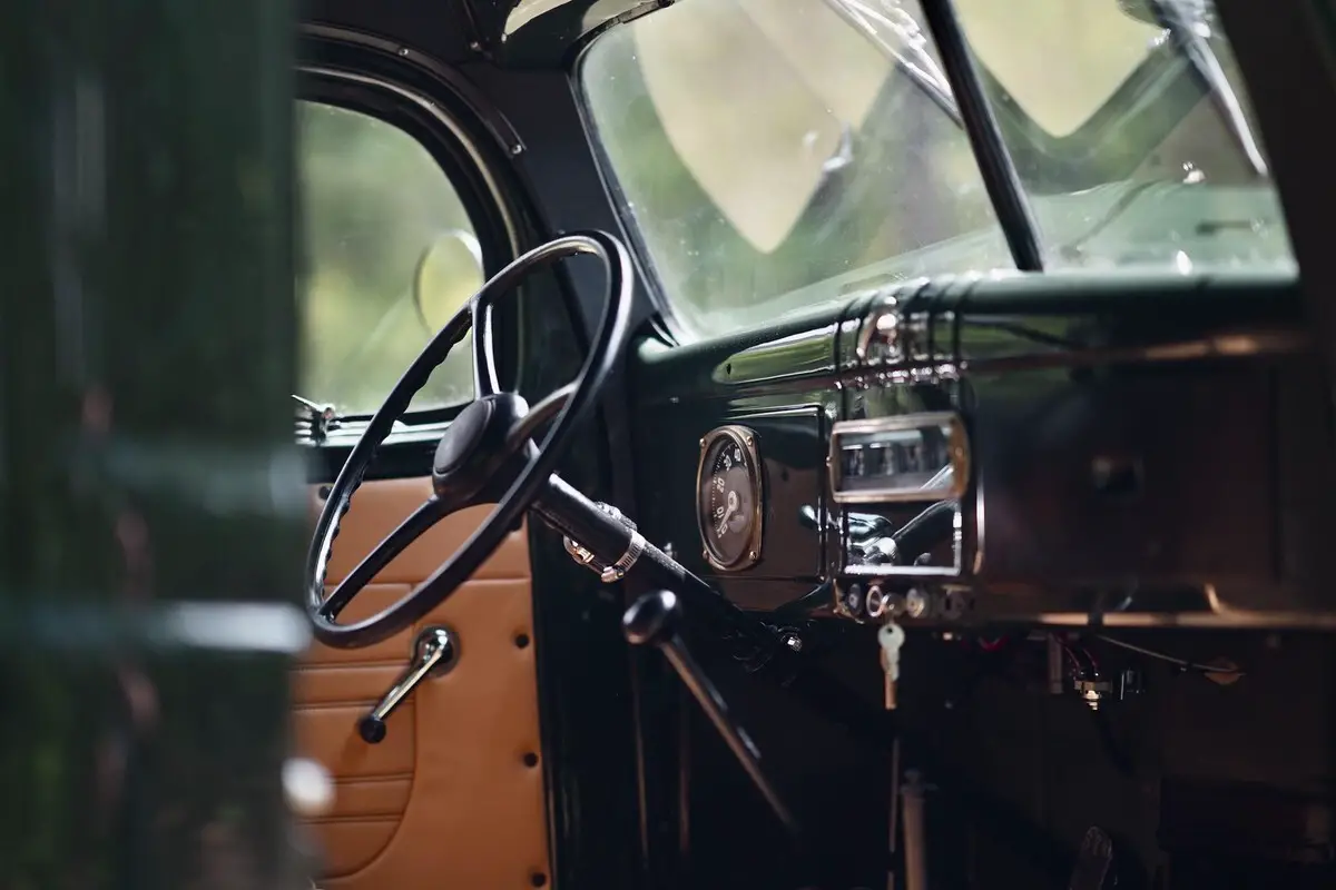 Wearing a rich coat of Underberg Green with bold black fenders and running boards, this B-4-PW-126 commands attention wherever it rolls. Inside, the tone stays true to its roots, featuring a Saddle Tan leather bench seat, a period-correct fiberboard headliner covered in vinyl for a more upscale appearance, and a blend of restored original and reproduction gauges—all carefully curated for an authentic driving experience. Out back, an African Sapele hardwood bed floor with stainless steel retaining strips brings timeless craftsmanship to this no-nonsense workhorse.