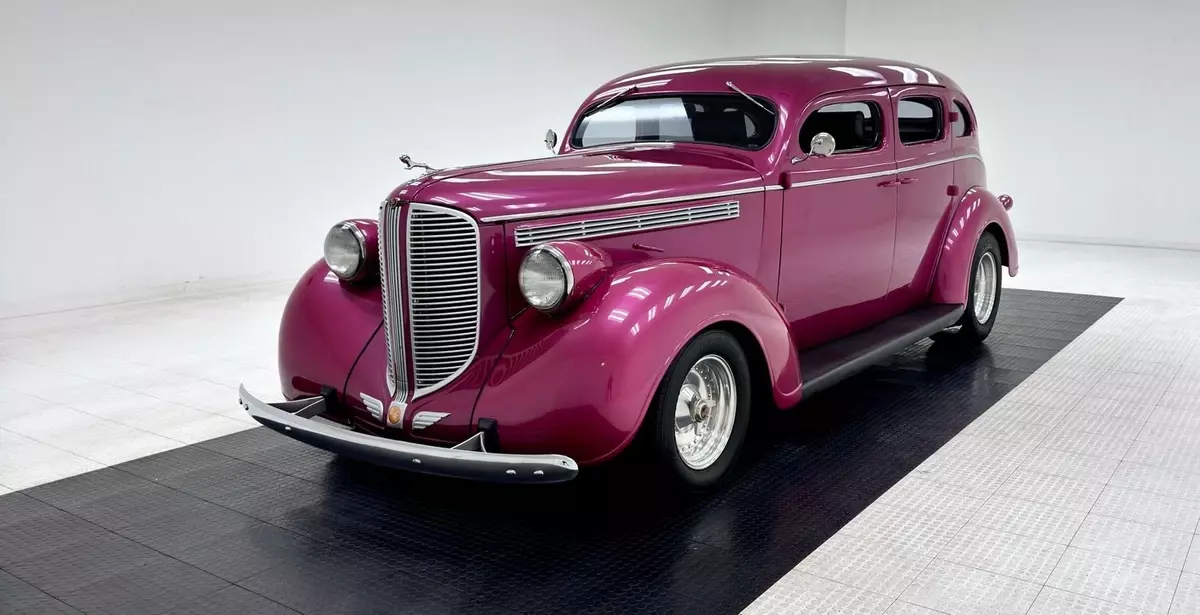 1938 Dodge Six Series D8 4 Door Sedan For consignment, a 1938 Dodge Six Series D8 4 door sedan showing 16,888 miles which are not actual. This is a street rodded version with the heart of a Chevy, the suspension of a Ford, and a Holley Sniper fuel injection system to get it all going. Exterior The overall shape of the big car makes a statement and the color of the car puts an exclamation point at the end! This is Magenta, from tip to tail, it is covered in a two stage pinkish purplish hue that would have been so foreign in 1938, Orson Wells could have used it as the alien spaceship in his War of the Worlds broadcast of that same year! "They arrived in a magenta Dodge..." his show would start. Meanwhile, a terrific profile awaits, with a chopped top, suicide rear doors, a trim piece that descends with the slope of the rear body line accentuating the humped trunk in back. Up front, a locomotive-like facade begins with a three part grille, winged accents, and protruding chrome bumper that could serve as a cow catcher. The leaping ram hood ornament is also depicted on a low yellow seal while blue dot tail lights add even more color to this magenta monster. Polished aluminum wheels are of different size and width as the back ones reach deep under the fender. The excellent paint takes in all door handles and the metalwork is very nice. Imperfections include numerous areas of bubbling down low. Interior Our ram reappears, embroidered on the gray ultraleather door inserts of the front doors and opening the suicide doors in back reveals a similar pattern of various shades of gray and white, (sans rams), on well designed panels. Bucket seats in front wear tweed cloth with ultraleather sides and power operation for the driver, while the back bench is clean and offers plenty of head and leg room. A Grant GT steering wheel fronts a smooth, magenta dashboard housing VDO gauges ahead of a polished steering column, then some old school Dodge trim in the center wears the Sniper screen and meets a more modern center stack unit with a JVC AM/FM/CD stereo with Bluetooth and a panel of wood veneer that waterfalls down to the B&M shifter. Gray carpet covers the floor and the headliner is made of tweed. The trunk is huge and lined with tweed and carpet and could transport a flock of ram lambs. Drivetrain Lots of bling and polished parts in the engine bay where we find the 350ci V8 with a mild cam putting out 300 horsepower according to our consignor. It's fuel injected via the Holley Sniper system which is bolted to an Edelbrock intake manifold. A TH350 3-speed automatic transmission sends power to the Ford 9" in back and ceramic headers make quick work of the spent fuel. Power brakes are found as front disc and rear drums. Undercarriage Clean and bone dry underneath with only minimal surface rust in spots. The dual exhaust carries FlowMaster mufflers and then the pipes go east and west to exit in front of the rear wheels on each side. A Mustang II front end handles the suspension there while leaf springs handle the back. No grease or even road dirt underneath, just uniform flat black coverage on a very nice underside. Drive-Ability Despite the 4" chop, the interior is airy with lots of room to move around. The 350 cranks to life with no complaints and emits a pleasurable exhaust note as we steer the big car onto the test loop where we find acceleration satisfactory, good braking, and nice handling provided by those meaty tires. There's not much to go wrong here and all functional items on the car operated as intended. While Classic Auto Mall represents that these functions were working at the time of our test drive, we cannot guarantee these functions will be working at the time of your purchase. Our consignor says, "nice cruiser" and we confirm his assertion! This is a big, comfortable, well sorted car that doesn't need much and will cause rubbernecking wherever it happens to turn up. There's plenty of fun to be had with this car and the magenta color adds a unique kick to the party. Throw the kids in the back, (seats, not trunk), and head out to cruise night, or the drive-in at Chick-fil-A, or drop them off at school. No kids? No worries. It only takes a party of one to enjoy this ride! Classic Auto Mall is home to more than 1,000 classic and collectible vehicles for sale via consignment in a climate controlled 336,000-square foot showroom (that's more than 8 acres!). The largest single location consignment dealer of classic and collectible vehicles in the country is located in Morgantown, Pennsylvania, just 1-hour west of Philadelphia off Exit 298 of the I-76 Pennsylvania Turnpike. For more information visit or call us at 610-901-3804. Contact us anytime for more information or to come see the vehicle in person. There is no guarantee of mileage. A $299 Dealer Administrative fee is not included in the advertised price. With so many great cars, you know we have a lot to talk about, and we do that each week on the Classic Auto Mall Podcast with host Stewart Howden. Stewart discusses new inventory as well as trends in consignments and car prices, while interviewing celebrities and automotive professionals about amazing cars and their history. Tune in each week to the Classic Auto Mall Podcast wherever you enjoy listening. You can also watch on YouTube!