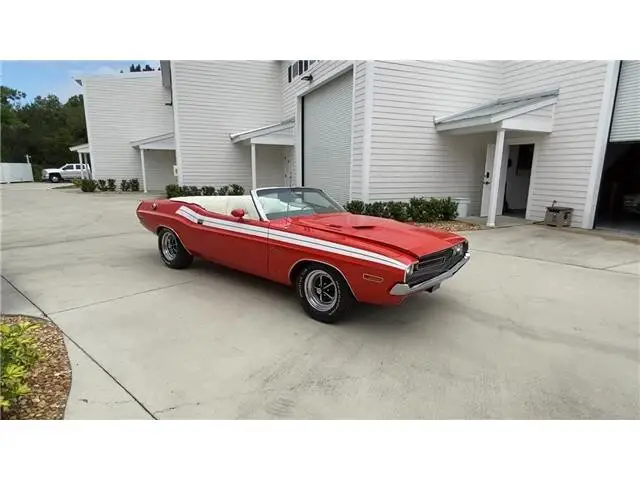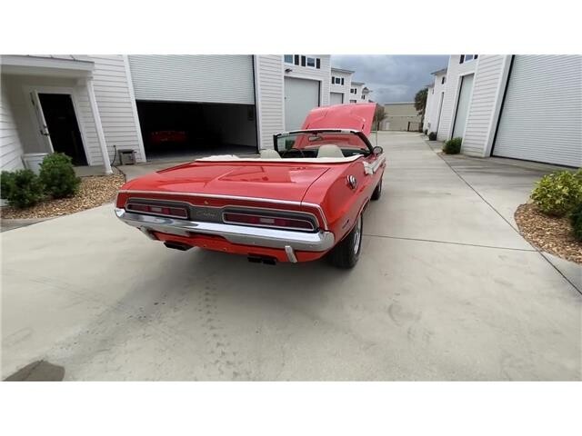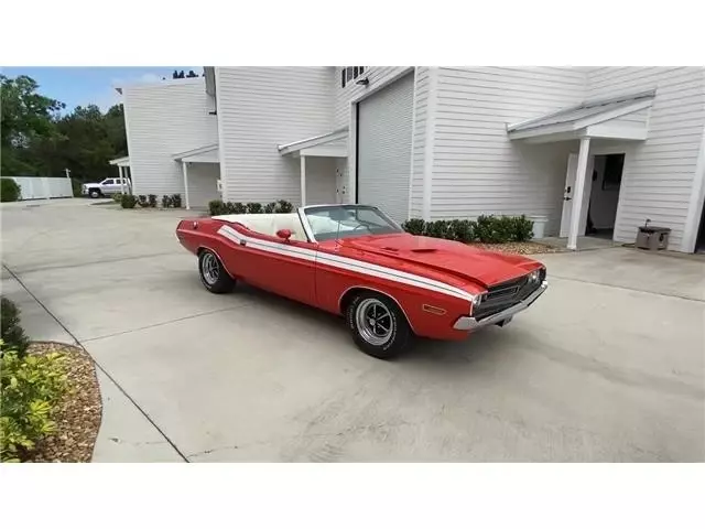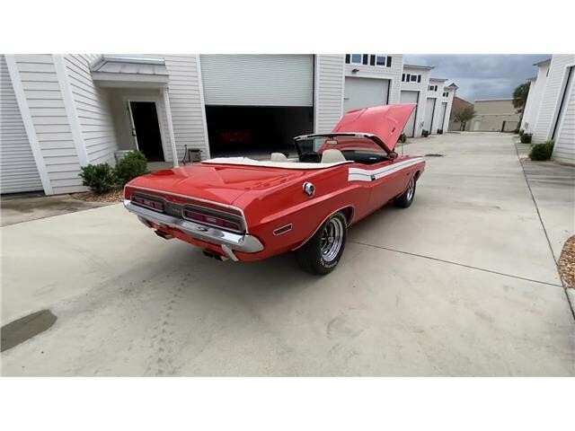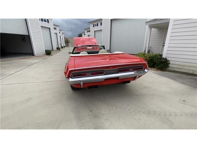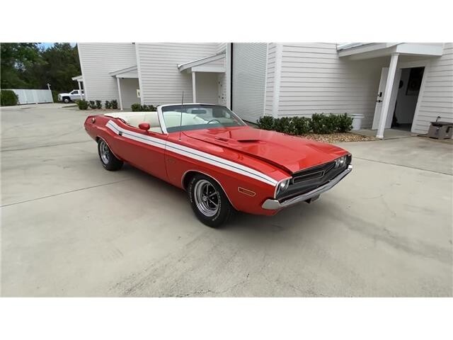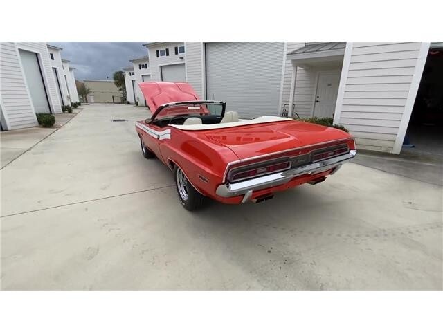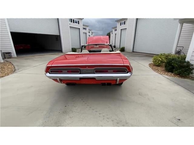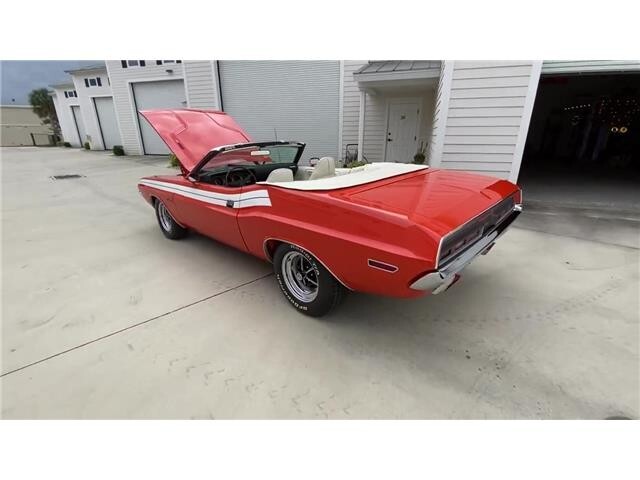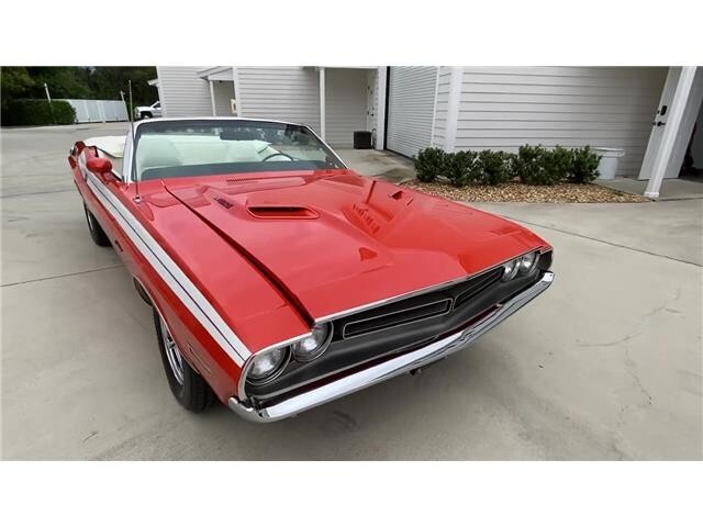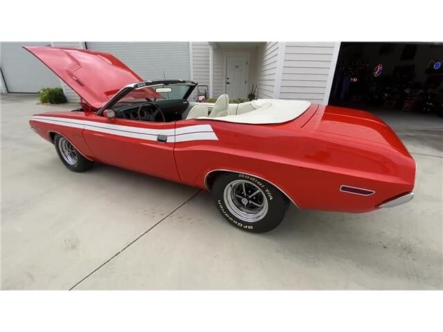 440ci V8 with triple Holley two-barrel carburetors, paired with a TorqueFlite 727 three-speed automatic transmission. It’s finished in orange with white stripes over a white vinyl interior and features a white convertible top, 15? Magnum 500-style wheels, power front disc brakes, and an AM radio. Originally delivered in Hemi Orange (EV2), the car received new sheet metal in the fender wells and trunk before being repainted. Additional details include chrome wheel arch moldings, body-color mirrors, a sport hood with 440 Six-Pack badging, and BFGoodrich Radial T/A tires.