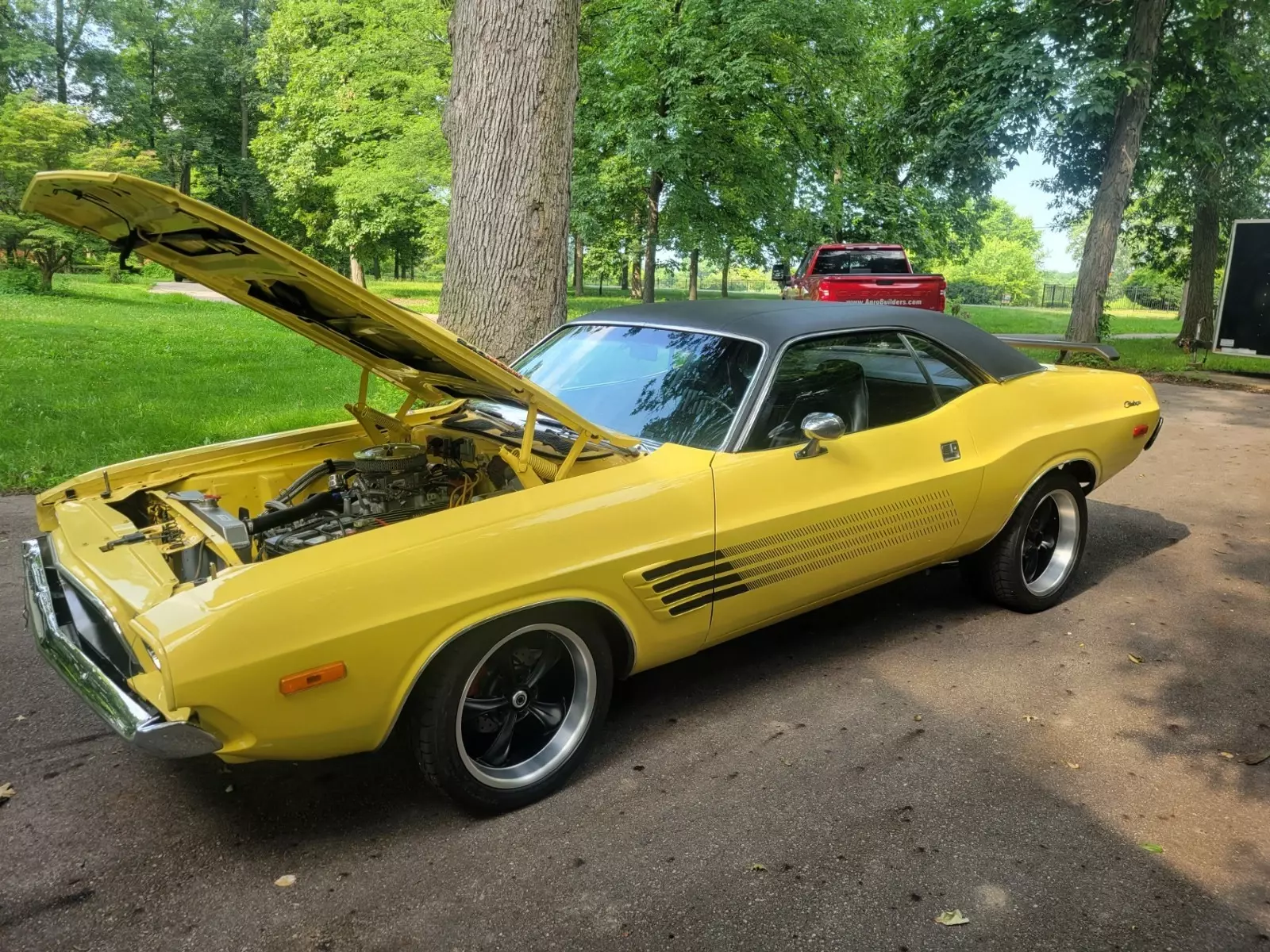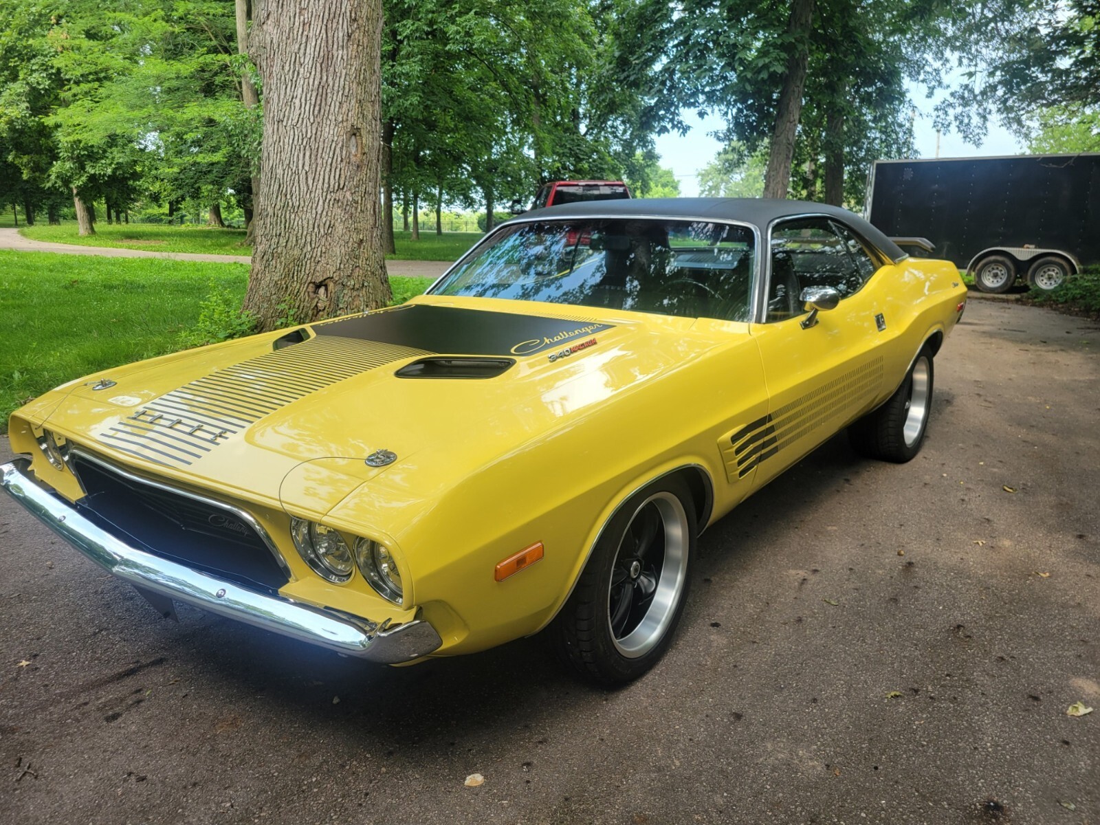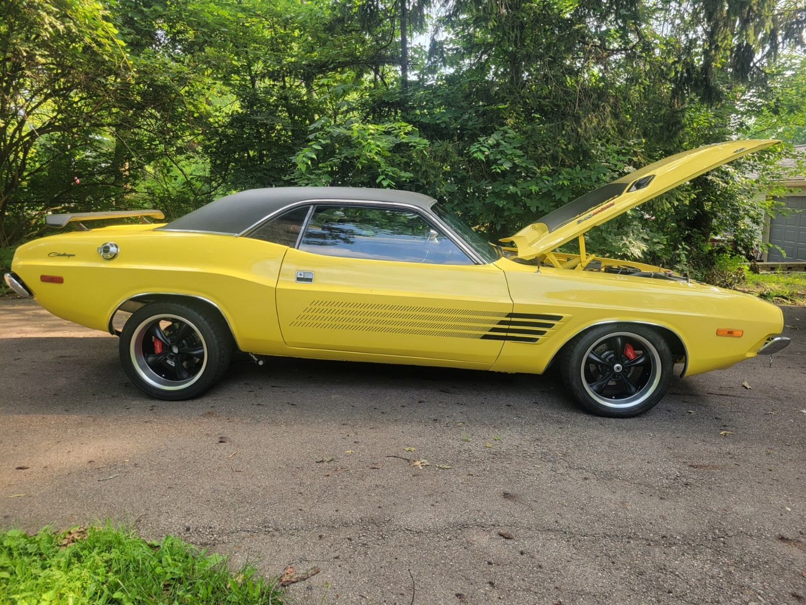 1973 DODGE RALLYE CHALLENGER RESTOMOD. COMPLETE RESTORATION IN 2023. FACTORY COLOR ( TOP BANANA ) WITH PERFORMANCE HOOD, 408 CRATE STROKER MOTOR WITH 530 HP AND 535 FT POUND TQ. 50 TOTAL MILES ON MOTOR. EVERYTHING NEW,ORIGINAL PISTOL GRIP 4 SPEED MANUAL SHIFTER AND TRANS. BLACK ORIGINAL INTERIOR, BUCKET SEATS, MOSIER CUSTOM BUILT POSI REAREND WITH 410 GEARS AND COIL OVERS. STRANGE 4'' DRIVESHAFT, WILWOOD DISK BRAKES ALL ( 4 ) WHEELS, 18'' TIRES ON REAR, 17'' TIRES ON FRONT, HEADMAN HEADERS WITH 3'' EXHAUST, HAYES COMPETITION CLUTCH AND PRESSURE PLATE, BLACK VIYLY ROOF. EVERYTHING UNDER CAR NEW. FRAME TIED, BEAUTIFUL CAR AND VERY FAST. TO0 MUCH TO MENTION A MUST SEE CAR ! ALSO HAVE ORIGINAL NUMBERS MATCHING 340 ENGINE TO GO WITH BUYER. SERIOUS CALLS ONLY.