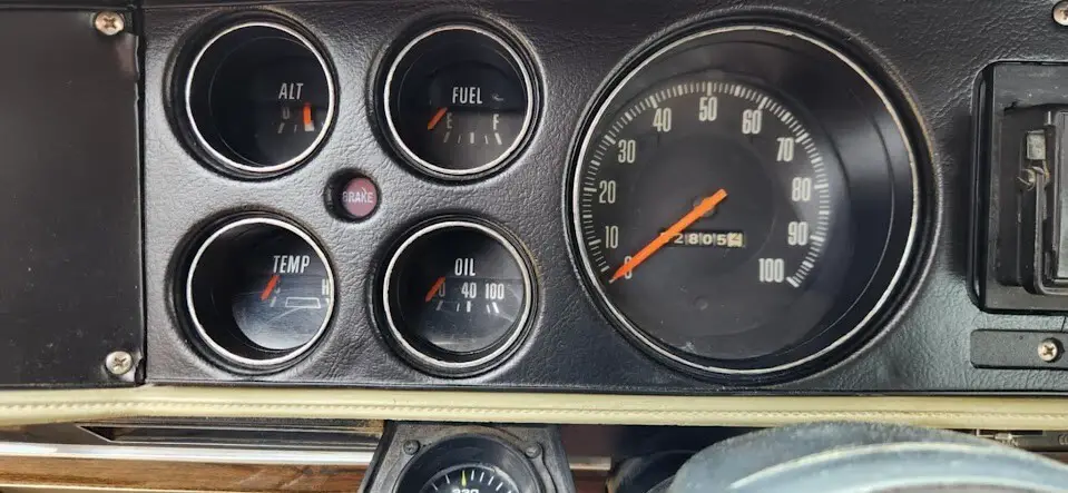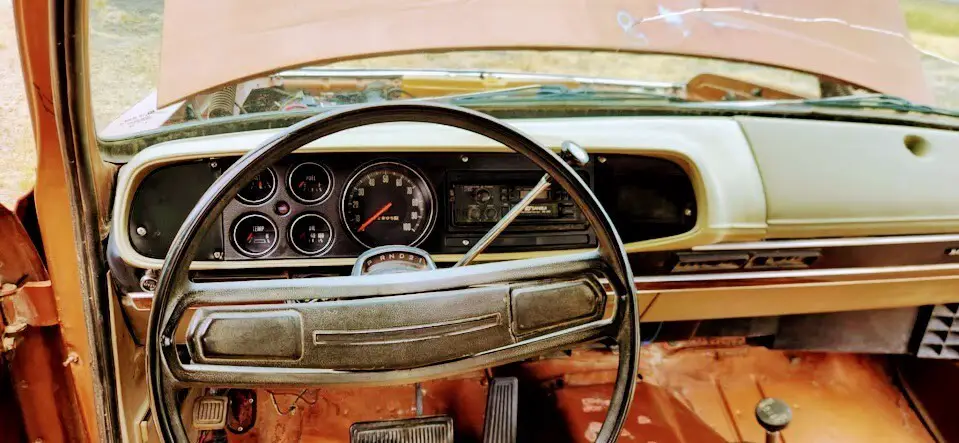 Braking is provided by power-assisted front discs and rear drums. The two-spoke steering wheel fronts a 100-mph speedometer and auxiliary gauges. The five-digit odometer shows 52k miles, so it’s likely rolled over. All the lights and gauges work as they should, which is also rare. LOL