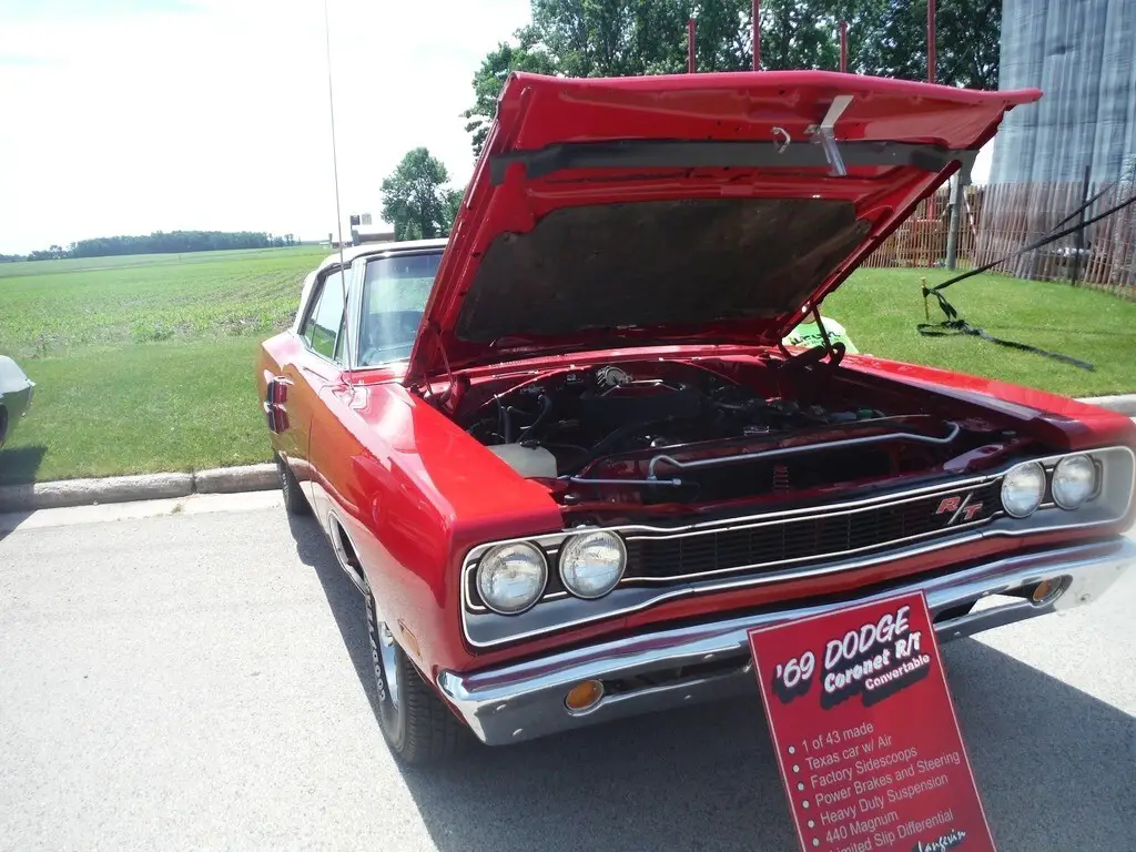 1969 Dodge Coronet R/T Convertible (1 of 43) For Sale in Algoma, WI 54201 This Rare Coronet is powered by a 440 Magnum V8 engine paired with a 3-speed automatic TorqueFlite transmission. It has 69,000 miles and is shown with a red exterior and a black interior. This vehicle has been well-maintained. Features 1 of 43 Made with Factory A/C Factory Side Scoops Heavy Duty Suspension Power Steering Power Disk Brakes Limited Slip Differential 440 Magnum 6 Pack Internals 6 Pac Rods (much heavier than stock 440 rods .060 overbore