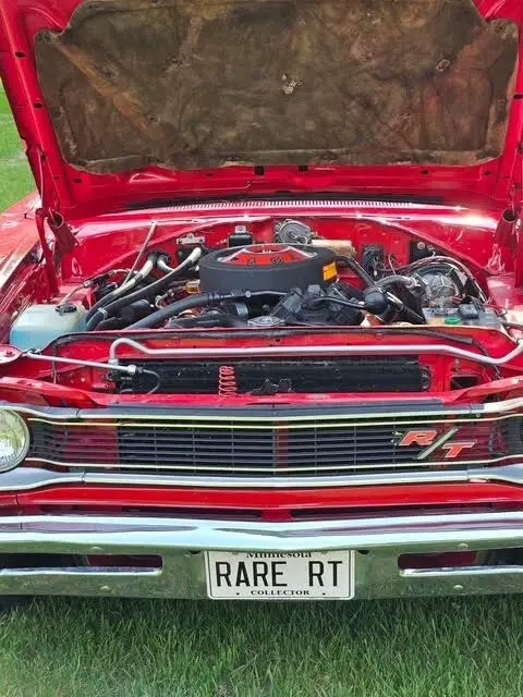 This Rare Coronet is powered by a 440 Magnum V8 engine paired with a 3-speed automatic TorqueFlite transmission. It has 69,000 miles and is shown with a red exterior and a black interior. This vehicle has been well-maintained.