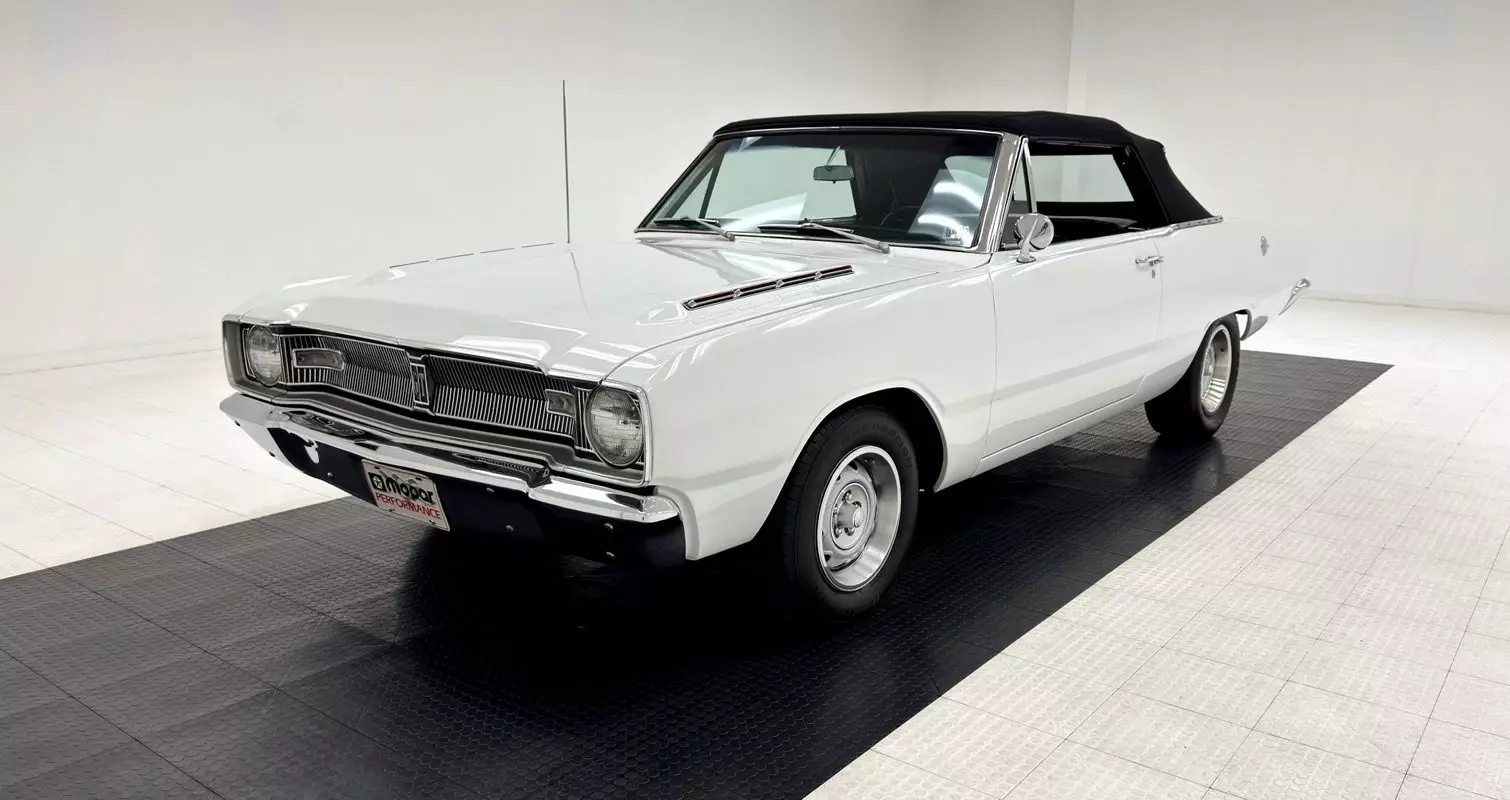 For consignment, a 1967 Dodge Dart GT convertible showing 83,064 miles, but the true miles are unknown. This desirable model is a stunner in white and built to the hilt! Dart GT's consistently find new homes when they've graced our halls, and this well sorted car will probably scoot out of here faster than you can say "Mopar or no car!".