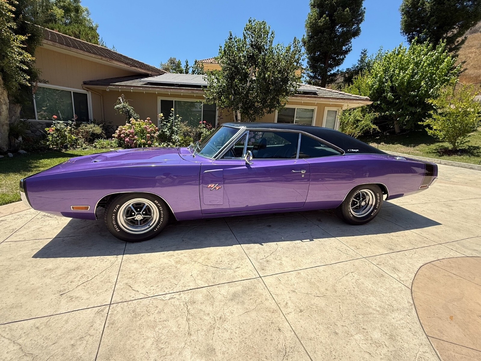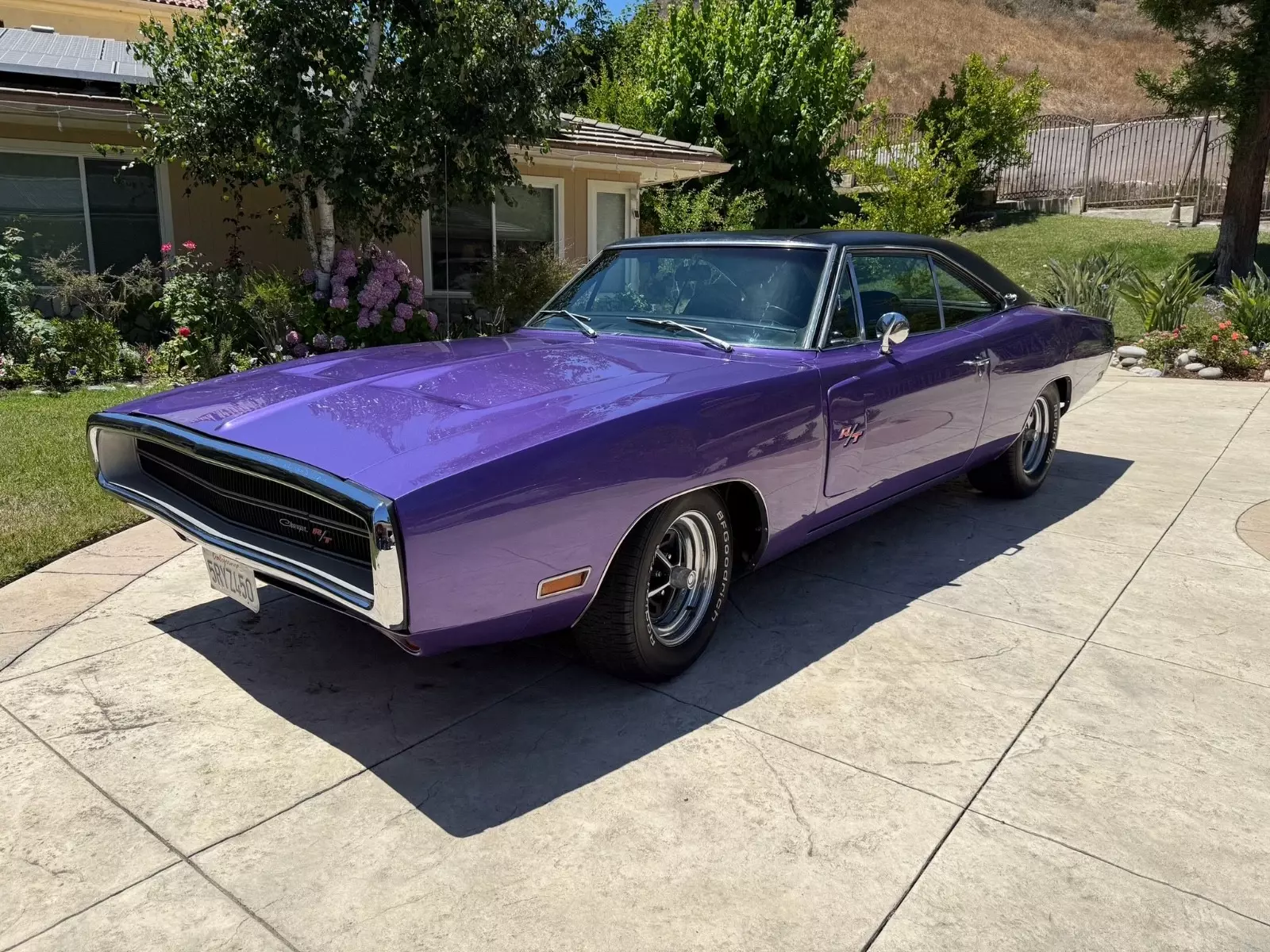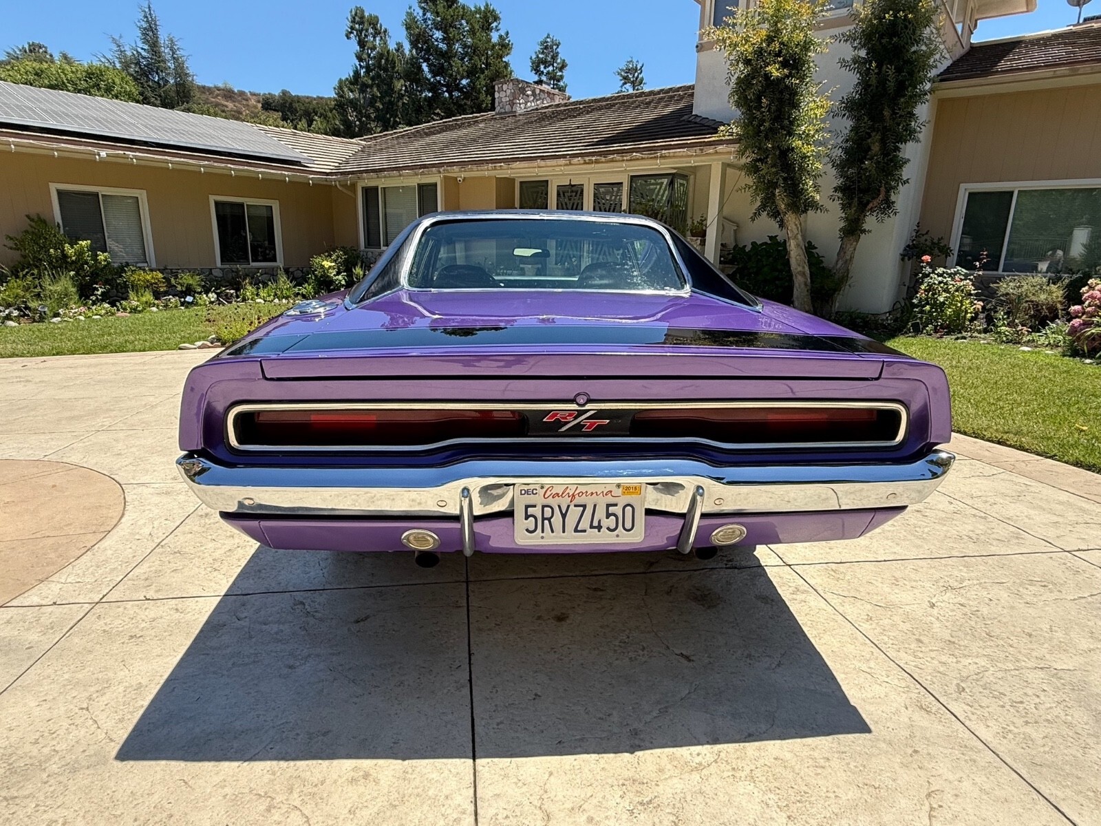 The exterior is finished in Plum Crazy and features a black vinyl roof, hideaway headlights, a black tail stripe, and R/T emblems, and the cabin is trimmed in black vinyl upholstery. Further equipment includes 15″ Magnum 500-style wheels, power steering, unassisted front disc brakes, an AM radio, and an A727 three-speed automatic. We have 2025 invoices and a clean California title.