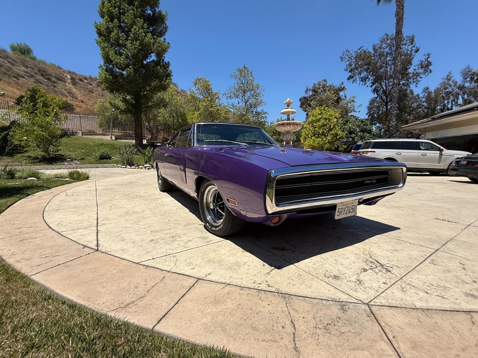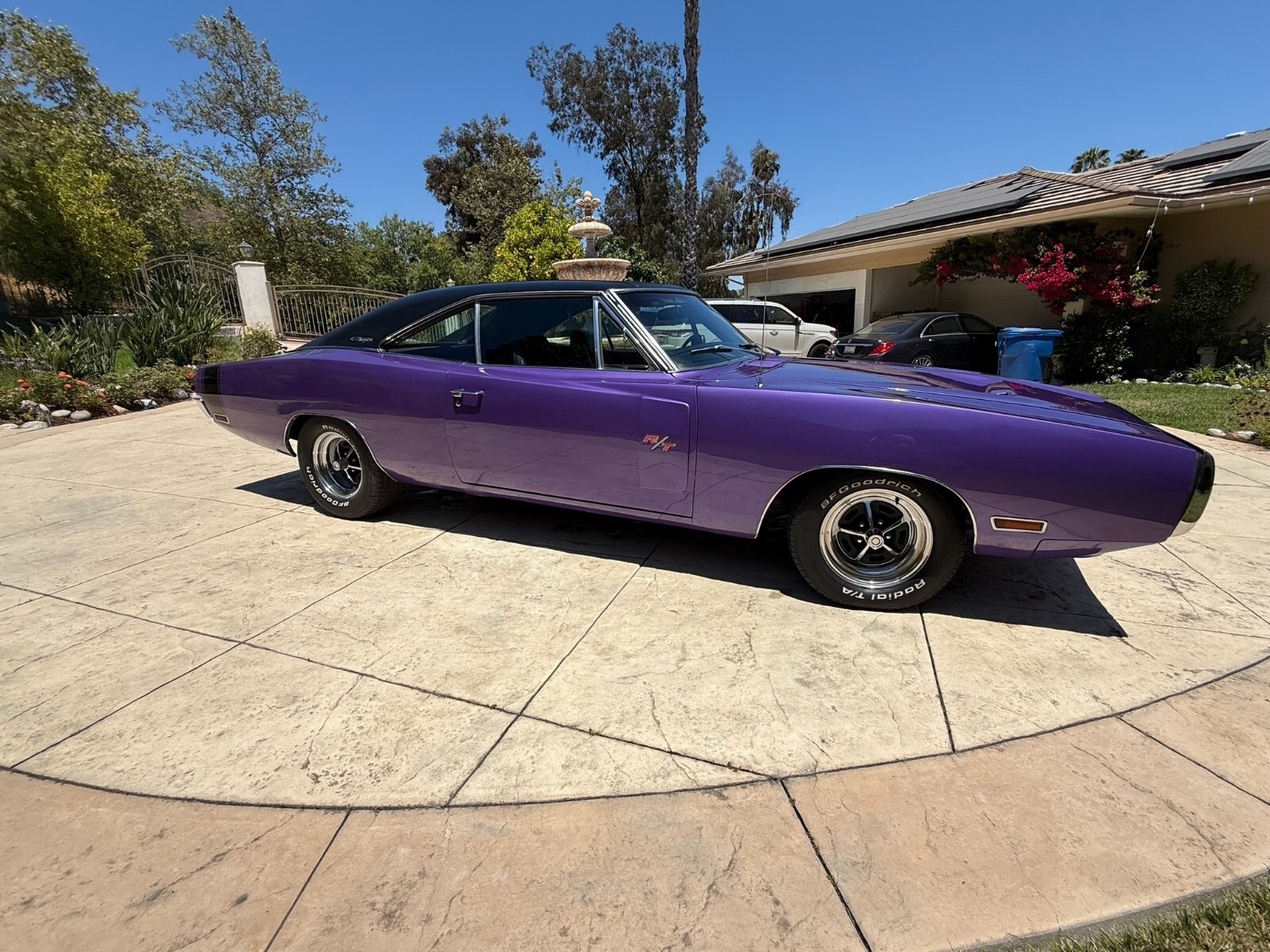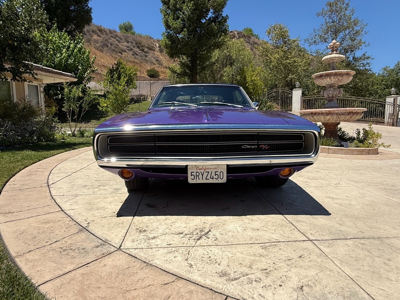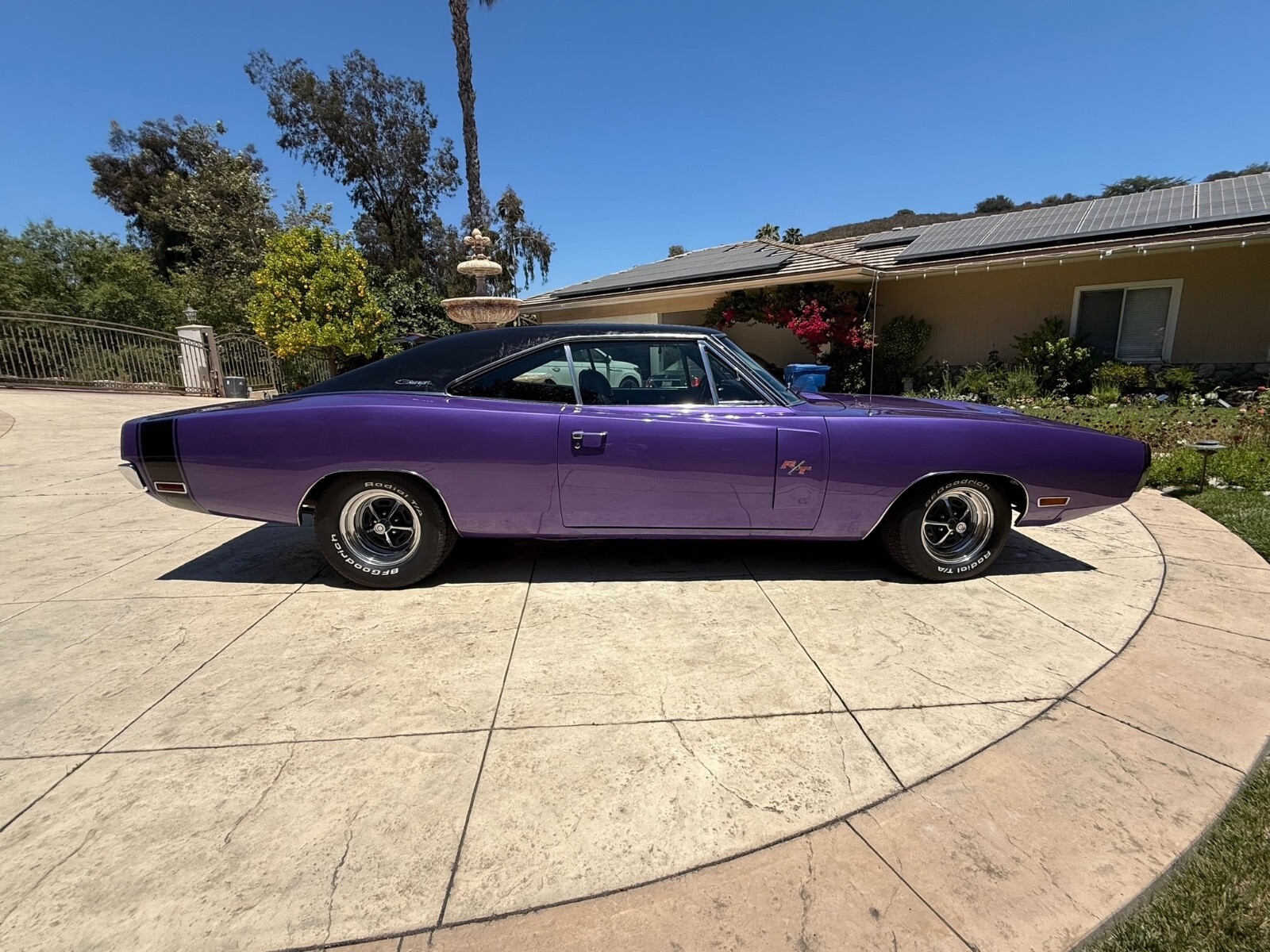 The exterior is finished in Plum Crazy and features a black vinyl roof, hideaway headlights, a black tail stripe, and R/T emblems, and the cabin is trimmed in black vinyl upholstery. Further equipment includes 15″ Magnum 500-style wheels, power steering, unassisted front disc brakes, an AM radio, and an A727 three-speed automatic. We have 2025 invoices and a clean California title.