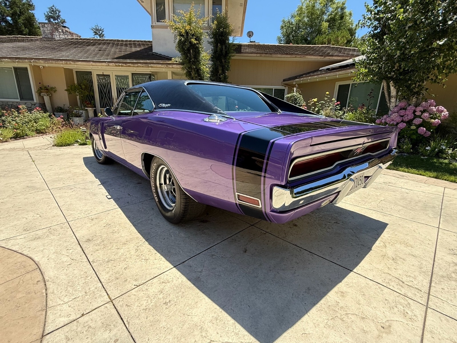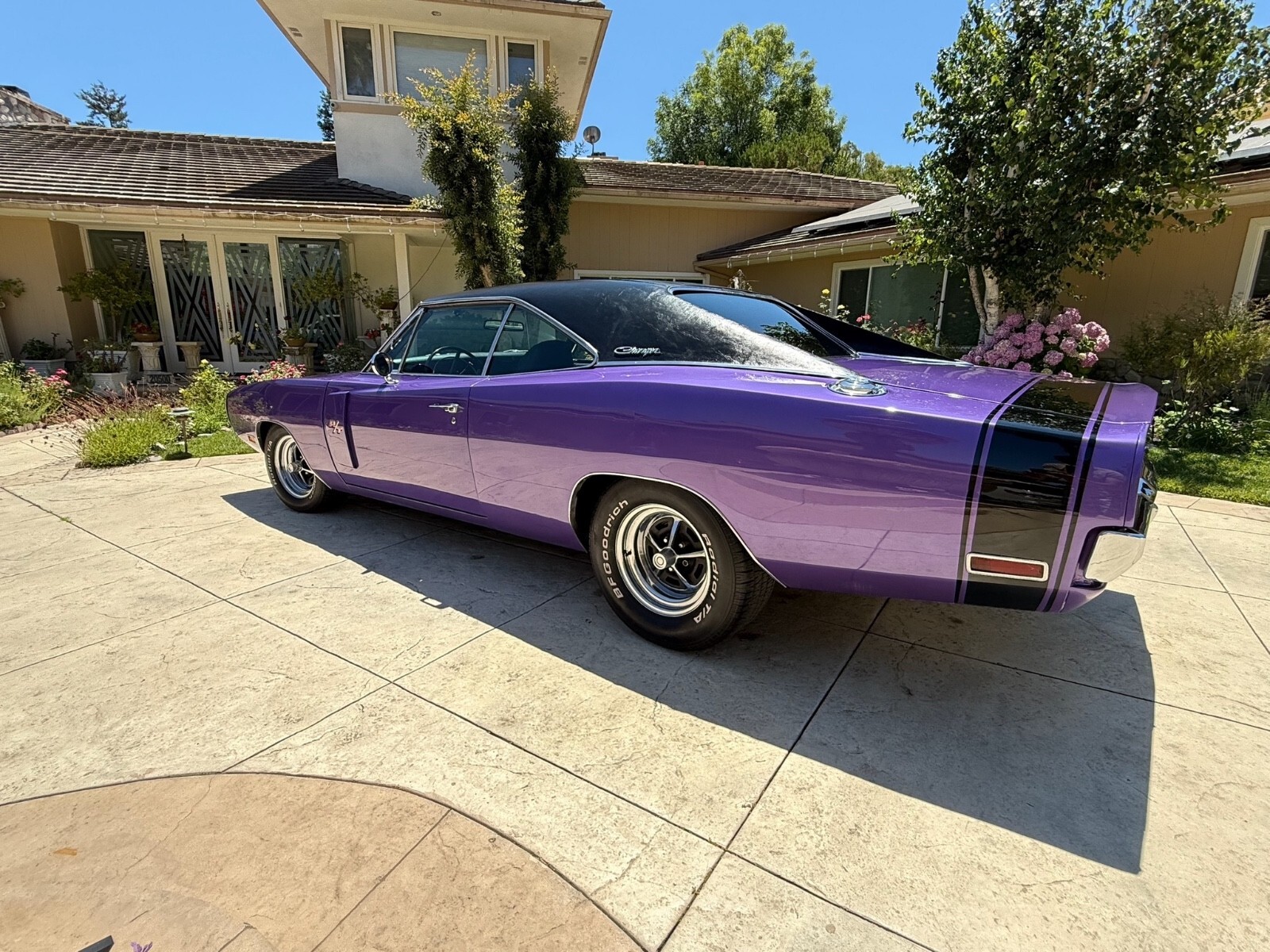 The car left the factory finished in Plum Crazy (FC7) with a black vinyl roof, and it was repainted after dent repairs were completed during the 2025 refurbishment. Styling details include a black tail stripe, hideaway headlamps, R/T emblems, side scoops, and a chrome rear bumper, window surrounds, and trim.