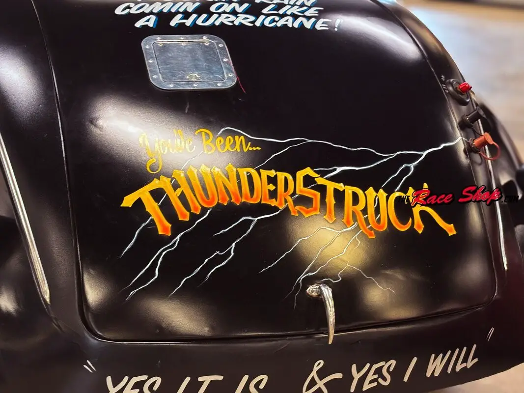 Meet Thunderstruck-a purpose-built, all-attitude 1937 Dodge drag coupe that's been transformed into a full-on track animal. Built on a square tube chassis with 4-link rear suspension, this thing hooks hard and handles like a dream for a car that's straight out of a gasser's fever dream.