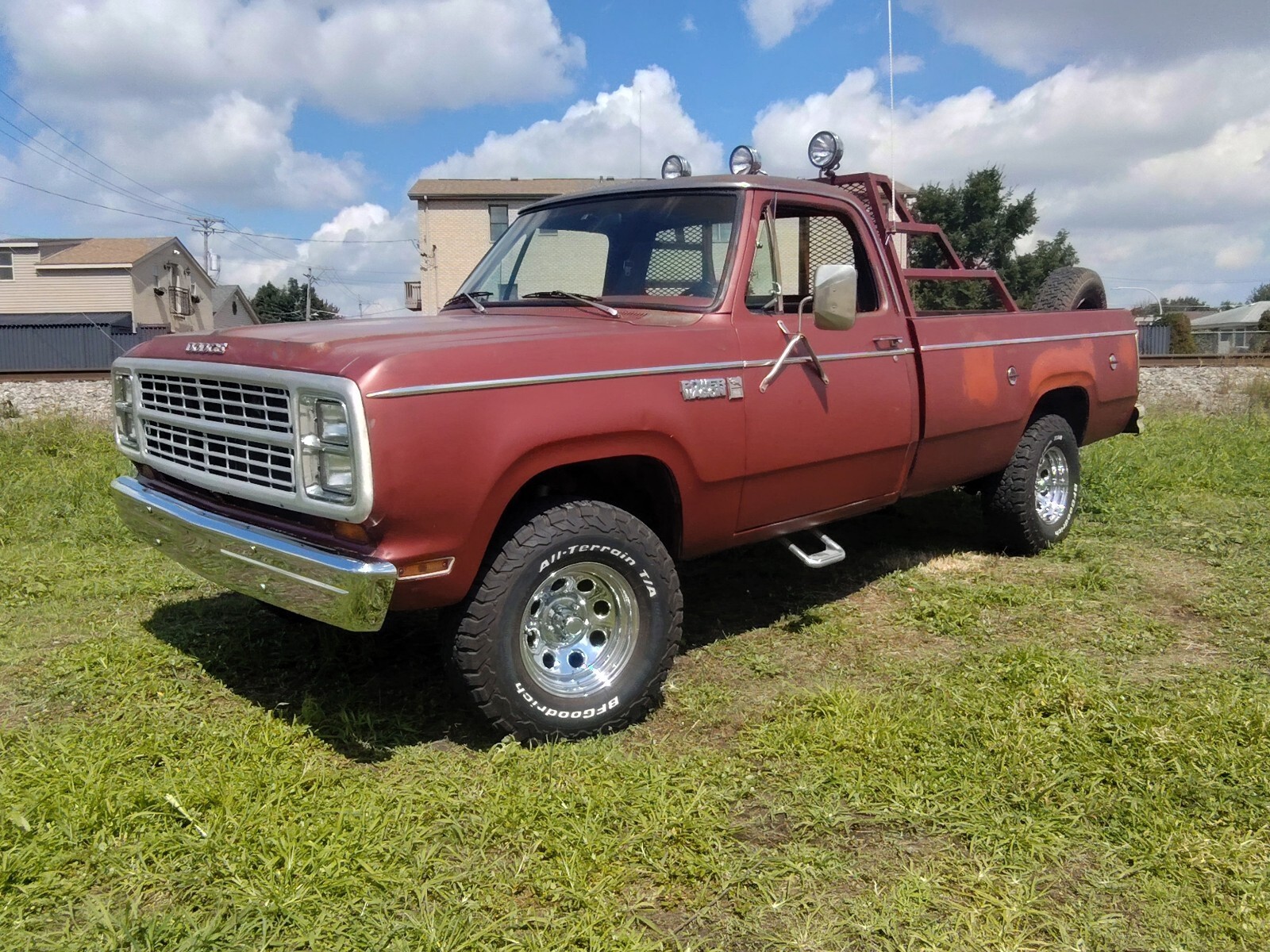 1979 dodge truck 360 auto custom roll bar KC lights CB radio cowboy hat rack and heated seats custom cup holder really cool truck west Coast truck so no rot, exterior is clear coated Mat patina look really cool tuff truck this is an old truck that runs and drives really good breaks, tires undercarriage all in great shape. Wheel arches are clean and solid.