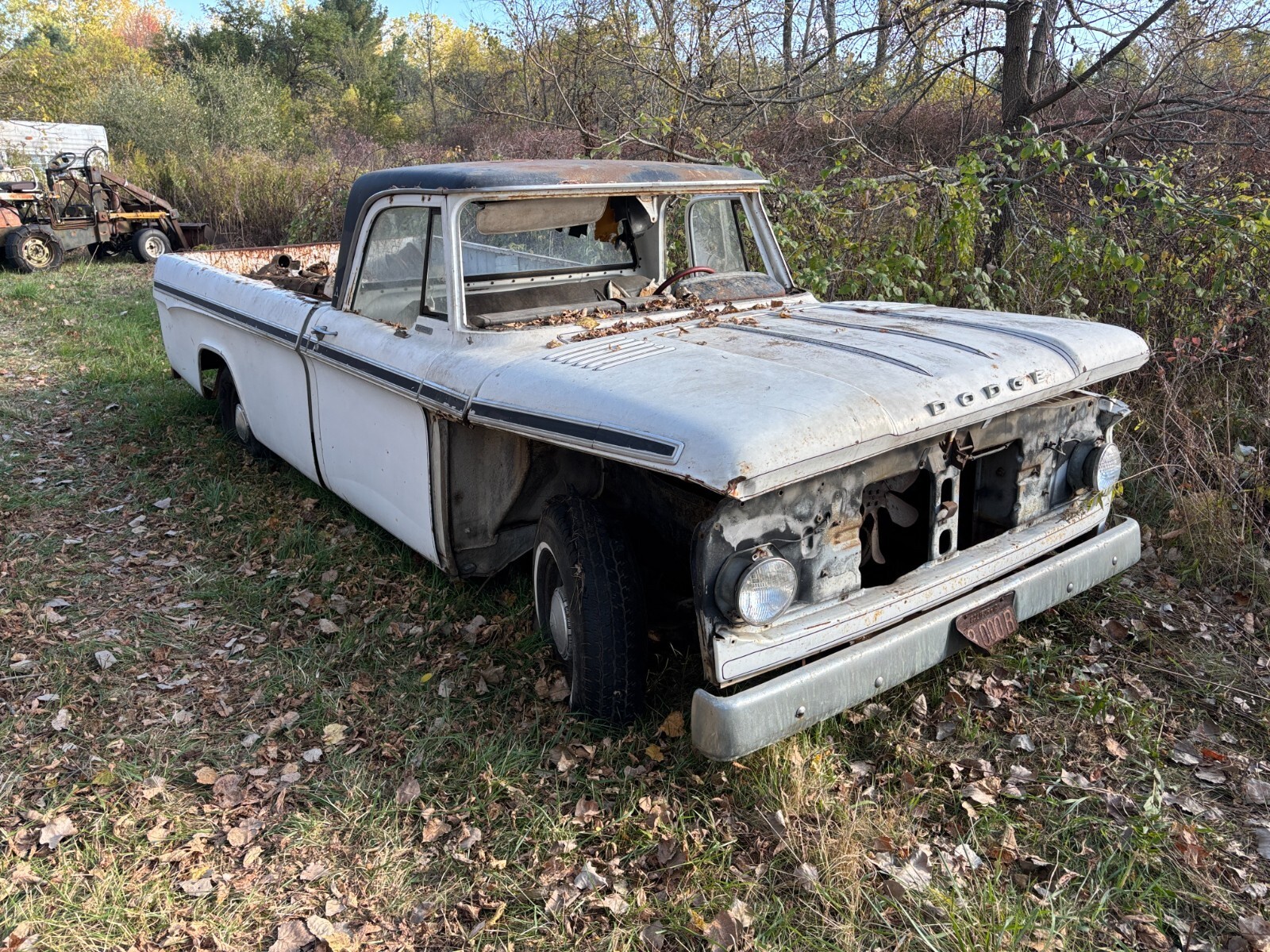 For offer is a 1970 Dodge D100 pickup. To my knowledge this pickup was purchased from California in the mid 1980s and has been stored in a barn until recently taking it outside for the attached pictures. I do not have any history of it running. The body and frame on this pickup appear to be in good solid condition.