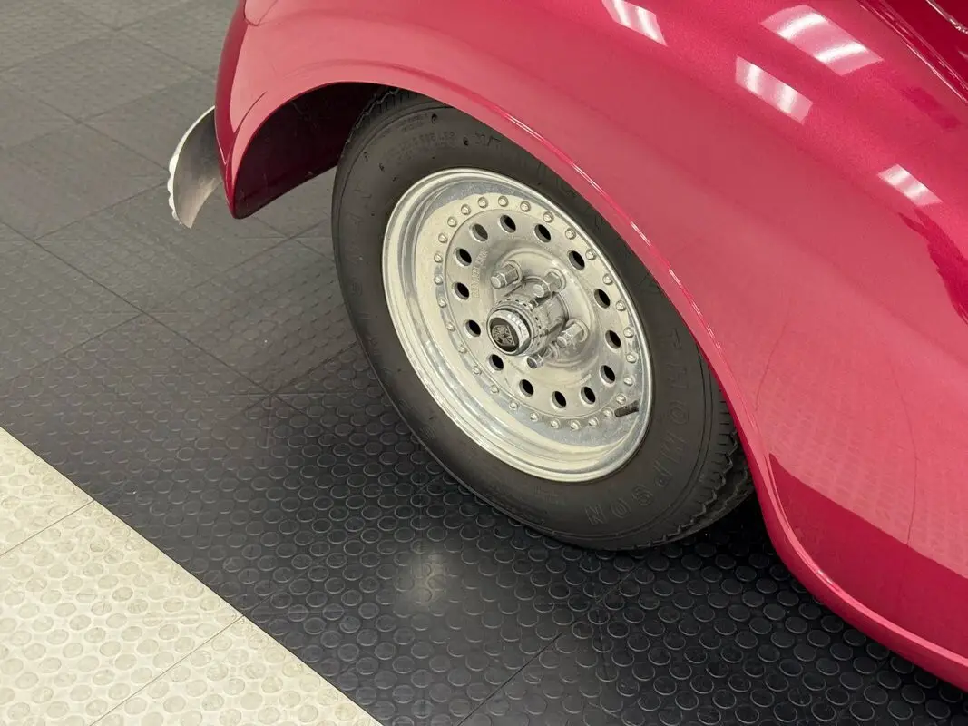 Burgundy door panels include a vinyl upper half, stitched cloth lower, and billet style hardware and both present cleanly. 80s/90's era bucket seats in burgundy velour occupy the front and other than some compression, remain clean and intact. Behind them is a package shelf and storage wrapped in the same stitched velour and show ready, and this material also covers the tall, center console which has storage bin where a shifter would be and an AM/FM/Cassette radio under the center stack where we find an A/C panel housed in the magenta base. A mid century steering wheel fronts the painted dash which puts an AutoMeter speedometer in front the four more gauges in the center. While here, we noted some rough cut material on the A-pillar outside of the windlace. Tan carpet pieces are on the floor, a burgundy headliner above, and a barren trunk with a tubular boxed gas tank and tubbed wheel wells finish our tour of the interior spaces.