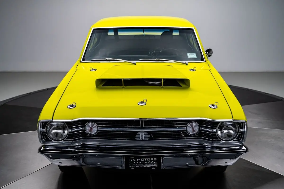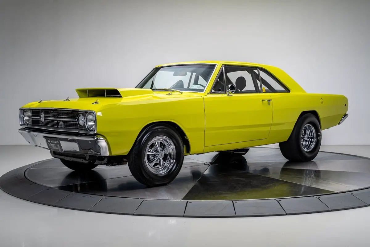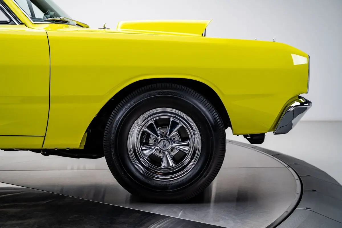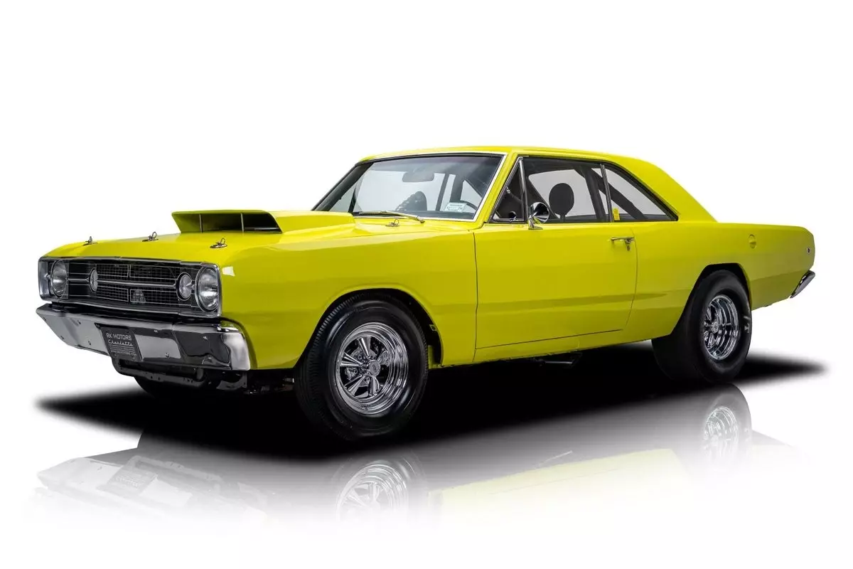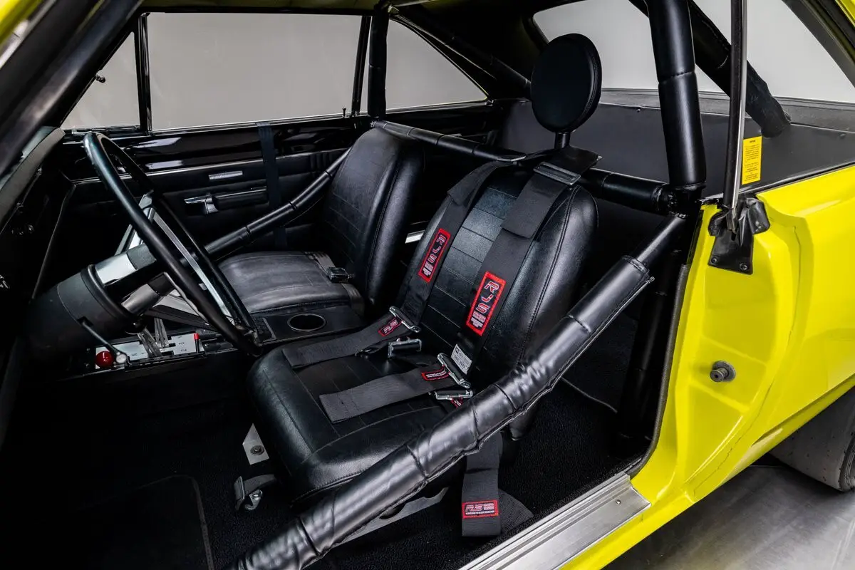 Built from the ground up by SS/AFX (Super Stock and Factory Experimental), this 1969 Dodge Dart transforms the A-body's lightweight simplicity into a street-strip weapon. Finished in bright high-impact yellow, it's powered by a 528-cubic-inch Hemi built on an Indy aluminum block with Stage V heads and a Holley EFI system cleverly disguised as a cross-ram dual-carb setup. A Freddy Brown-built A727 Torqueflite with a trans brake, line lock, and full manual valve body sends power to a Dana 60 rear with 4.56 gears and a spool differential. The AlterKation front end adds tubular control arms, adjustable Viking coilovers, Wilwood disc brakes, and updated steering for sharper response, while the traditional leaf-spring rear keeps the launch old-school. The stance is pure business, with 15-inch Cragar S/S wheels wrapped in Mickey Thompson ET Drags at the rear and BFGoodrich Silvertowns up front. Inside, a padded six-point cage, lightweight buckets, and a custom console with a Lightning Rod-style shifter emphasize purpose, complemented by small modern touches like USB ports, a 12-volt outlet, and a cupholder. With its radio and heater deleted in pursuit of minimal weight, this Dart is stripped, focused, and built to deliver the kind of raw, unapologetic power that defined Mopar's golden era.