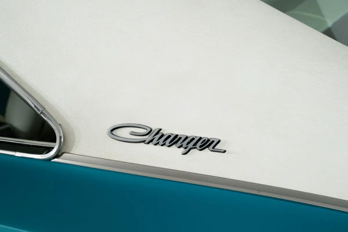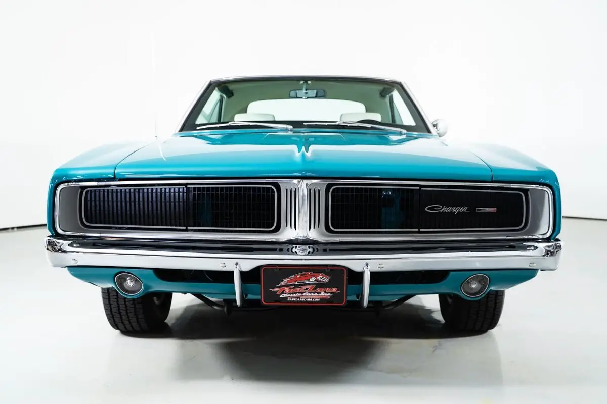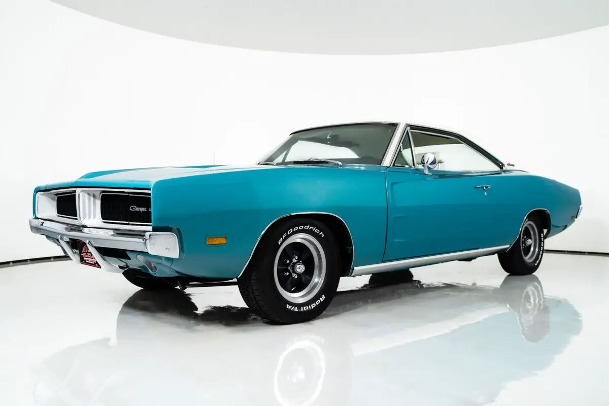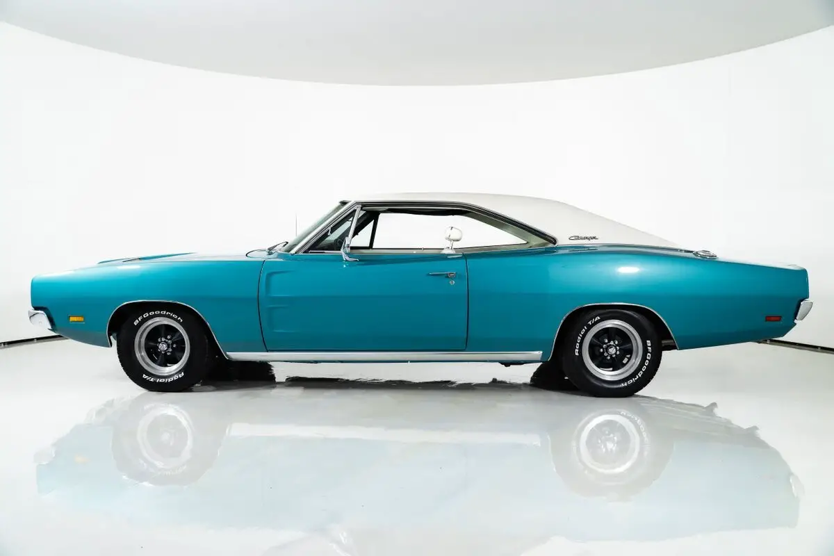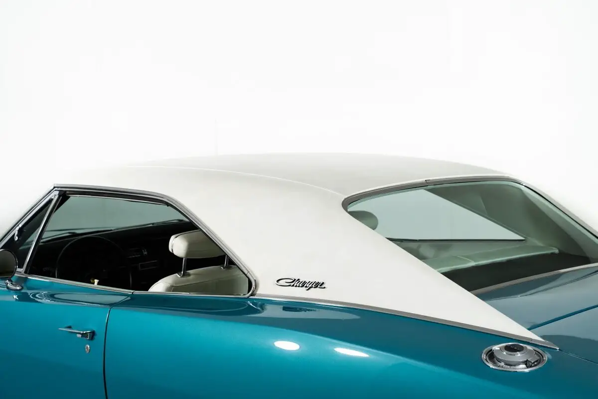 Finished in the factory Q5 Turquoise exterior, this '69 Dodge Charger stands out among Dodge Charger for sale listings. The white and turquoise interior is equally striking, featuring bucket seats, a center console, and a floor shifter that gives the cabin a sporty yet refined feel.