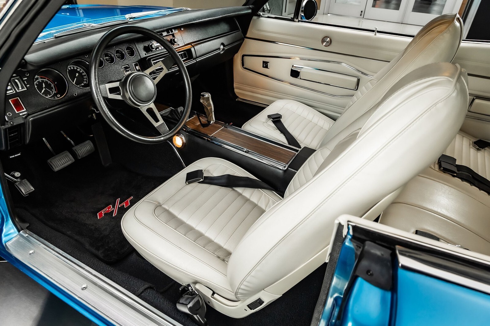 The interior of this Charger is absolutely beautiful! The interior is finished in White Vinyl over Black Carpet & wood trim accents. Up front is bucket seating with a center console featuring the Pistol Grip Shifter! The interior also includes, White Vinyl Headliner, Factory Style Gauges, Radio and Steering Wheel! This Charger also Features a Rear Exterior Tail Stripe and hideaway Headlights along with a Finished Trunk!
