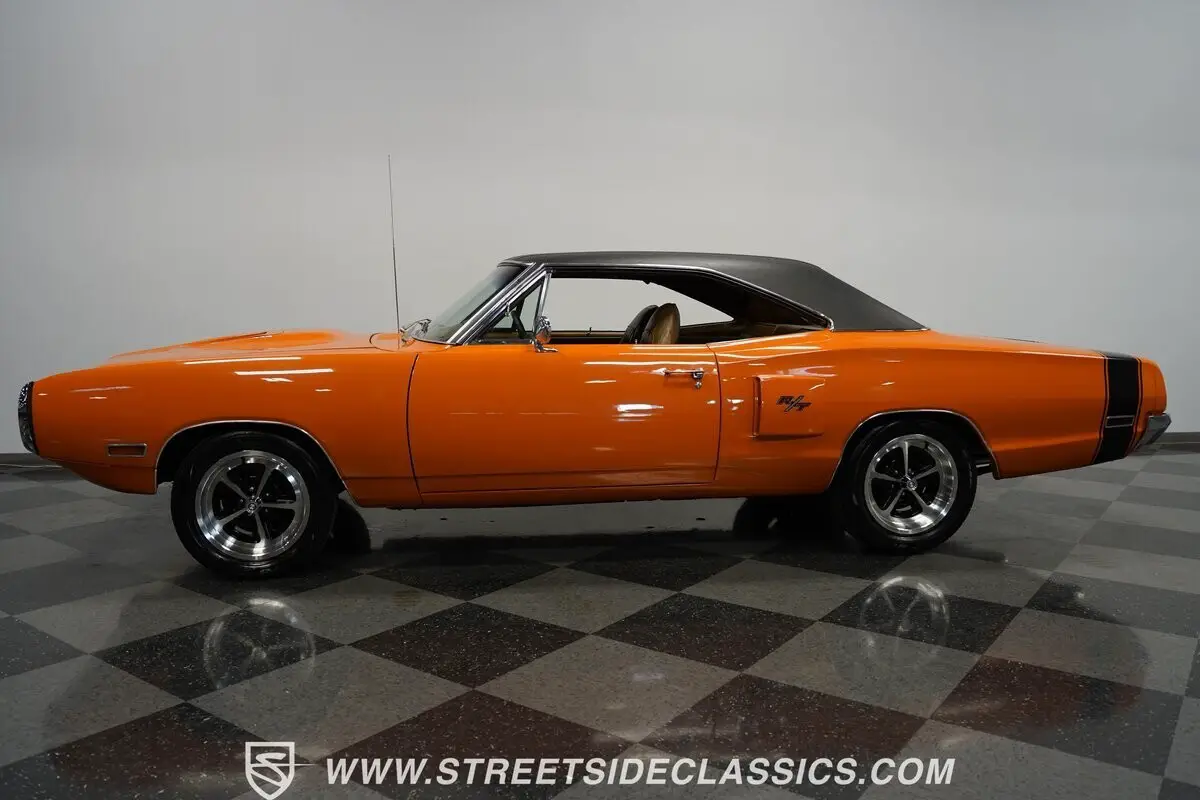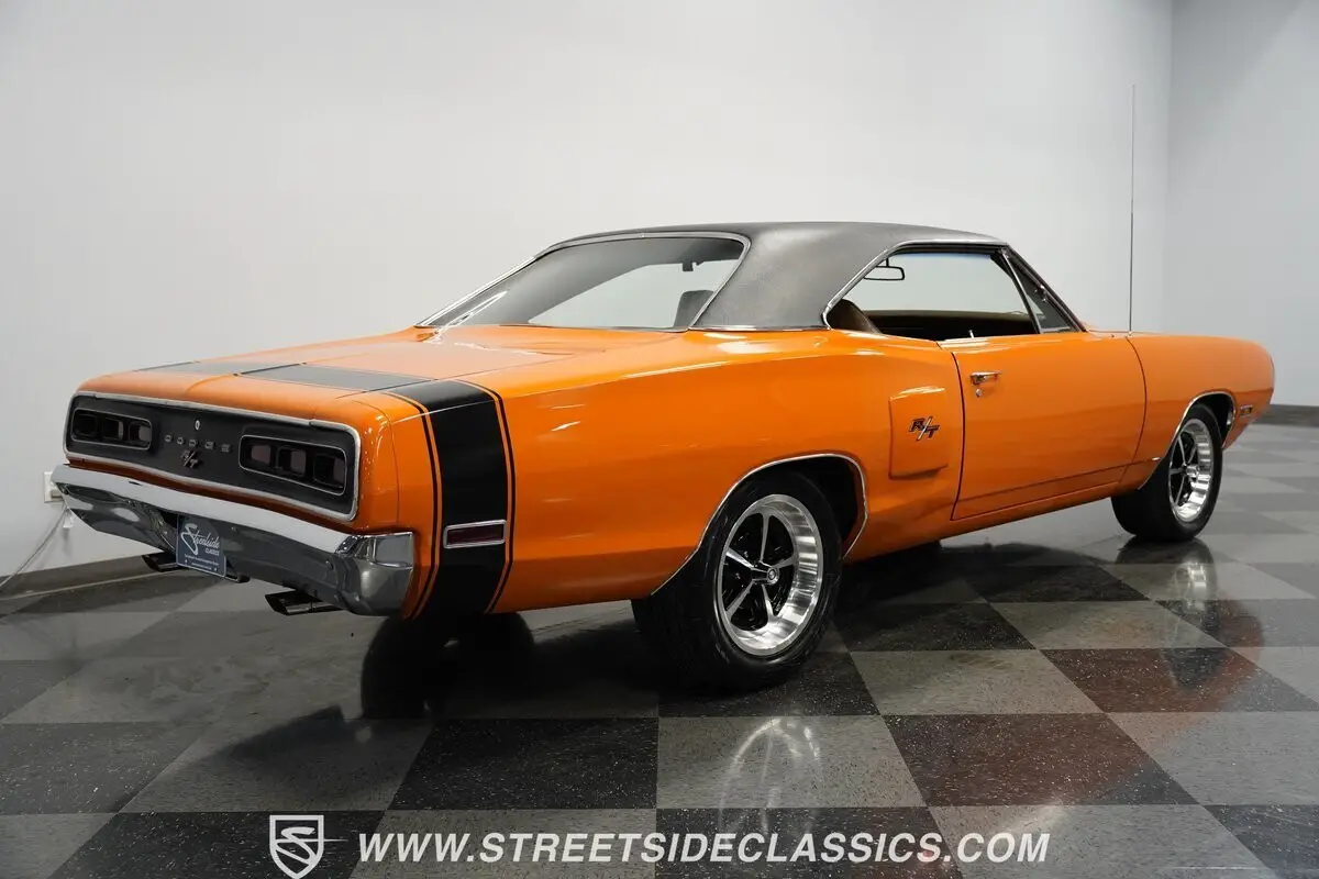This 1970 Dodge Coronet R/T screams street superiority - its Go Mango Orange paint ignites the night while black racing stripes lay down the law on the streets. The hood scoops aren't just for show - they pull cool air straight to where the action happens. Those 17-inch aluminum wheels channel pure Mag 500 DNA, locked and loaded with 255/50ZR17 front and 275/55R17 rear rubber that plants this street warrior firmly on the asphalt. When other cars see that black vinyl top and those quarter panel stripes in their mirrors, they know to move aside.