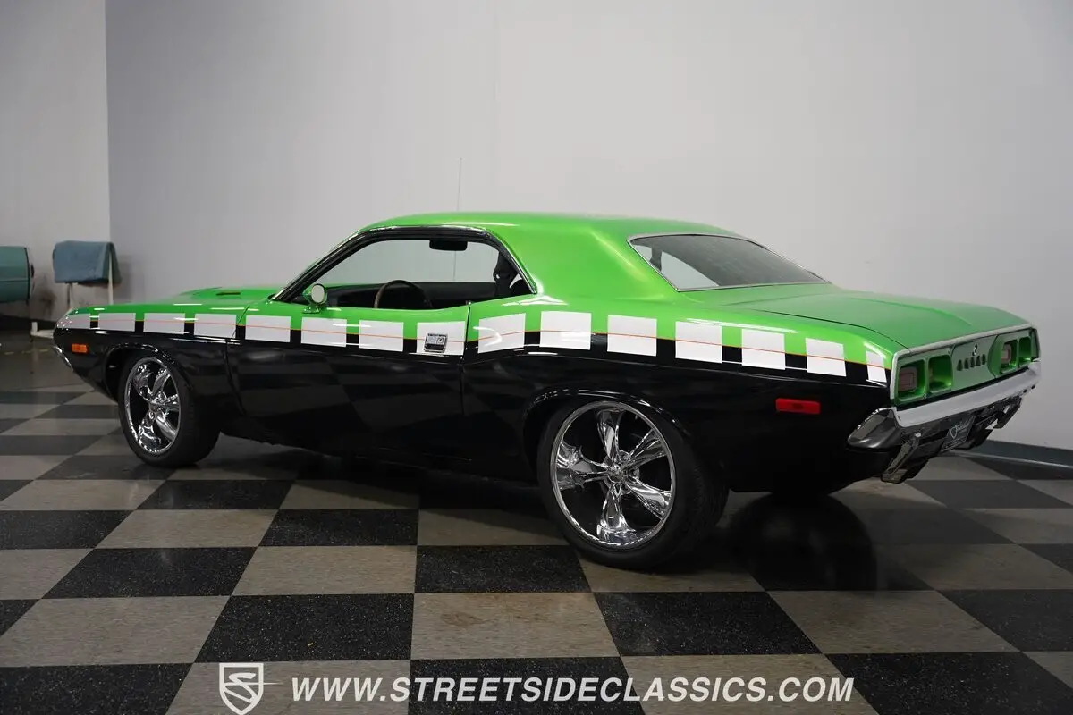 Taking street domination to a new level, this 1974 Dodge Challenger wears an authoritative two-tone paint scheme featuring a deep green primary color accented by menacing black sections and silver racing stripes. The aggressive visuals continue with a muscular stance achieved through staggered Foose wheels - 18-inch diameter up front and massive 20-inch wheels in the rear, fitted with performance-rated 225/45ZR18 front and 275/40ZR20 rear tires. The refined body lines flow seamlessly from the iconic front grille to the signature rear taillights, while gleaming chrome bumpers punctuate both ends. This E-body's visual impact amplifies its street presence through expert craftsmanship and attention to detail.