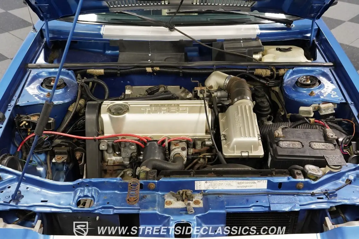 Just like the exterior, there is an impressive two-tone blue and silver presentation on the seats, panels, and carpeting. Even the hatchback's trunk is done to match and looking fantastic. There are nice comfort features like an armrest console, rear defroster, and Chrysler's premium AM/FM/cassette stereo, but what you'll really like is the true driver experience. There are comfortable Shelby Charger logo high-back bucket seats with good bolstering, a grippy steering wheel that also gives you a good view to the full gauges, and the stick shift feels substantial in your hands.