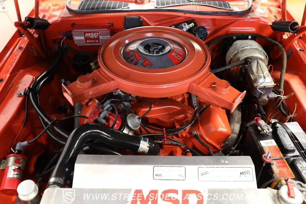 This vintage Dodge's spacious engine compartment is very capably filled by a 440-cubic-inch V8 that features the displacement most of us associate with this model during its heyday. Armed with a Holley Street Avenger 4-barrel carburetor, it's running in fine form, and just a tap on the accelerator pedal will provide a convincing example of its power as it sends a dominant exhaust note out of its pair of Pypes mufflers. The engine is combined with a 3-speed automatic A727 Torqueflite transmission that shifts with slip-free precision, and an upgraded aluminum radiator is now on board to keep operating temperatures under control in more demanding driving conditions. Power steering makes this muscle car easy to navigate, while power brakes that feature discs in front offer the stopping ability you'd want in a spirited ride like this one.