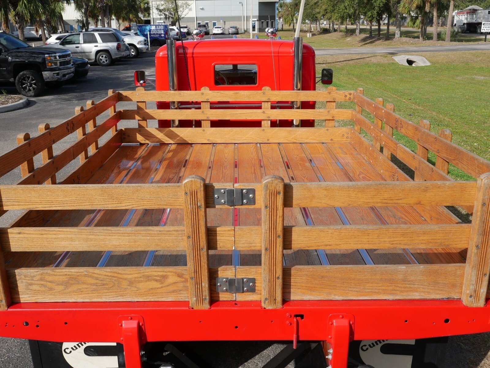 The first thing you notice is the beautiful bright red paint accented nicely with custom gold leaf accents and the Diamond T emblem on the door. The Diamond T brand was considered "the Cadillac of trucks" and this one certainly lives up to that tagline! The chrome front grille and bumper are tasteful and look like they came from the factory. A totally custom wooden stake body, with gooseneckhitch provision, graces the back and looks stunning! The steel flatbed body beneath it has been restored and features LED lighting and Cummins mud flaps! Completingthe look are a custom set of Alcoa 19.5in alloy wheels with custom floating Diamond T center caps. They are wrapped in BF Goodrich 245/70R19.5 tires that have plenty of tread life left in them. The exhaust is routed througha set of custom stainless steel stacks attached behind the cab.