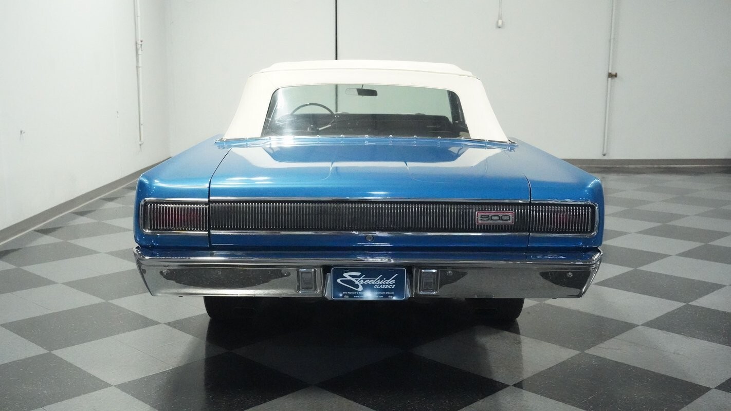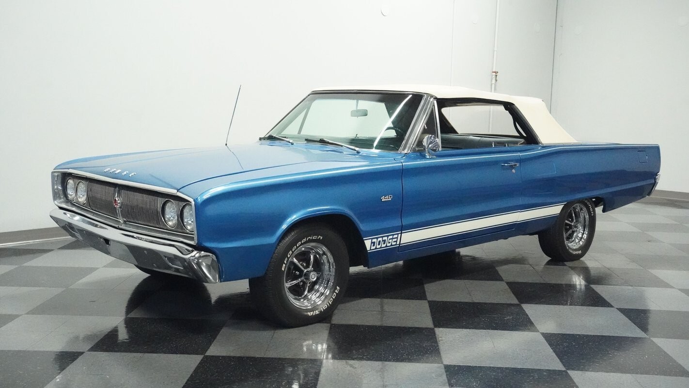 This '67 Coronet 440 ragtop brings serious muscle, being one of just 6,604 convertibles built that year. The deep blue paint and razor-sharp white stripes make this Mopar a certified street brawler. Rolling on classic Magnum 500s - 14x6 wrapped in meaty 215/70R14 rubber, this Dodge has the perfect street stance. The premium Coronet 500 rear badges tell other motorists this ain't your average grocery-getter, while the vinyl top drops at a moment's notice when you're ready to feel the wind.