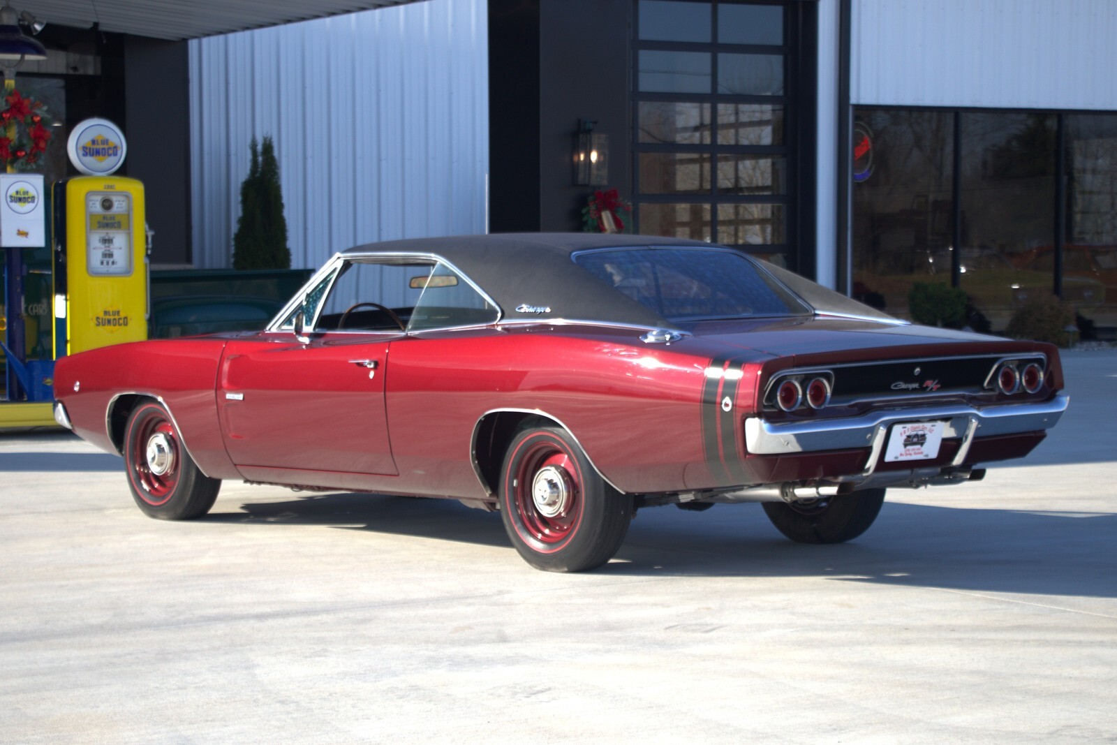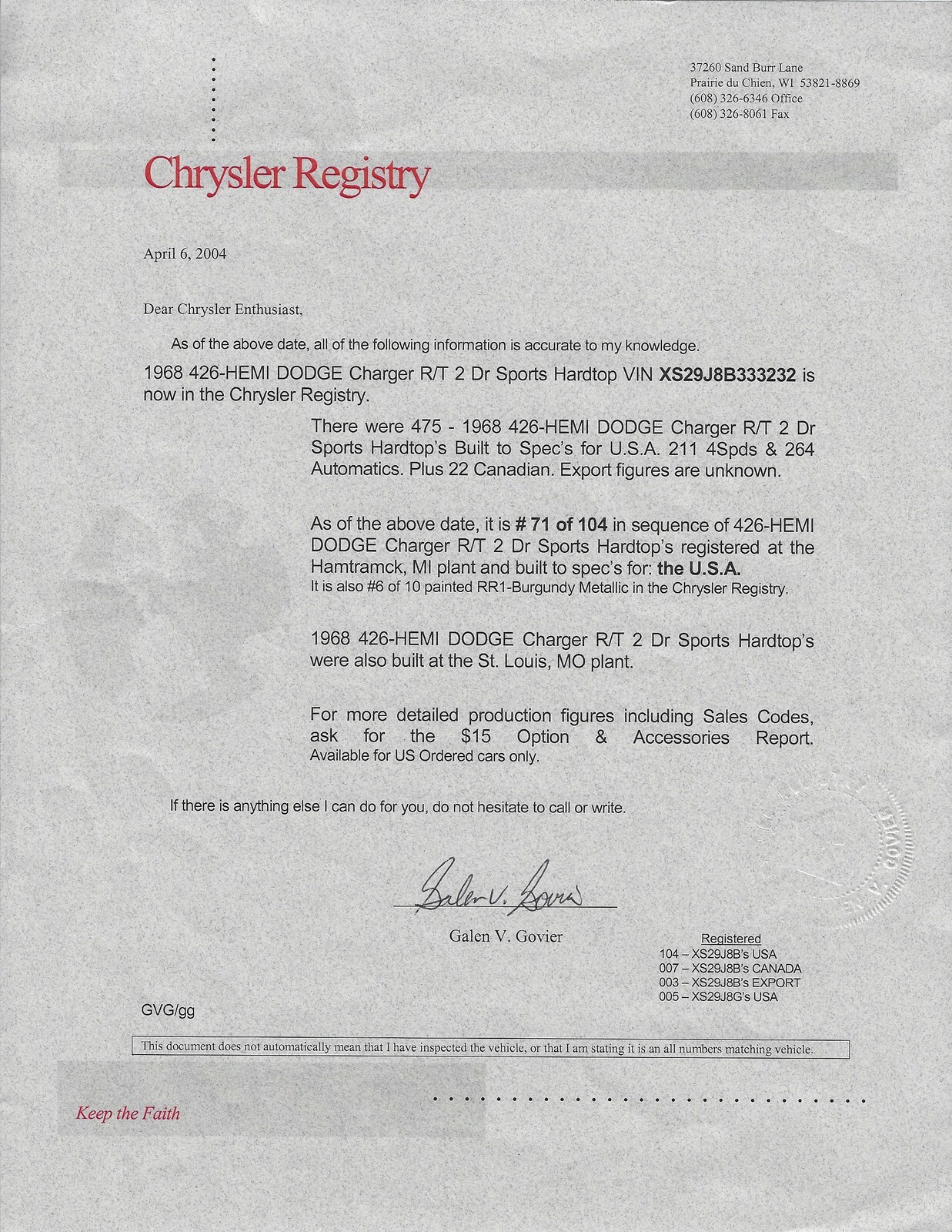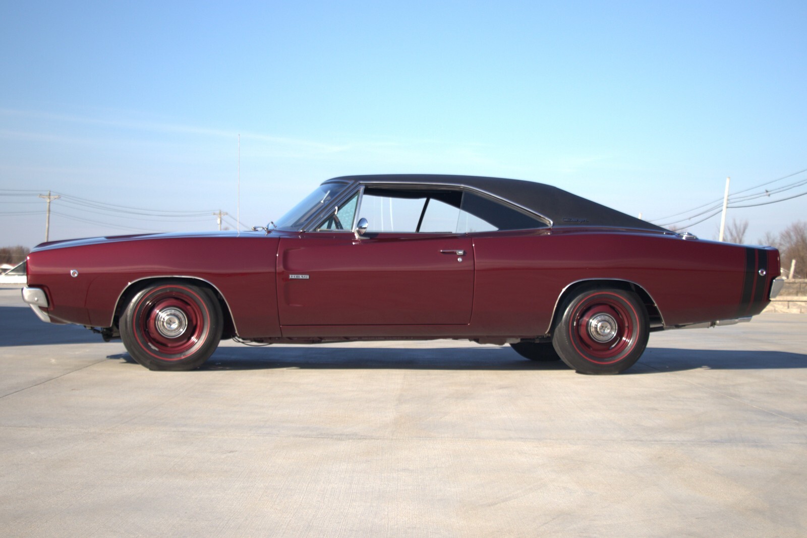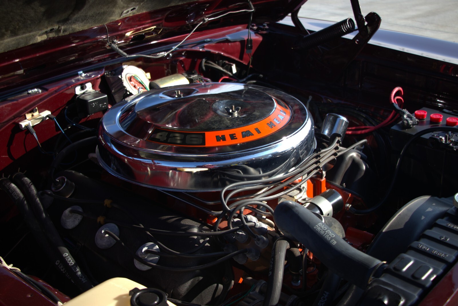 The SPECS:426 HemiBurgundy MetallicBlack Bumble Bee StripeFront Carb 4430SRear Carb 4432SDistributor 2785140 / IBS-4014AOE Radiator and ShroudChrome Air CleanerWrinkle-Finish Valve CoversTorqueFlite 3-Speed Automatic8 3/4 3.23 Sure GripPoints IgnitionF-70 15 Firestone Red LinesRear Window DefoggerRear SpeakerAM Stereo with 8-TrackTachometer and GaugesConsole with Floor ShiftHood-Mounted Turn SignalsHood Insulation3-Spoke Wood Grain WheelPower SteeringManual Drum BrakesOE Dual Exhaust with Chrome TipsTrunk MatCorrect Spare and Jack AssemblyTrunk LampDay / Night Rear View Mirror