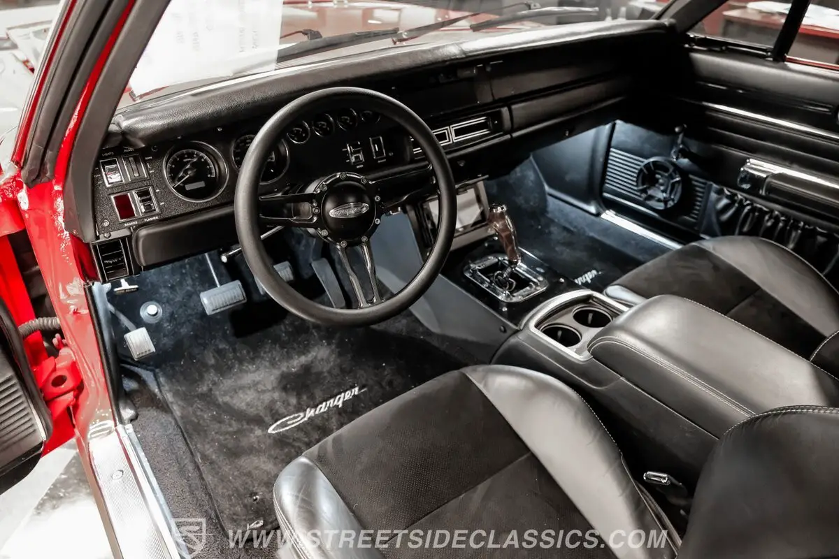 Slide into the interior and discover a blend of vintage character and modern luxury. Black leather SRT power front bucket seats and a matching rear bench provide exceptional comfort, while heated and cooled cupholders in the custom center console add a touch of convenience. The center console also houses the iconic Hurst pistol grip shifter, reinforcing the car's performance focused heritage. The Dakota digital gauges, Classic Auto Air A/C, and a Parrot touchscreen audio system with Bluetooth and backup camera integration ensure every drive is as enjoyable as it is stylish. The LED interior lighting, Budnik steering wheel, and factory style door panels complete a space designed for both comfort and performance.