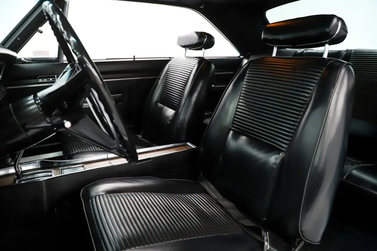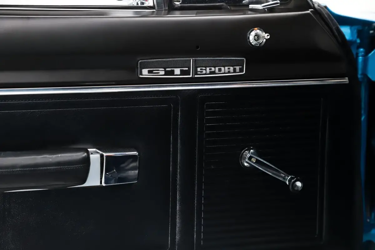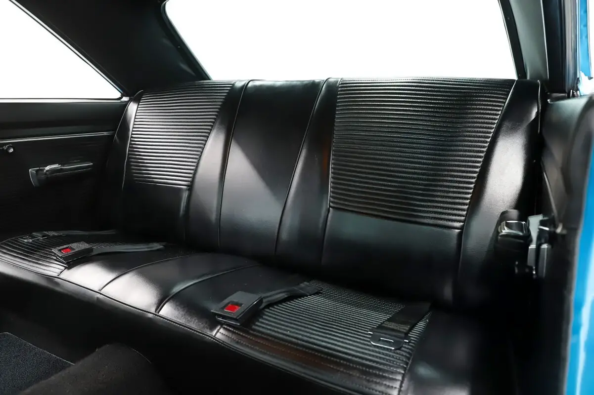 EXTERIOR: Beautiful! Great colors, no vinyl top and perfect choice of wheels. The body is amazing on this car. Every inch is laser beam straight. All the gaps are square and flush. There's no rust or damage at all. It has the GTS hood with dual bulges. Repainted it's original B5 blue color. It did not look this good when it was new! The metal flake is laid out evenly and the clear coat is polished to a glass finish. The white bumblebee stripe really pops. The bumpers were rechromed. The emblems and trim all sparkle. New correct antenna, working fender turn signals. Very good original blacked out grill and tail panel. The rear glass is new with correct Mopar logo. Weather strips were replaced. New reproduction redline tires on painted rims with poverty caps.