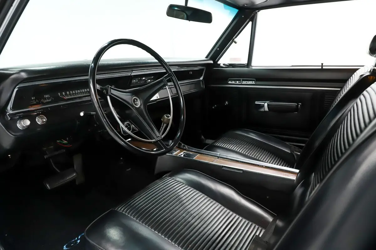 ENGINE COMPARTMENT: Show quality to factory specs. Correct dated 383 big block. All stock intake, air cleaner and valve covers. Upgraded with headers and a dual feed Holley carb with electric choke. Every component looks like new. Everything is neatly installed. Correct hose clamps, radiator cap and a reproduction Mopar battery. The engine bay is clean metal painted real slick. The fender tag is attached and the VIN on the core support matches the car.