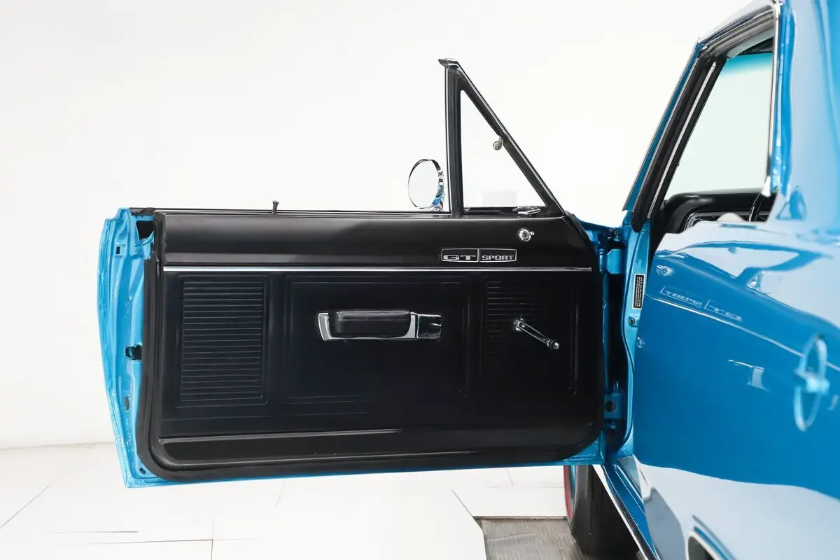 EXTERIOR: Beautiful! Great colors, no vinyl top and perfect choice of wheels. The body is amazing on this car. Every inch is laser beam straight. All the gaps are square and flush. There's no rust or damage at all. It has the GTS hood with dual bulges. Repainted it's original B5 blue color. It did not look this good when it was new! The metal flake is laid out evenly and the