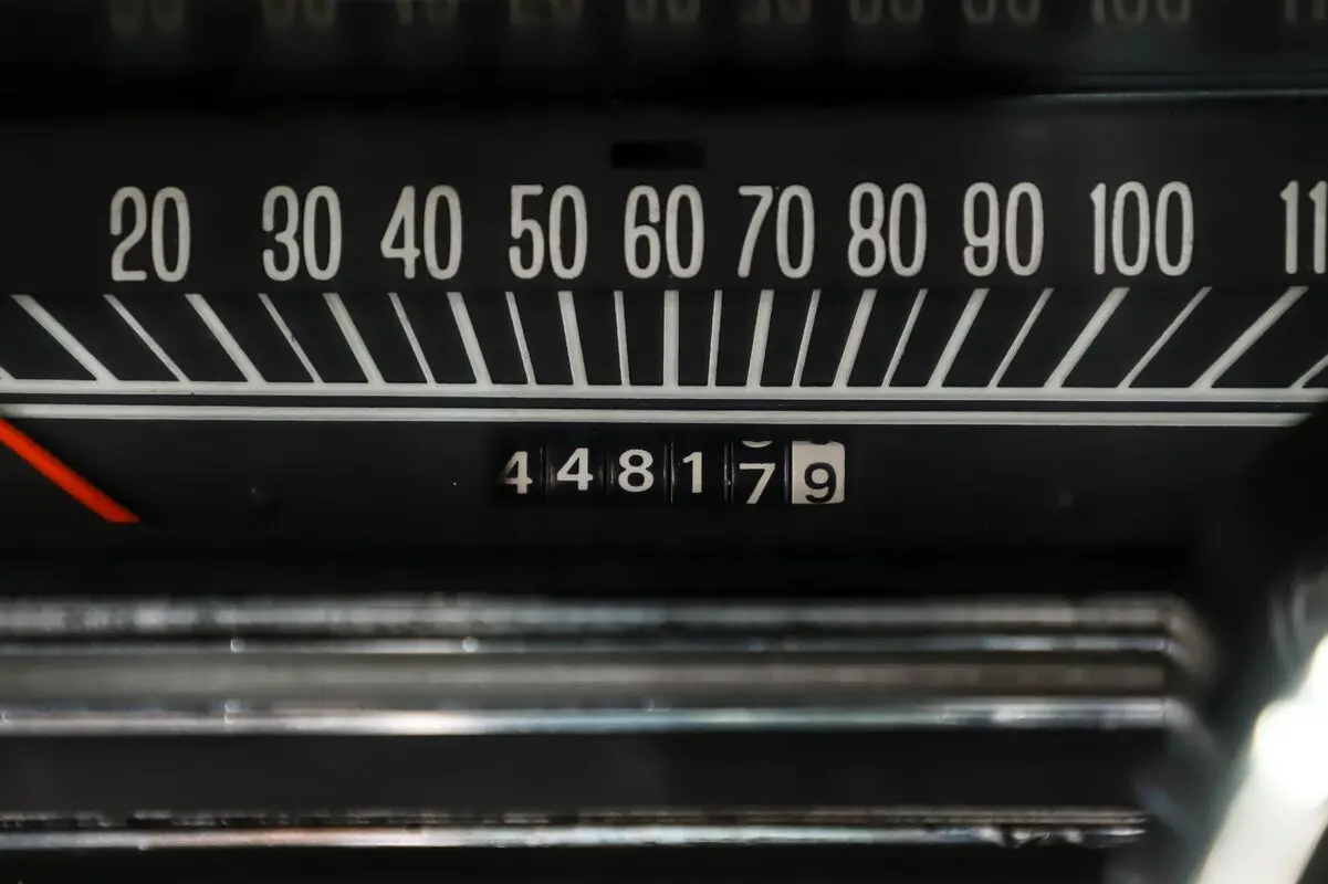 INTERIOR: This interior is said to be all original and in outstanding condition! The front bucket seats and rear bench seat are still very comfortable and look great but have a couple minor imperfections. The center console and remote mirror are very nice factory options. It has a $1,000 vintage Sun Super tachometer on the column. It also has a vintage 8-track player that the previous spent a bundle rebuilding. There are currently 44,818 original miles on the odometer. The carpet, headliner, sun visors, and door panels are all in great shape too. The dome light even works.