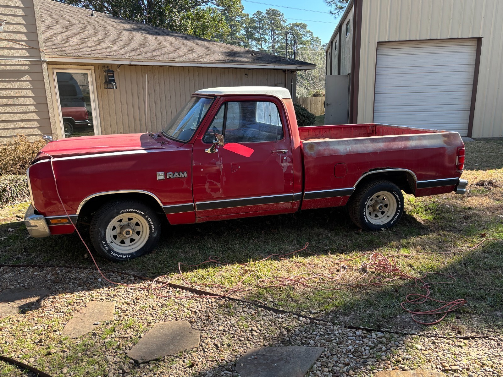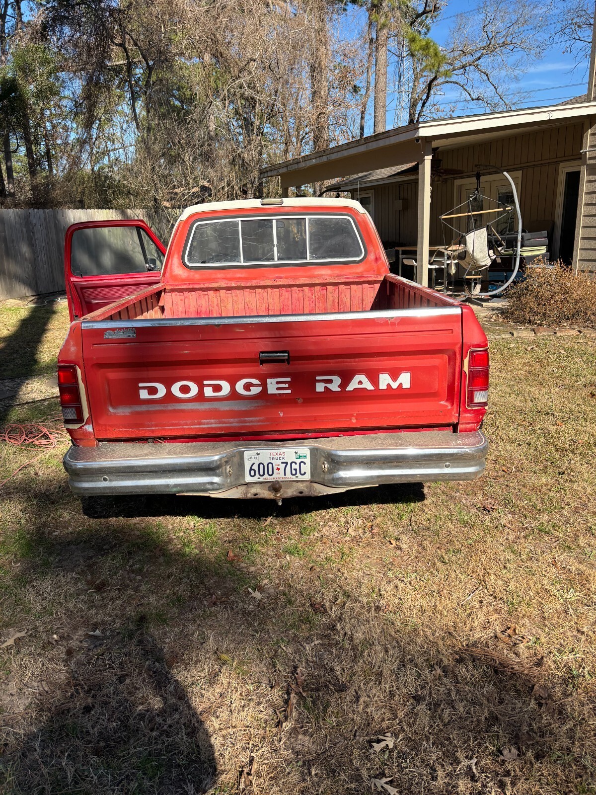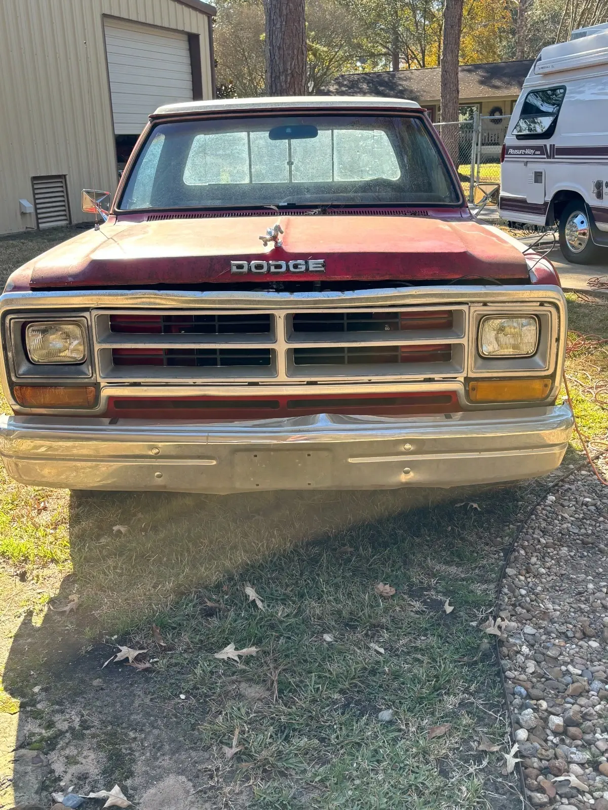 This 1987 Dodge Shortbed pickup will make a good base for your truck project. Has some rust in the fender panels, which is fairly common. Turns over, but currently doesn't start (it did a few weeks ago, suspect carburator is clogged). You will need to tow it away unless you can get it started. New set of tires.