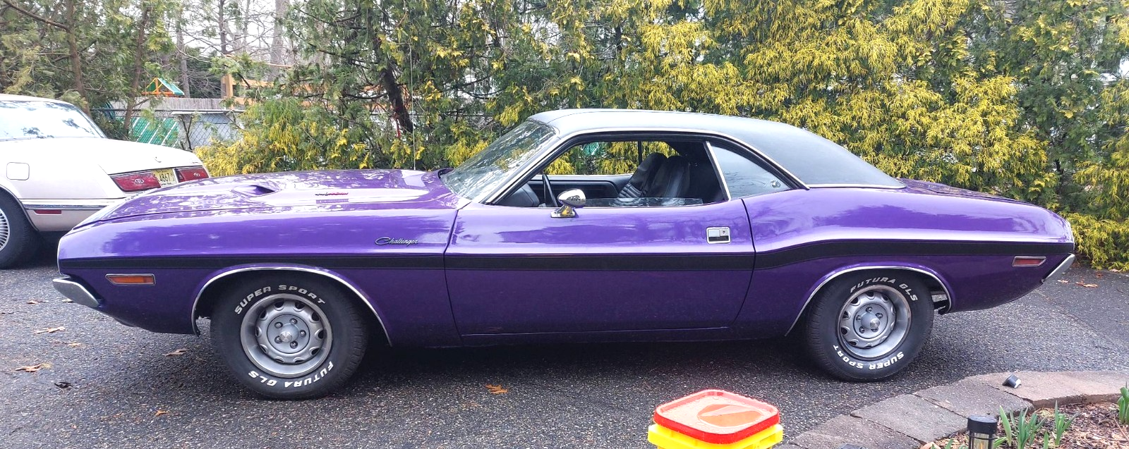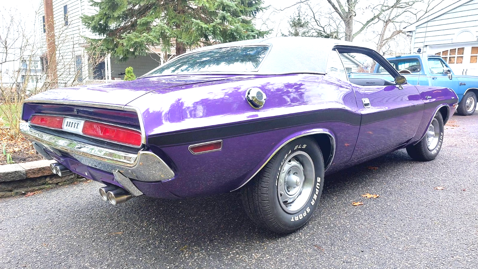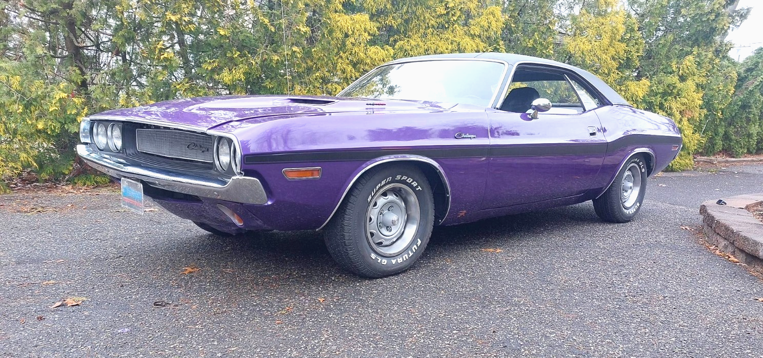 I AM OFFERING THIS CHALLENGER THAT HAS BEEN IN RESTORATION FOR OVER TWO YEARS JUST IN TIME FOR CRUIZES ..THERE IS ALOT TO GO OVER SO I WILL DO MY BEST SHE IS JUST OUT OF THE BODY PAINT SHOP AND HAS BEEN SANDED TO BARE METAL.THE ORIGINAL COLOR WAS B5 BLUE AND INTERIOR AS WELL.. SHE STILL HAS 90% ORIGINAL SHEET METAL WITH A NEW SPORT HOOD AND TRUNK LID ADDED.NEW FLOORS AND TRUNK FLOOR WERE WELDED IN AND SEALED. ALL THE FRAME MEMBERS ORIGINAL AND SOLID.. ALL THE TRIM WAS REMOVED AND EITHER REPLACED OR RESTORED..SHE WAS GIVEN MULTIPLE COATS OF EPOXY PRIMER,BLOCK SANDED AND GIVEN THE FIRST REPAINT OF BASE COAT CLEAR COAT FC7 CHRYSLER PLUM CRAZY AND AS YOU CAN SEE IN THE PICS,CRAZY BEAUTIFUL. THE ORIGINAL 318 IS LONG GONE AND NOW SPORTS A BUILT 440 BACKED UP WITH 727 AUTOMATIC TRANSMISSION WITH CUSTOM WELDED DUAL EXHAUST THROUGH STAINLESS TIPS ALOT OF FUN TO DRIVE AND REALLY TURNS HEADS...COMPLETE RESTORATION INCLUDES NEW BRAKES ALL ARROUND NEW SUPER SPORT 2157014 TIRES ON RALLY WHEELS ..FRONT END WAS CHECK AND ALIGNMENT DONE WHEN THE TIRES WERE PUT ON . THE INTERIOR WAS GONE OVER WITH LEGIONDARY BUCKET SEAT COVERS NEW CARPET HEADLINER AND DASH..I BELEIVE THE CAR ORIGINALY CAME WITH BENCH SEAT AND COLUMN SHIFT NOW SPORTS AN ORIGINAL AND RESTORED CONSOLE WITH SLAP STICK SHIFTER ..SHE IS ALOT OF FUN TO DRIVE! I HAVE DISCRIBED THIS CAR AS BEST POSSIBLE AND HOPE THE PICTURES HELP WITH CONDITION- FOR 56 YEARS OLD SHE IS A REALLY NICE DRIVER AND WOULD STILL LOOK GOOD NEXT TO THOSE PUT PUT TRAILER QUEENS.AS WITH VEHICLES THIS AGE,THERE IS NO WARRANTEE EITHER EXPRESSED OR IMPLIED...PLEASE ASK ALL QUESTIONS BEFORE YOUR BID OR OFFER TO BUY..